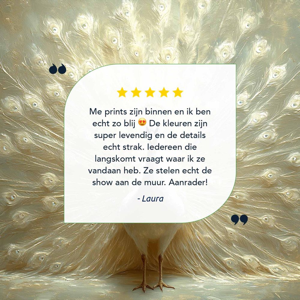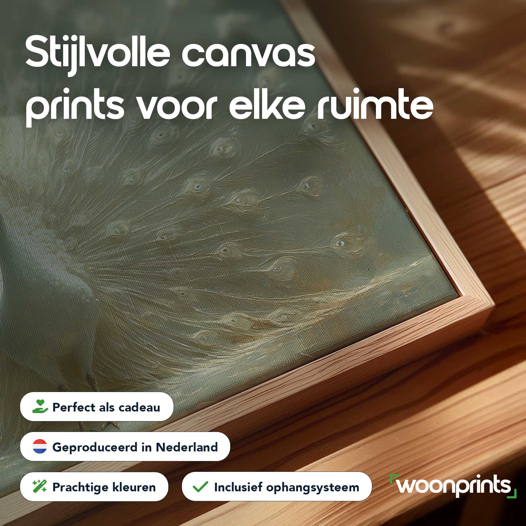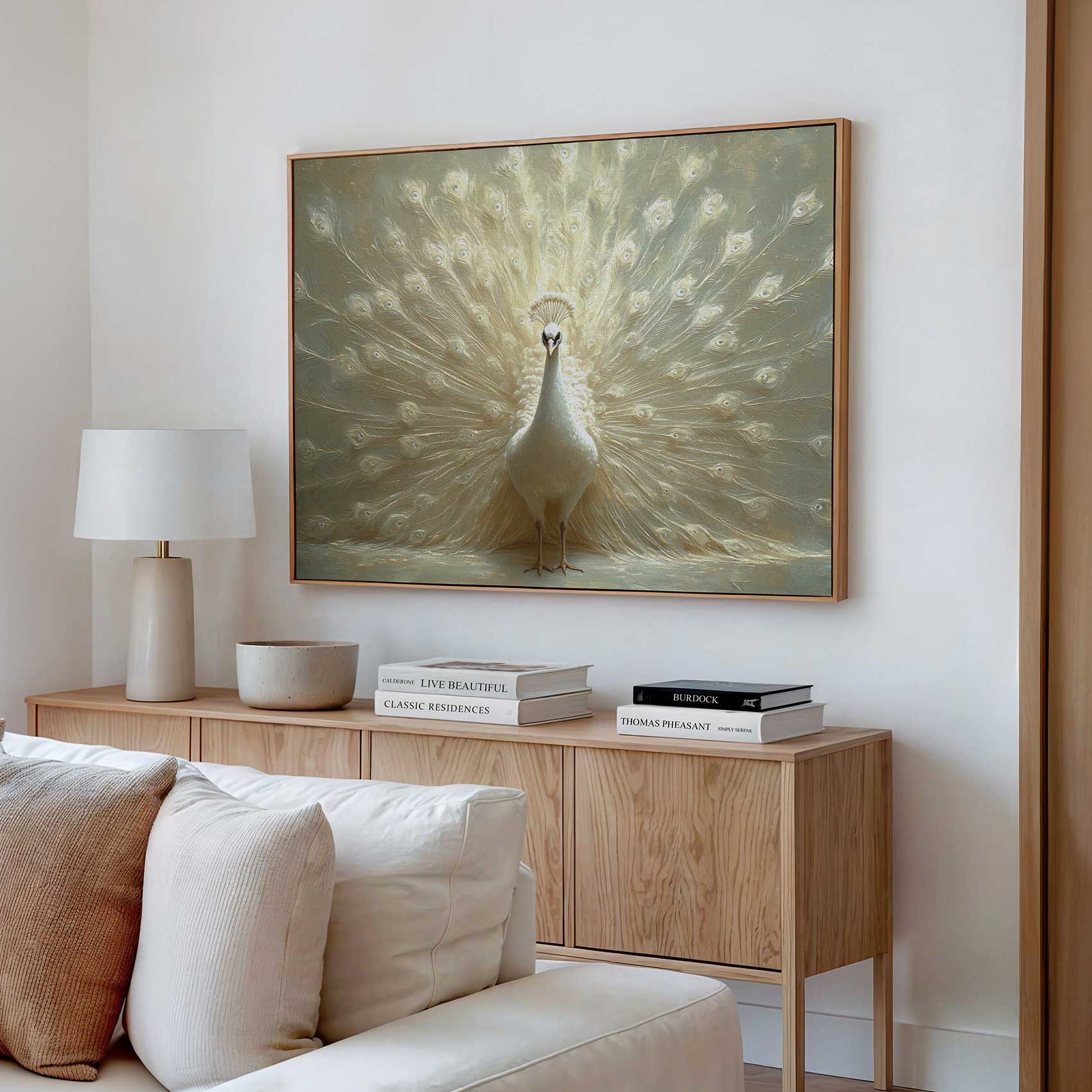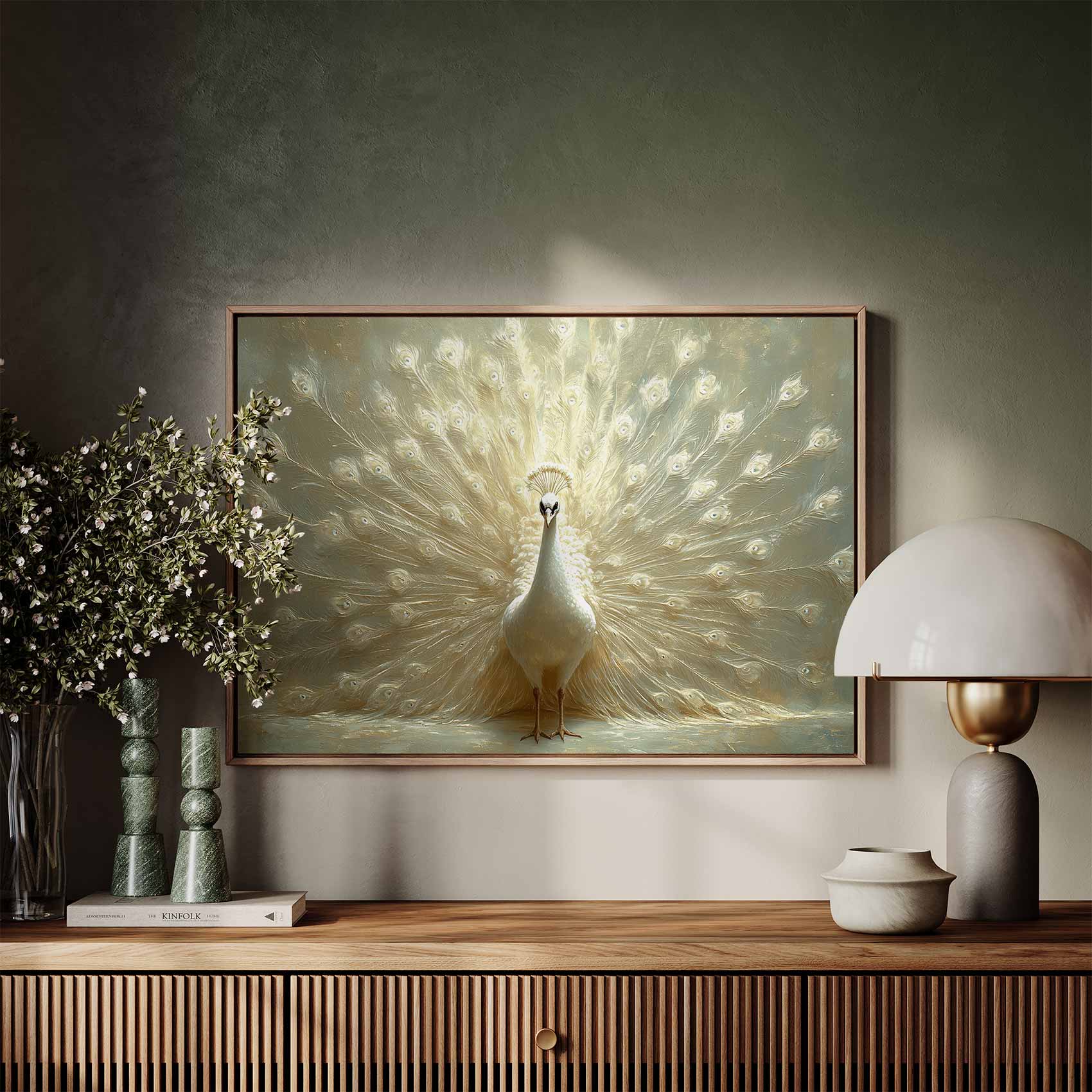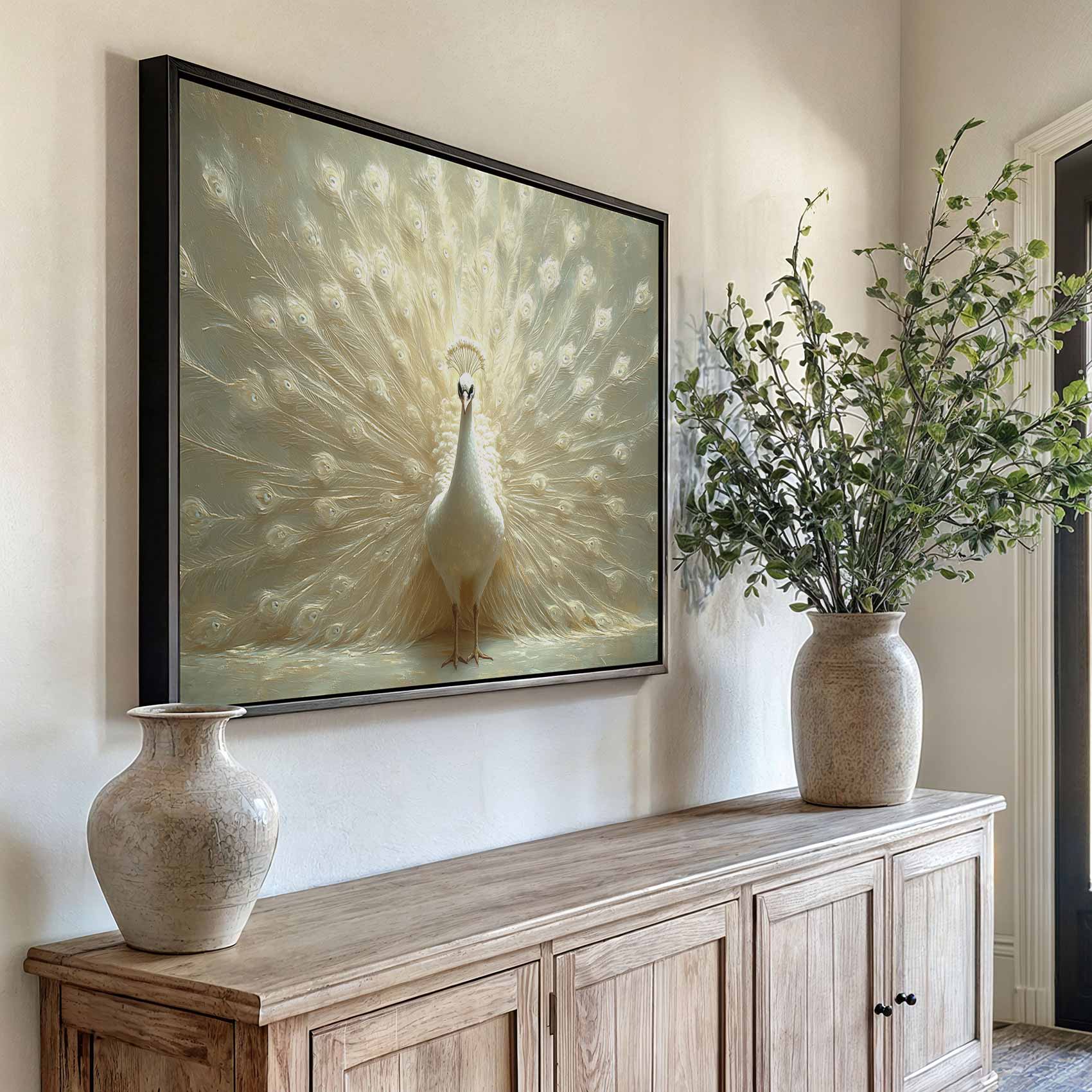 Terug naar collectie / Schilderijen / Dieren Schilderij / Witte pauw met prachtige veren