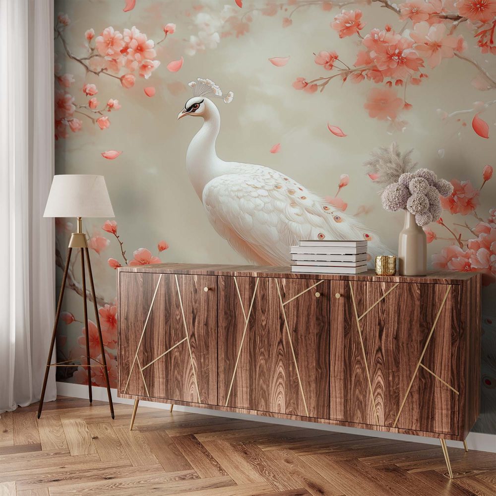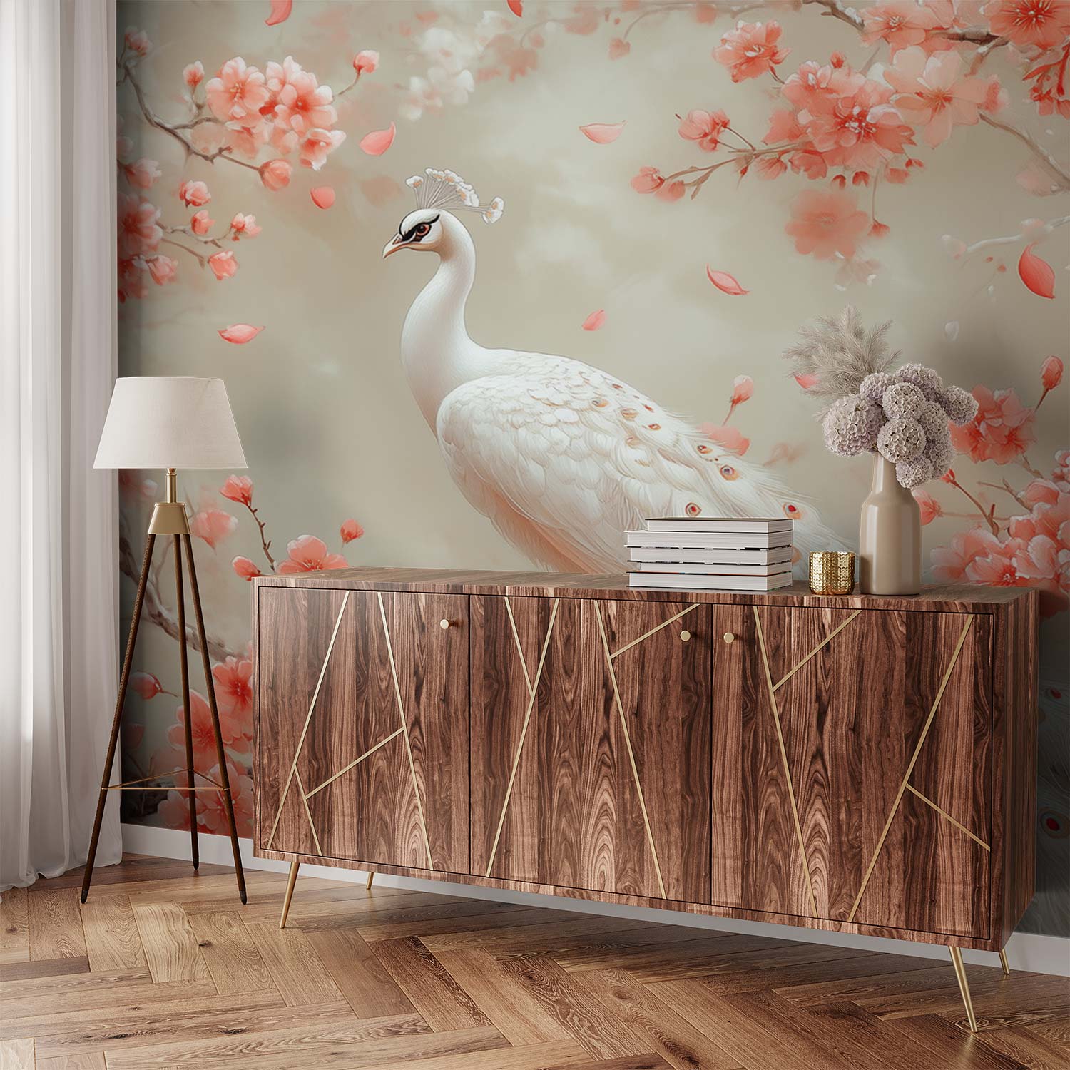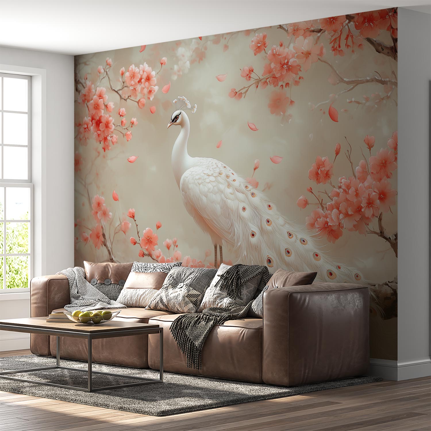 Terug naar collectie / Behang / Witte pauw met roze bloemen behang