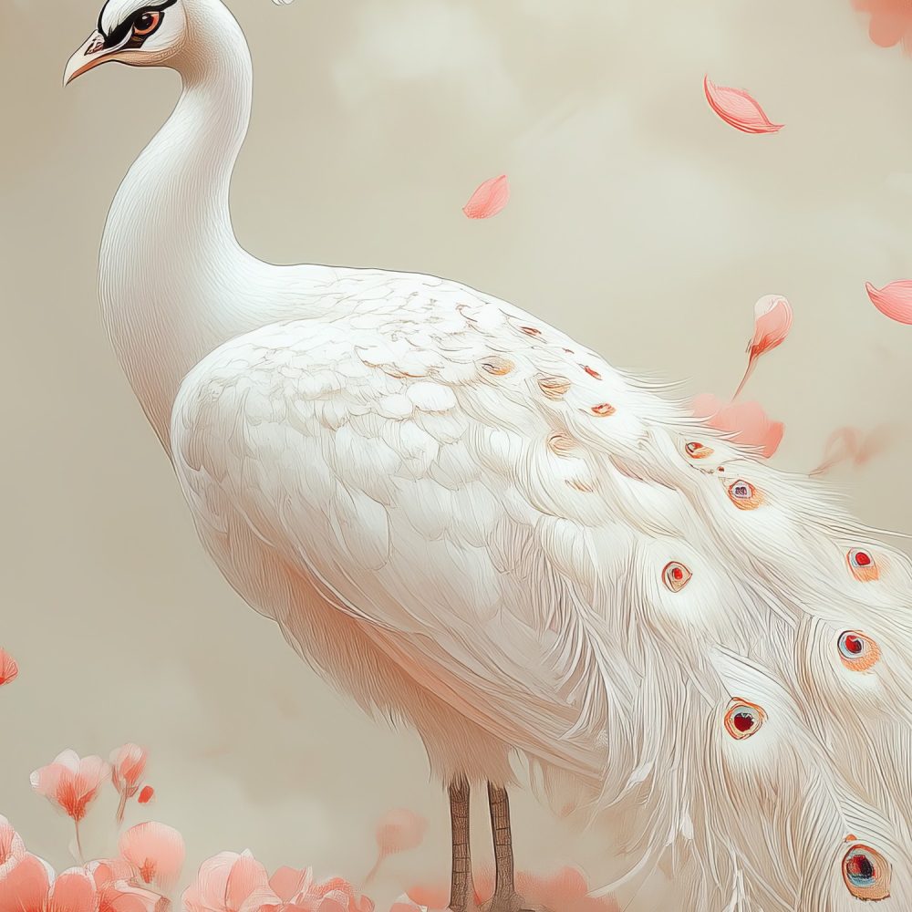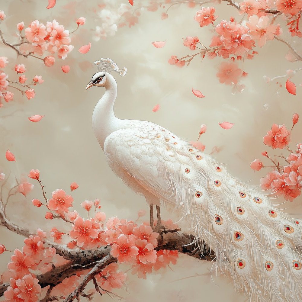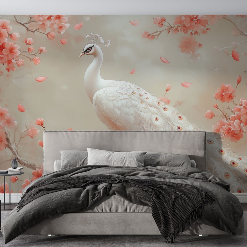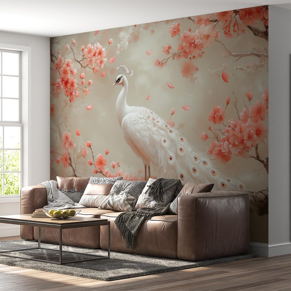 Terug naar collectie / Behang / Witte pauw met roze bloemen behang