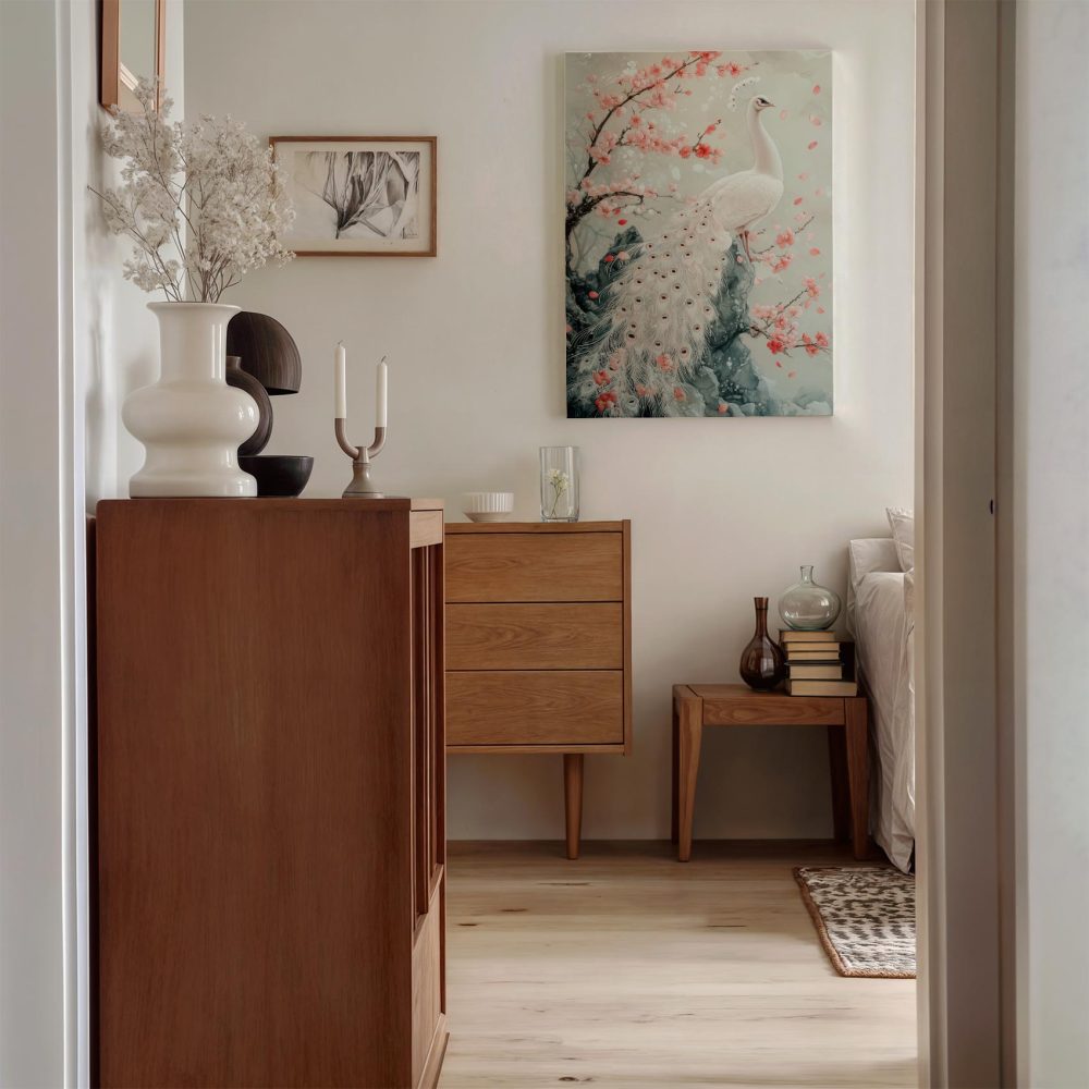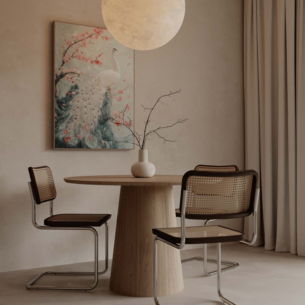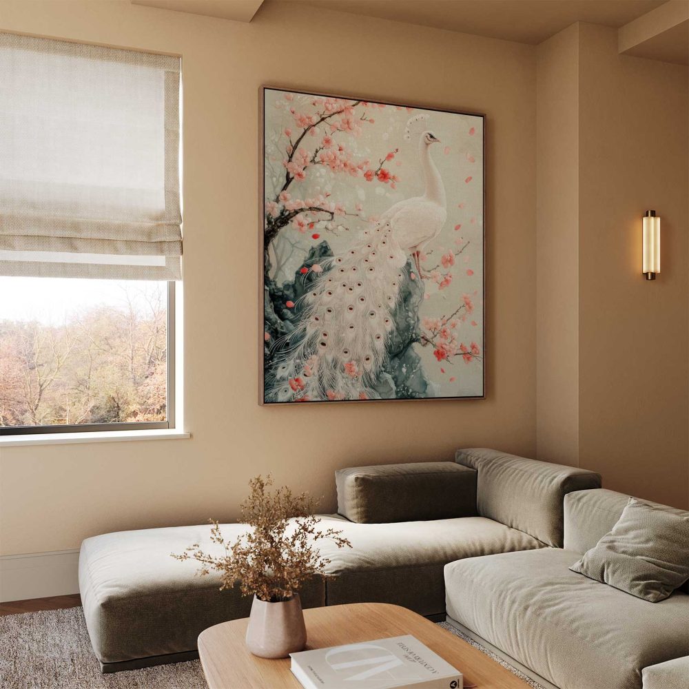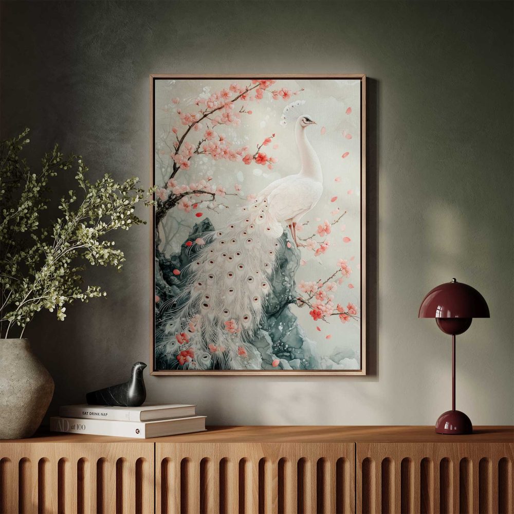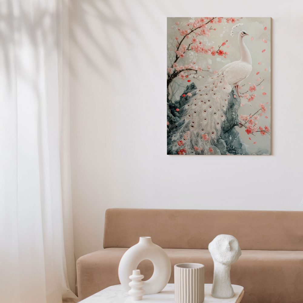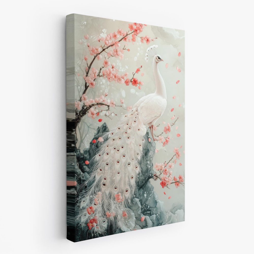 Terug naar collectie / Schilderijen / Bloemen Schilderij / Witte pauw met roze bloemen