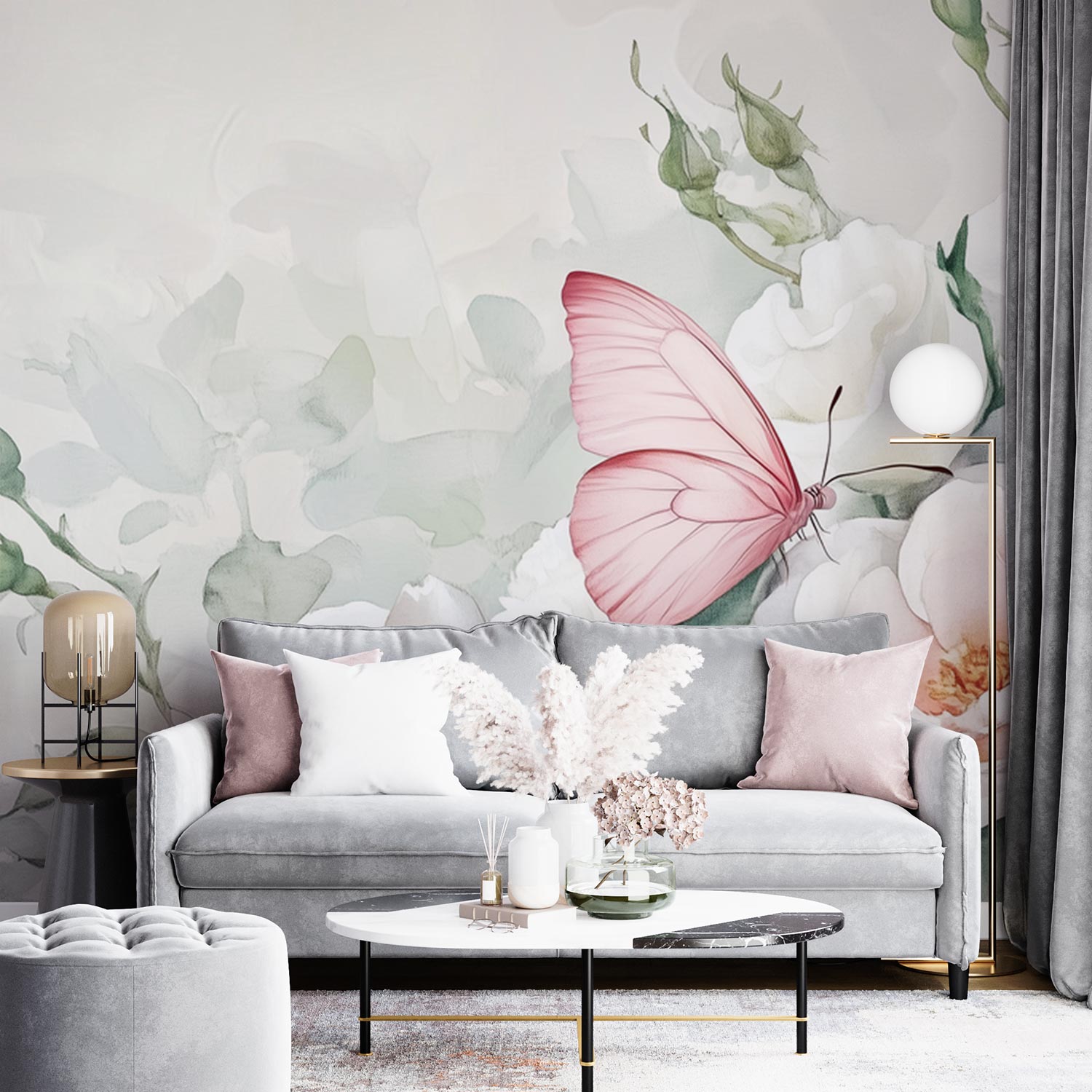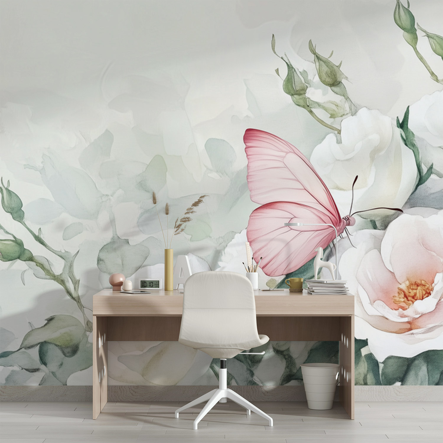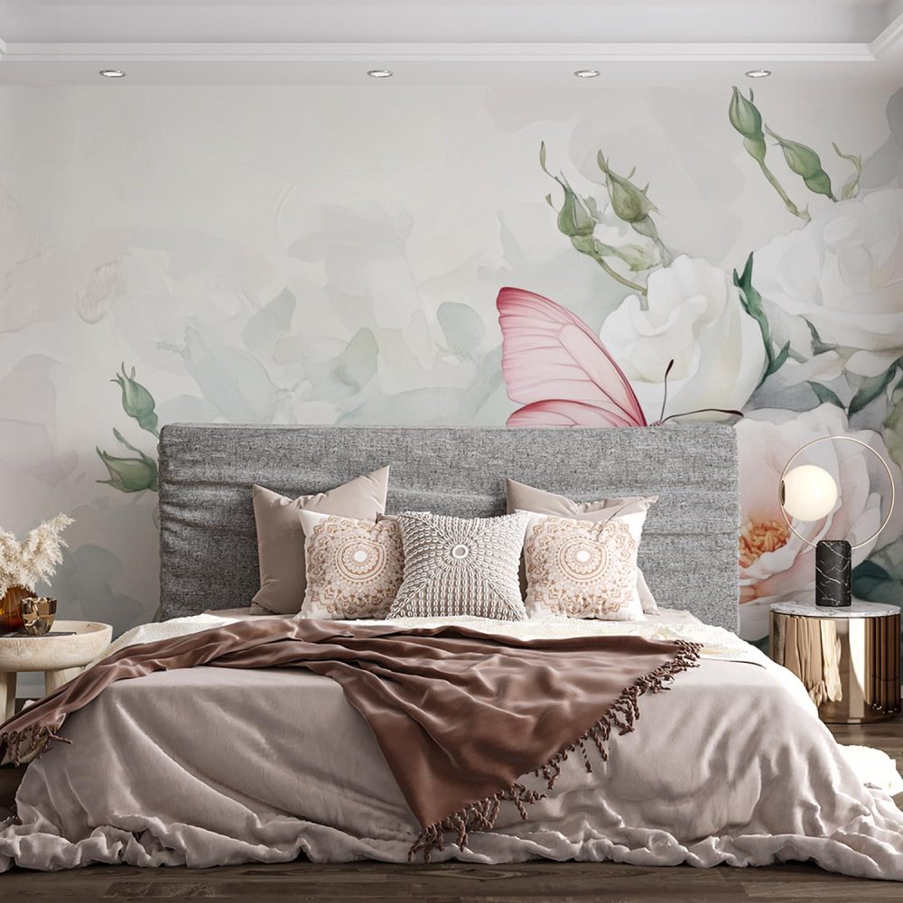 Terug naar collectie / Behang / Witte Rozen Met Vlinder behang
