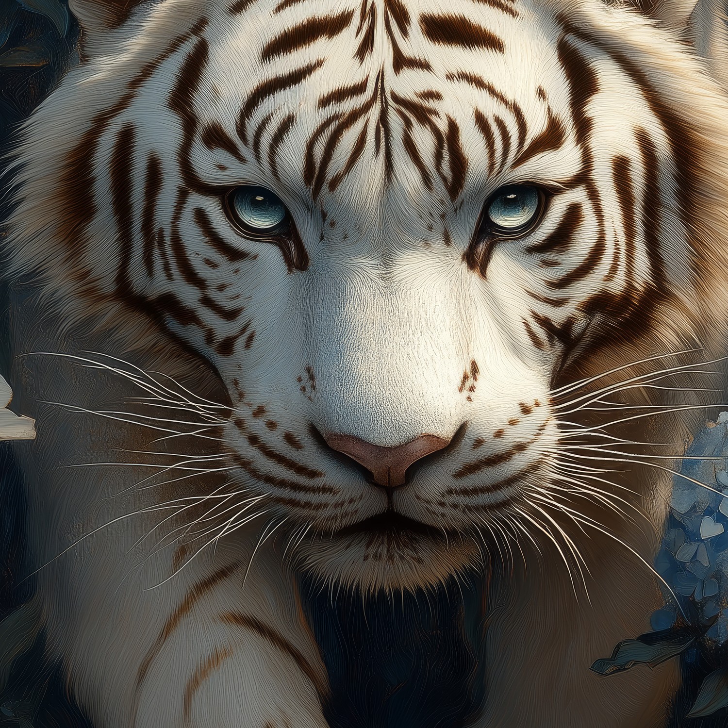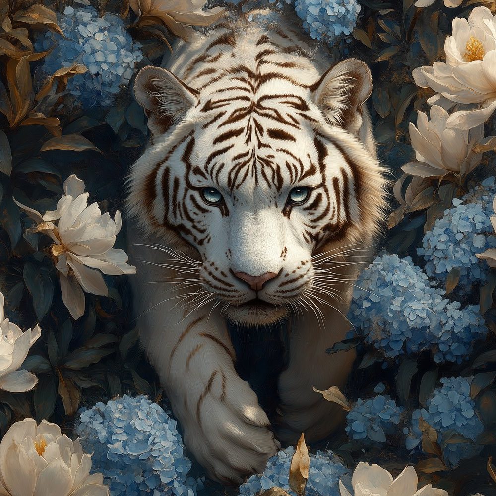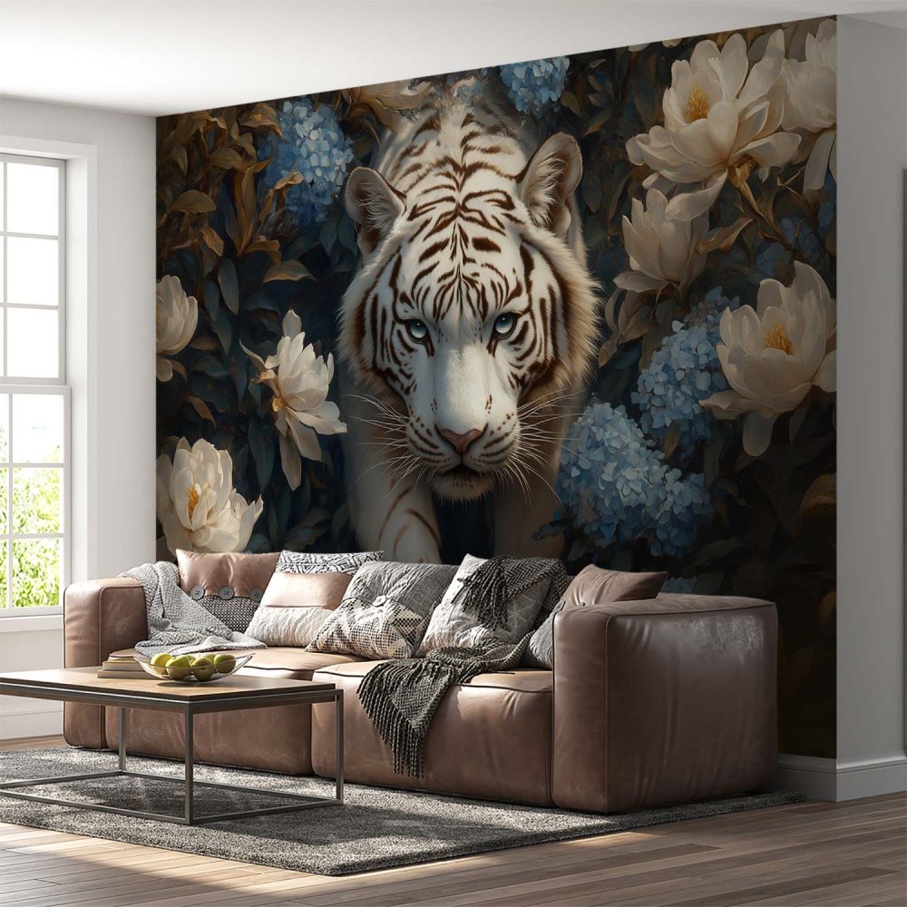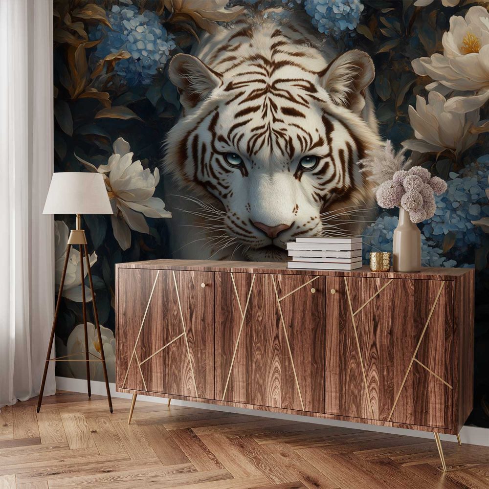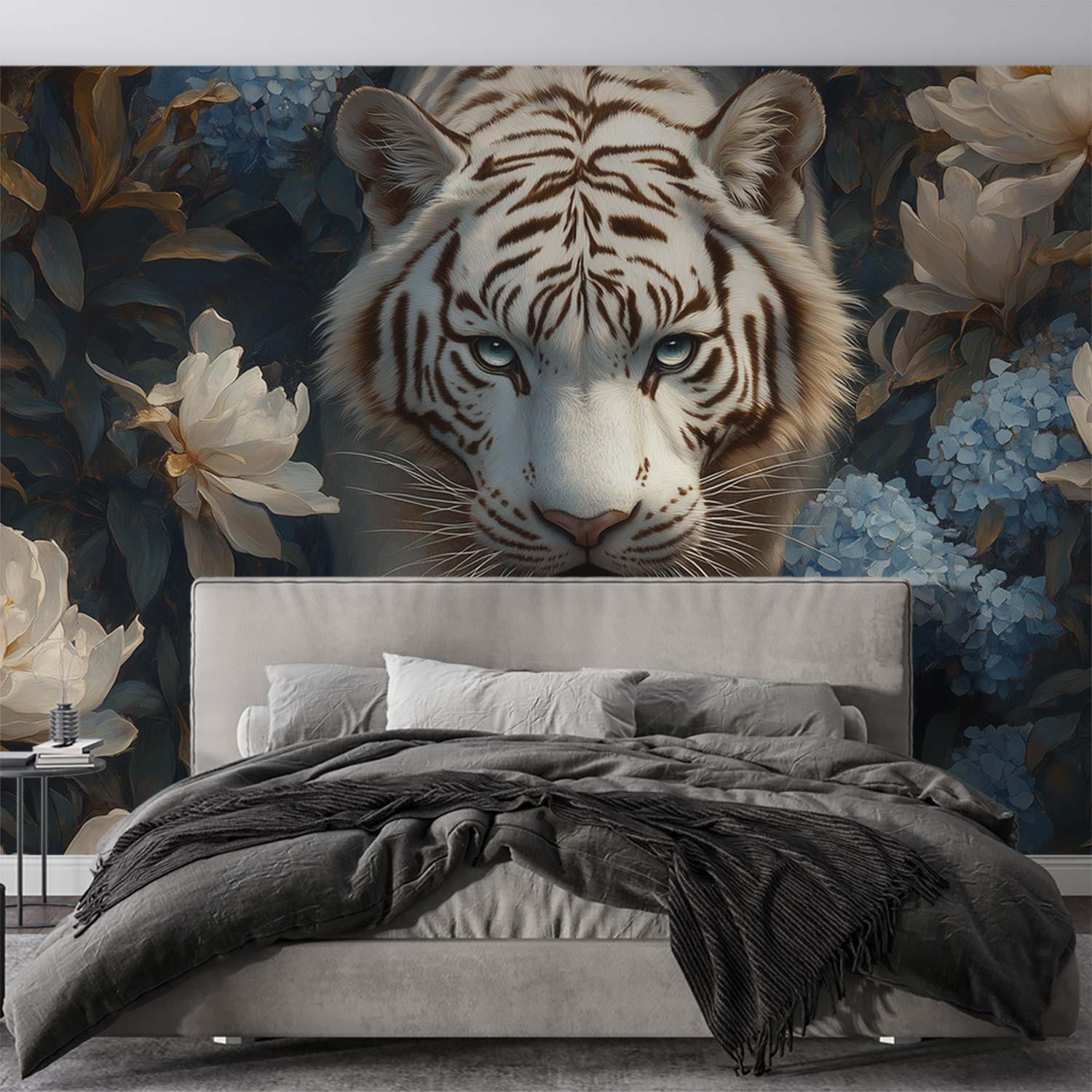 Terug naar collectie / Behang / Witte tijger tussen blauwe bloemen behang