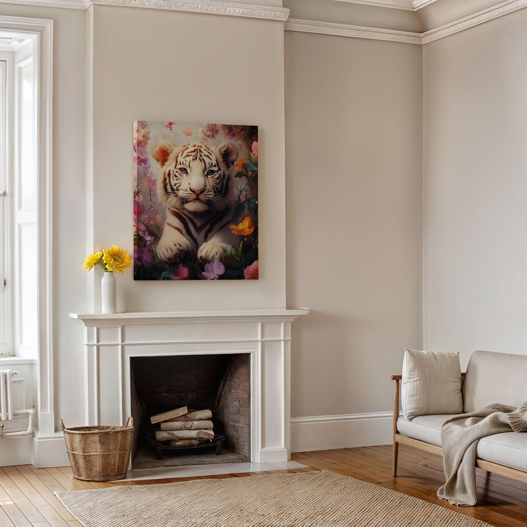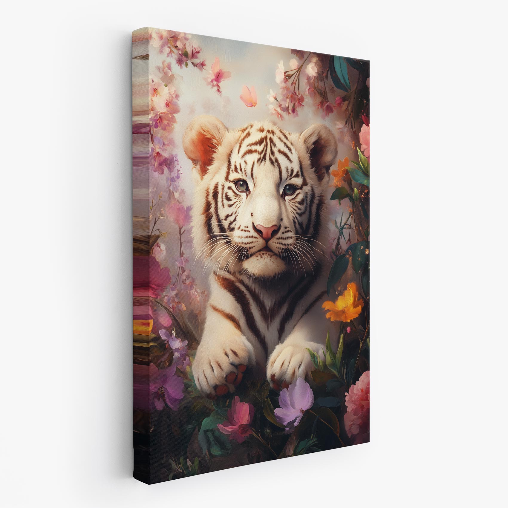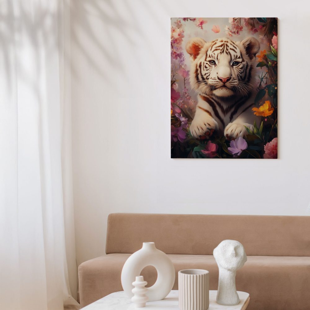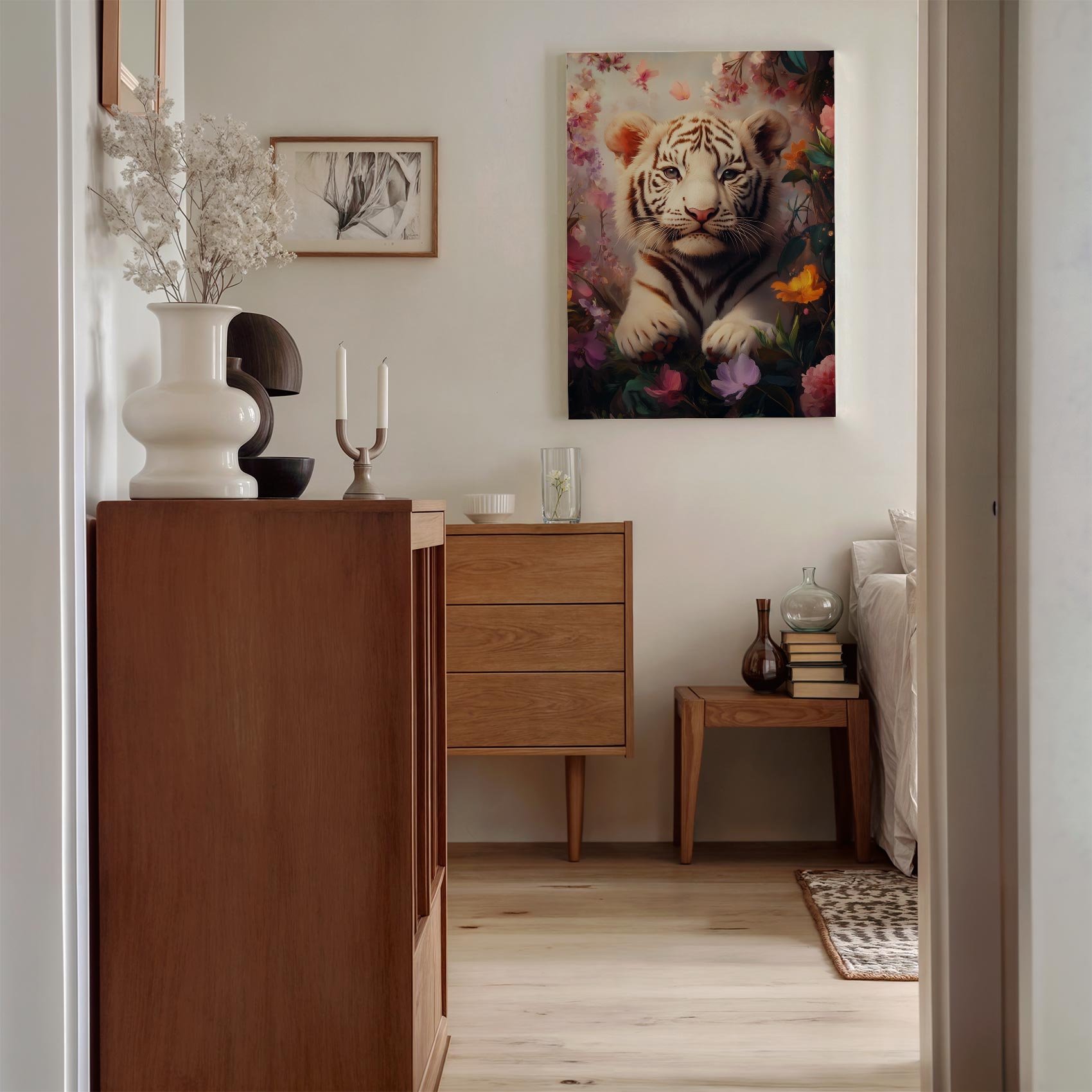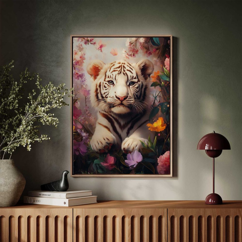 Terug naar collectie / Schilderijen / Bloemen Schilderij / Witte tijger tussen bloemenpracht