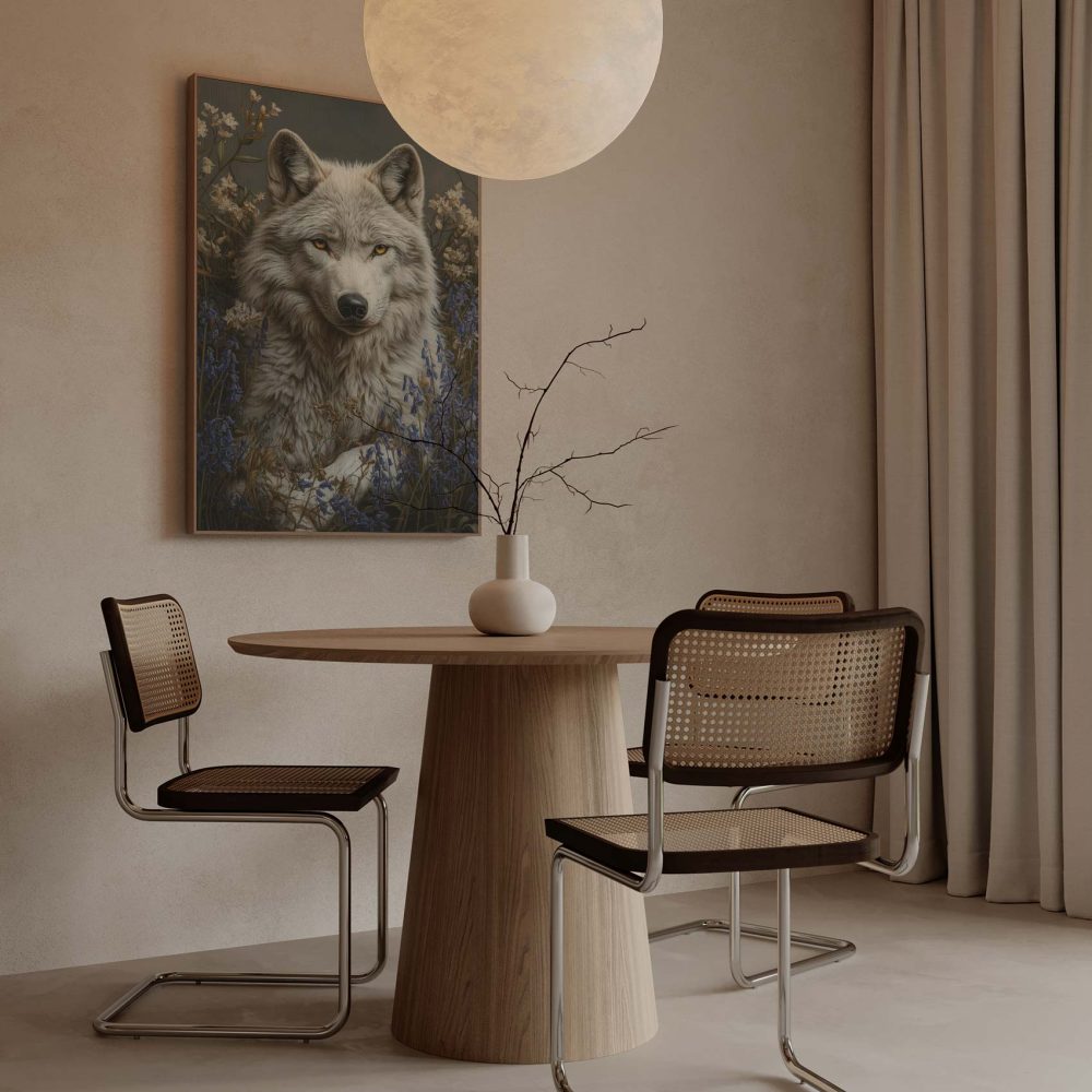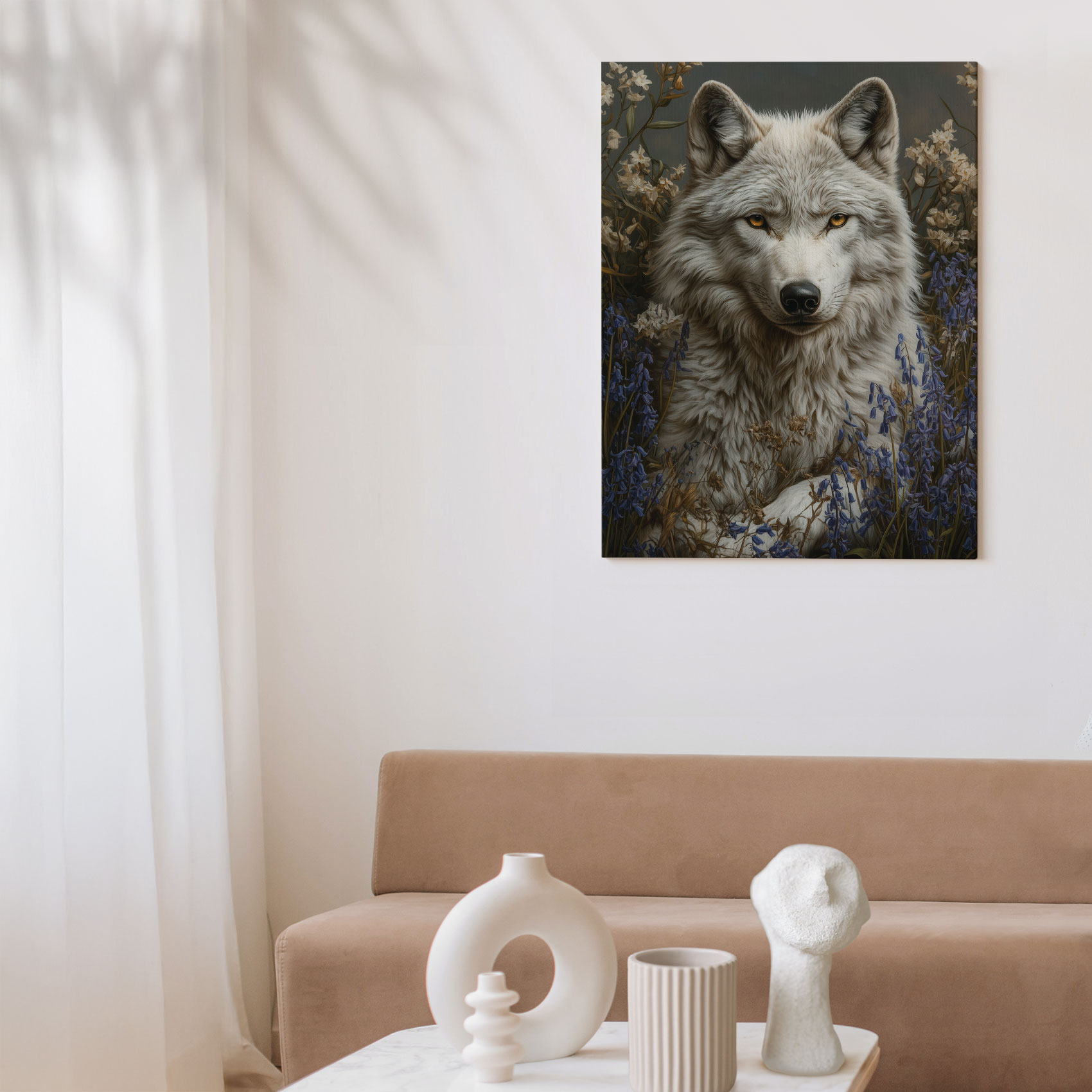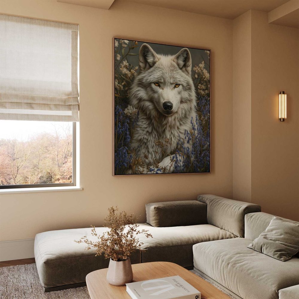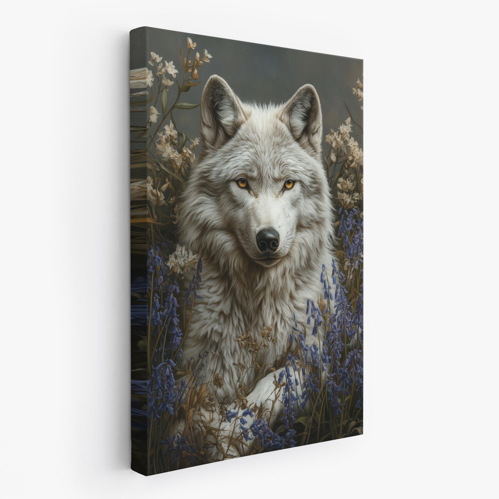 Terug naar collectie / Schilderijen / Bloemen Schilderij / Witte wolf in blauwe bloemen
