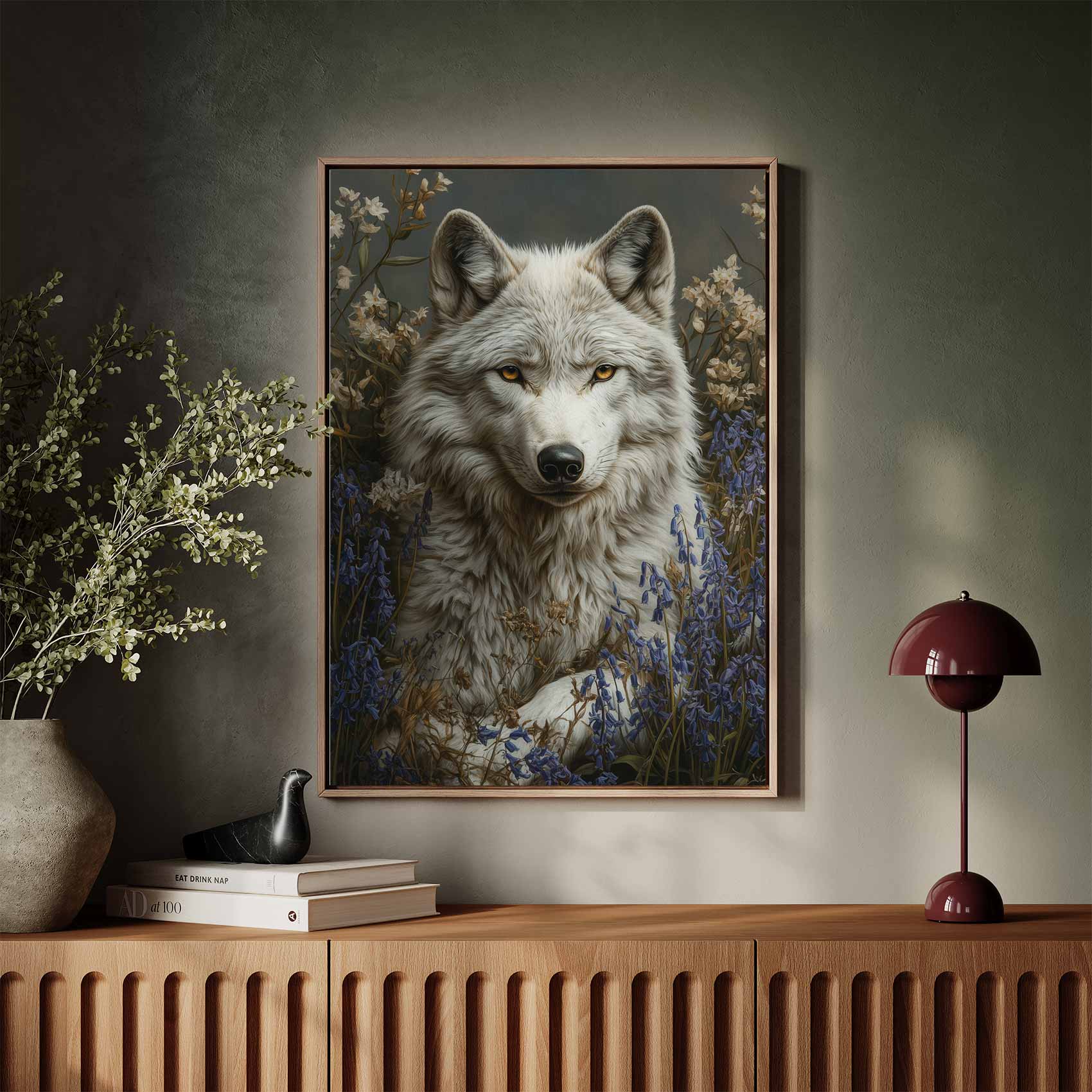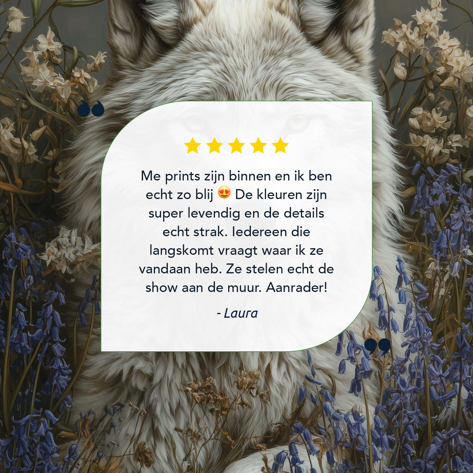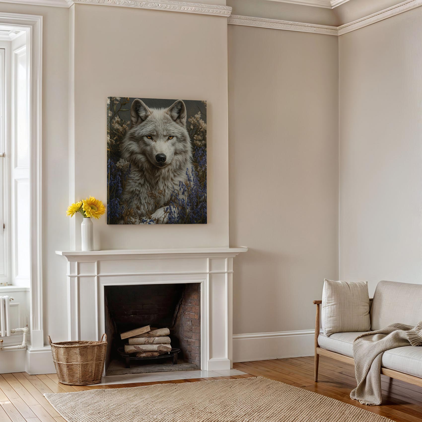 Terug naar collectie / Schilderijen / Bloemen Schilderij / Witte wolf in blauwe bloemen