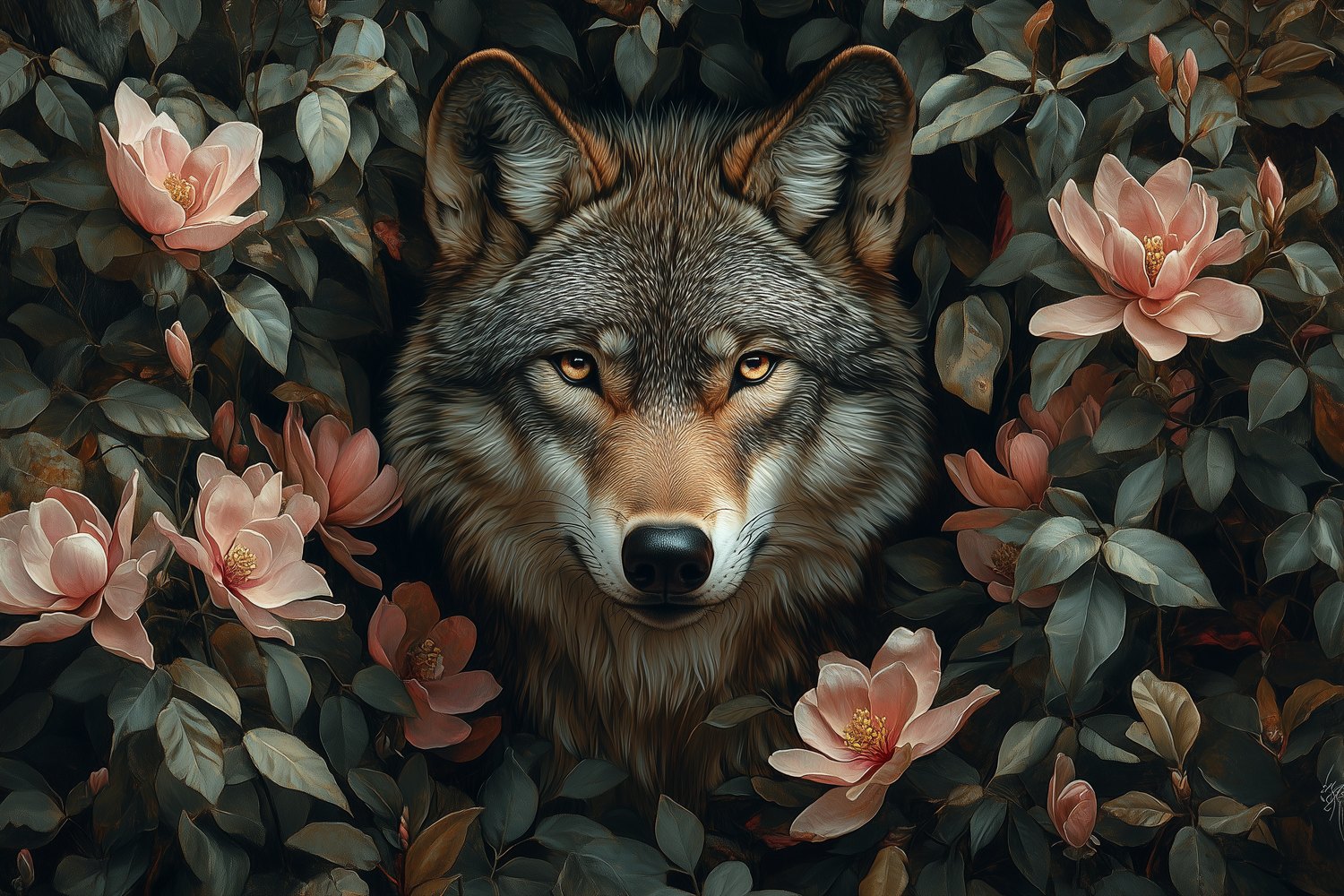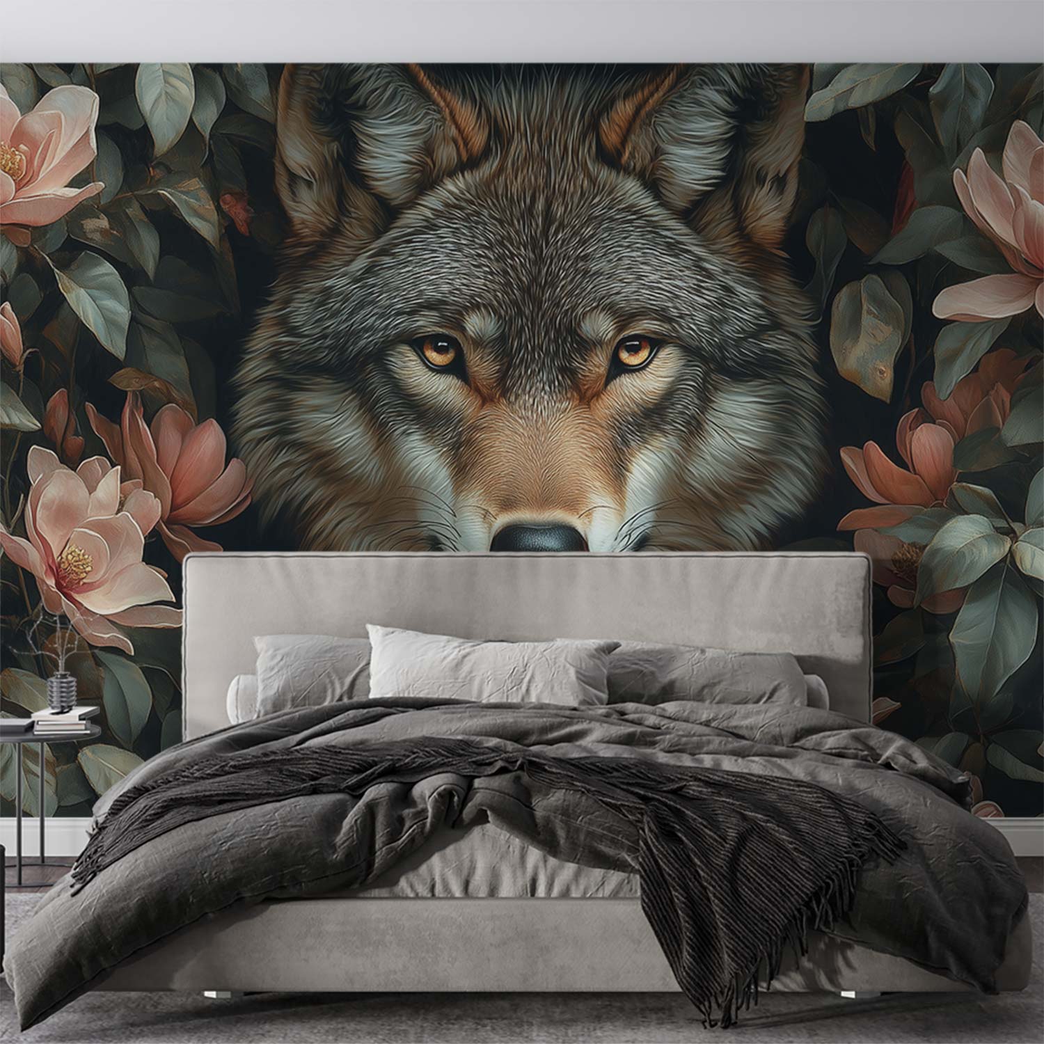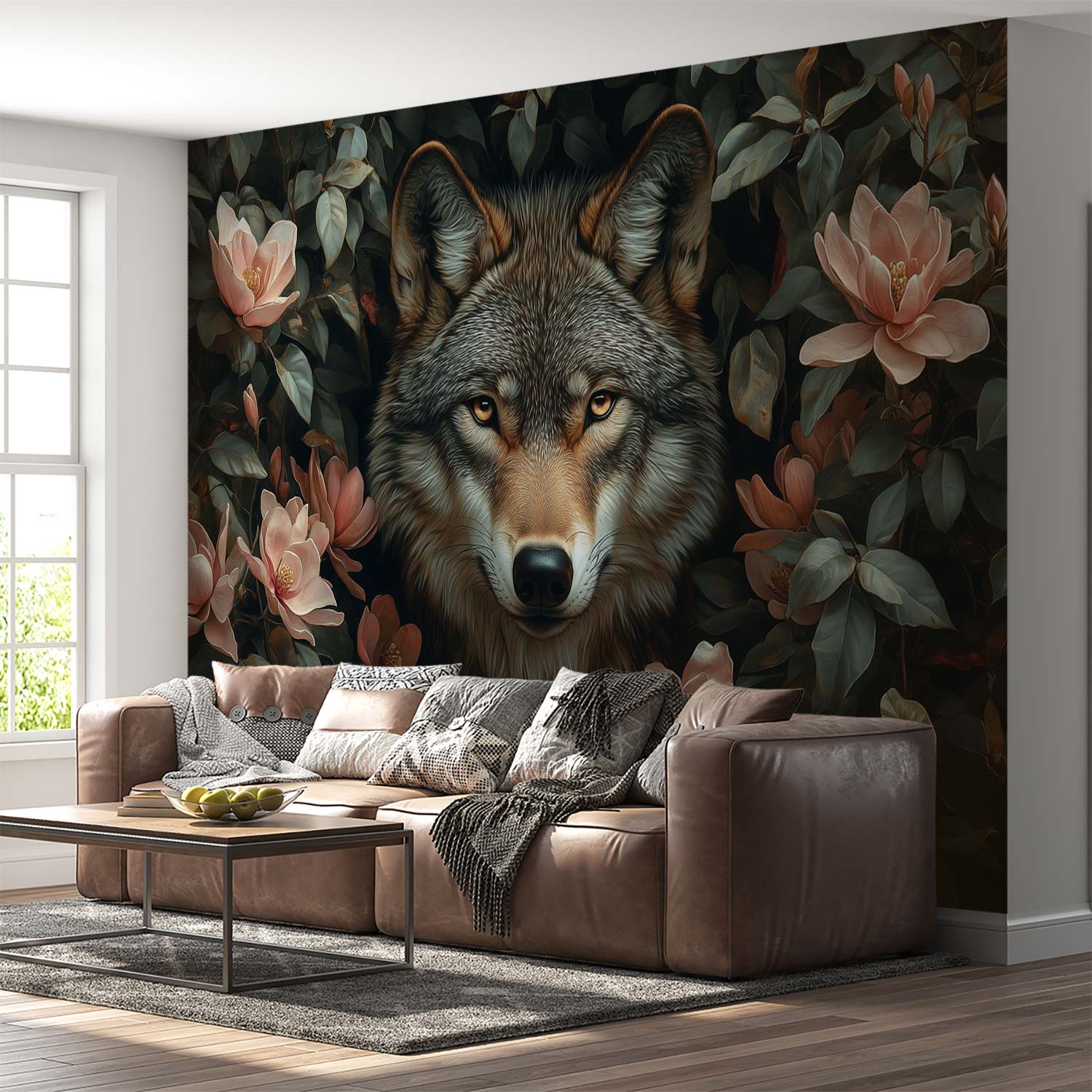 Terug naar collectie / Behang / Wolf tussen roze bloemen behang
