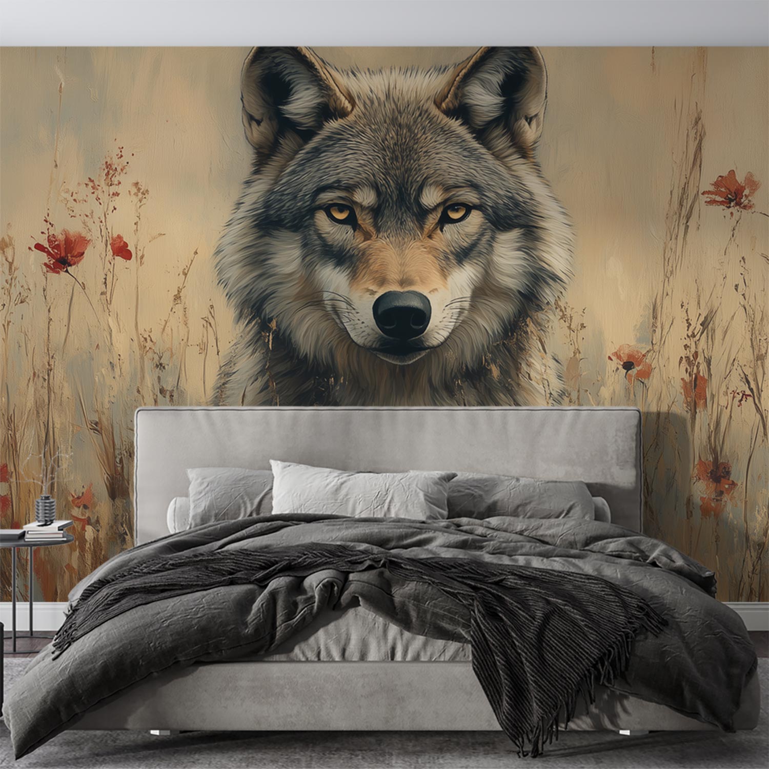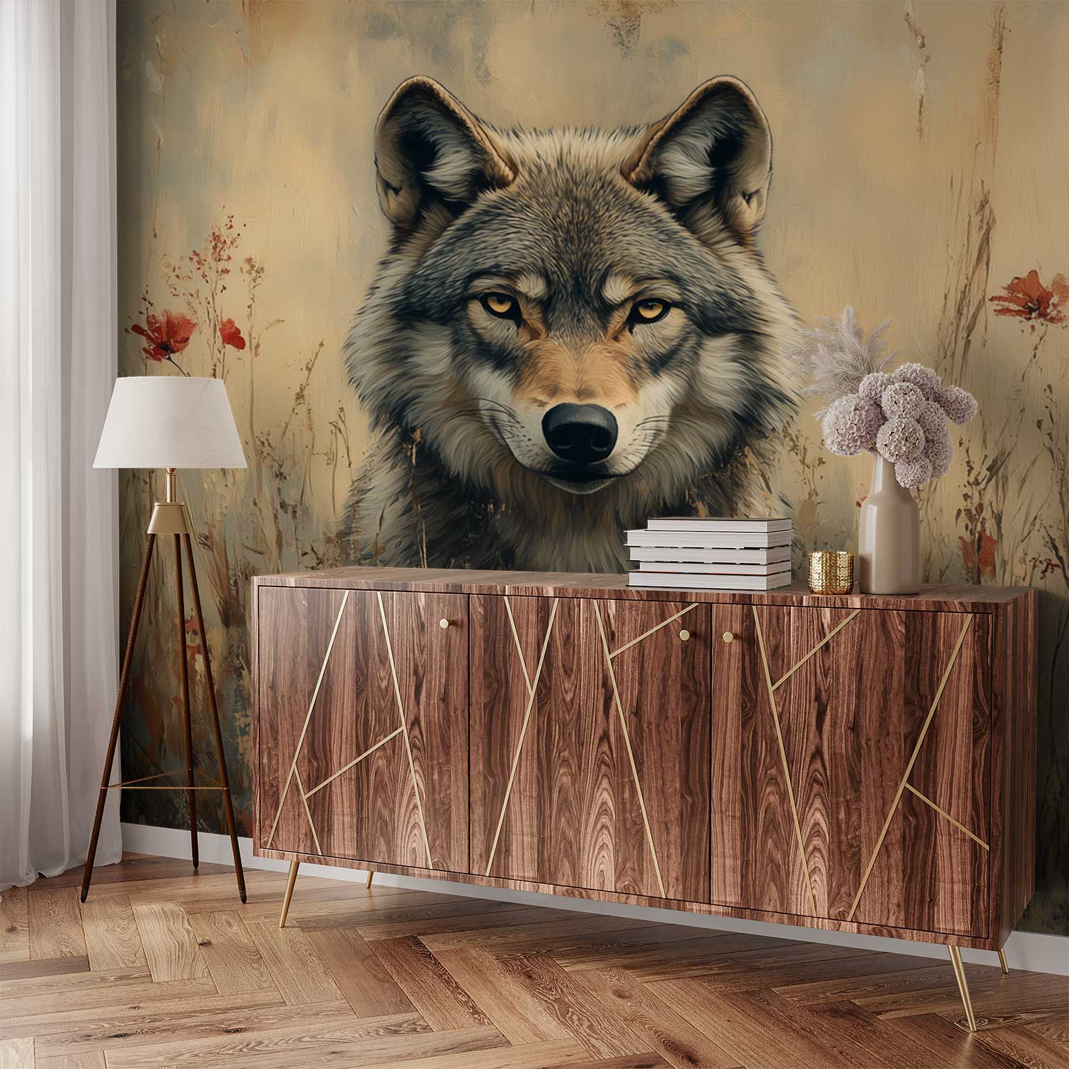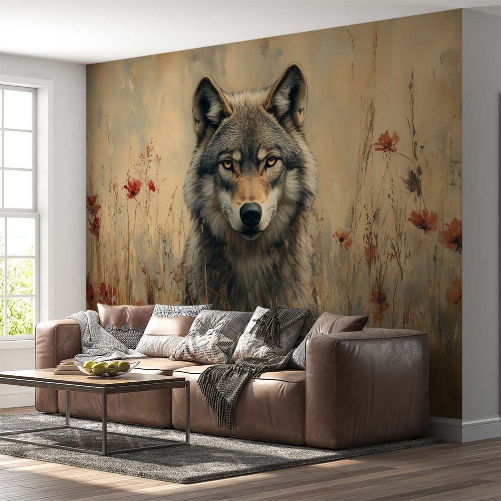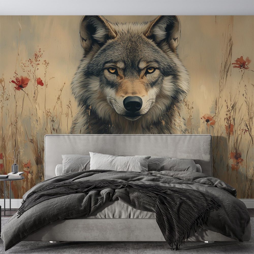 Wolvenportret met rode bloemen behang