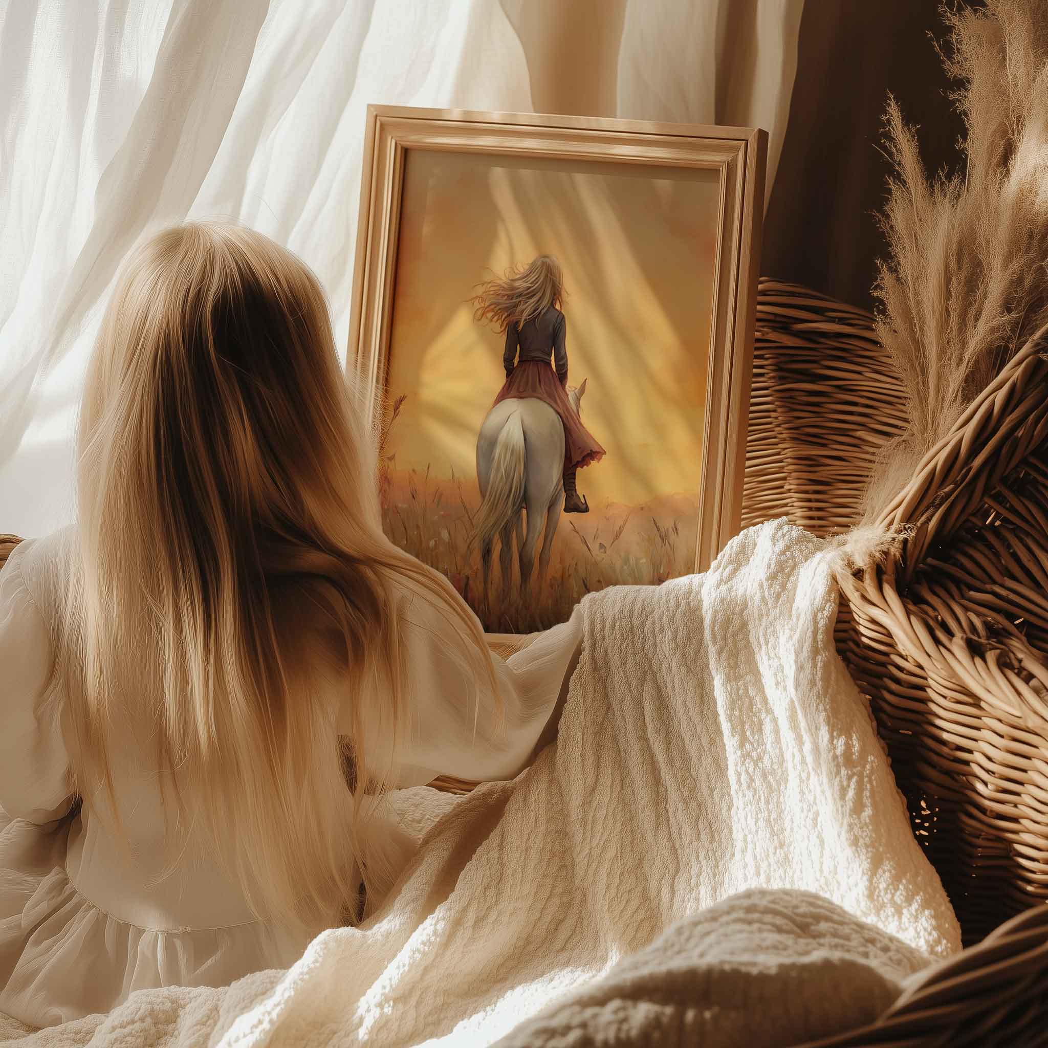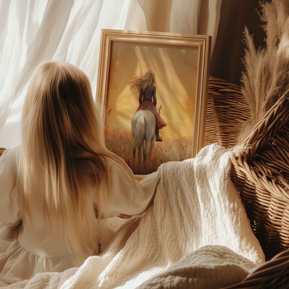 Terug naar collectie / Uncategorized / Zacht Droomlandschap met Vrouw en Witte Paard