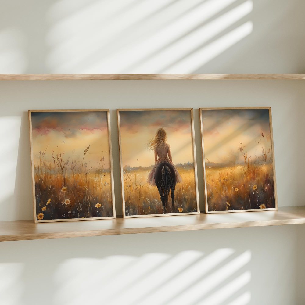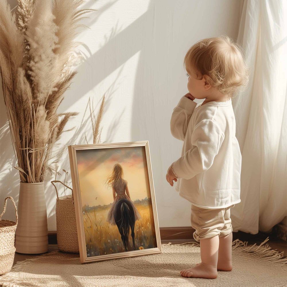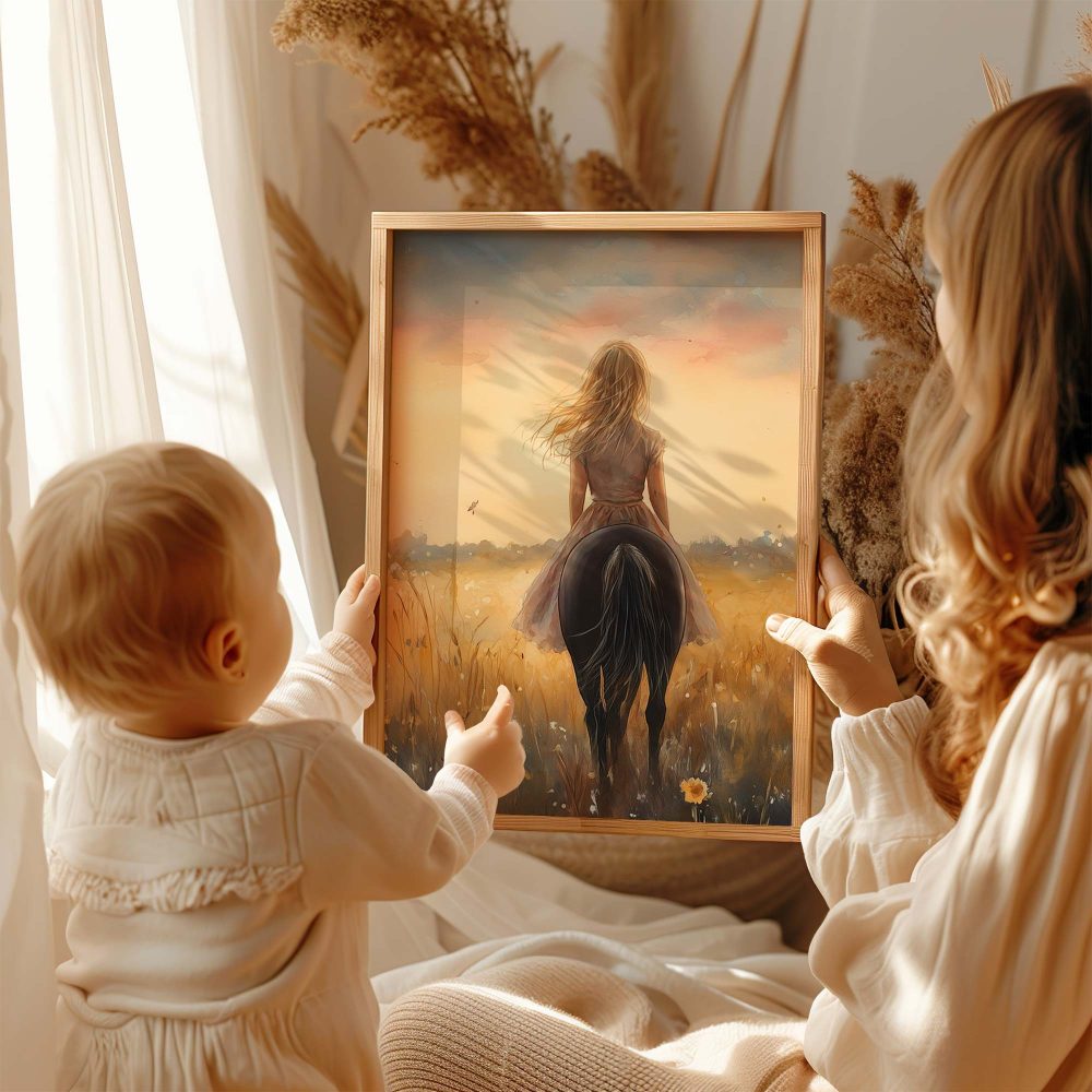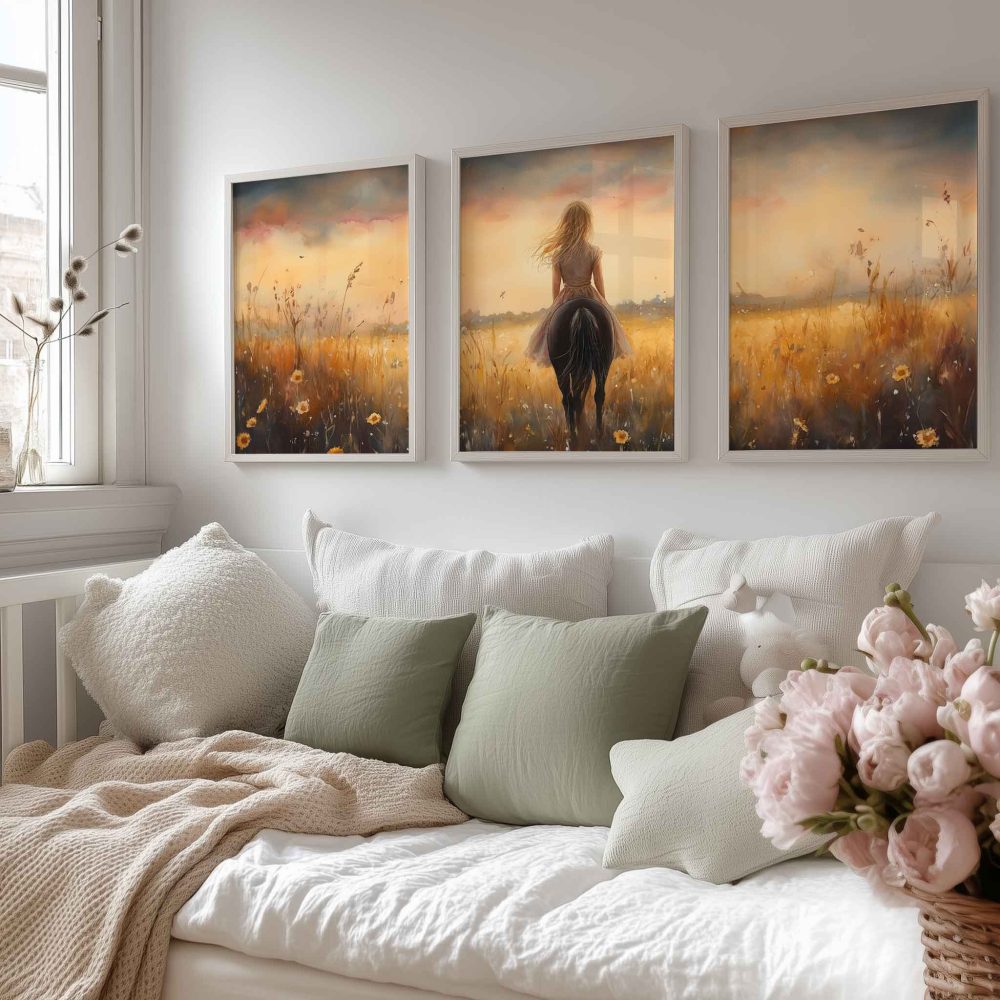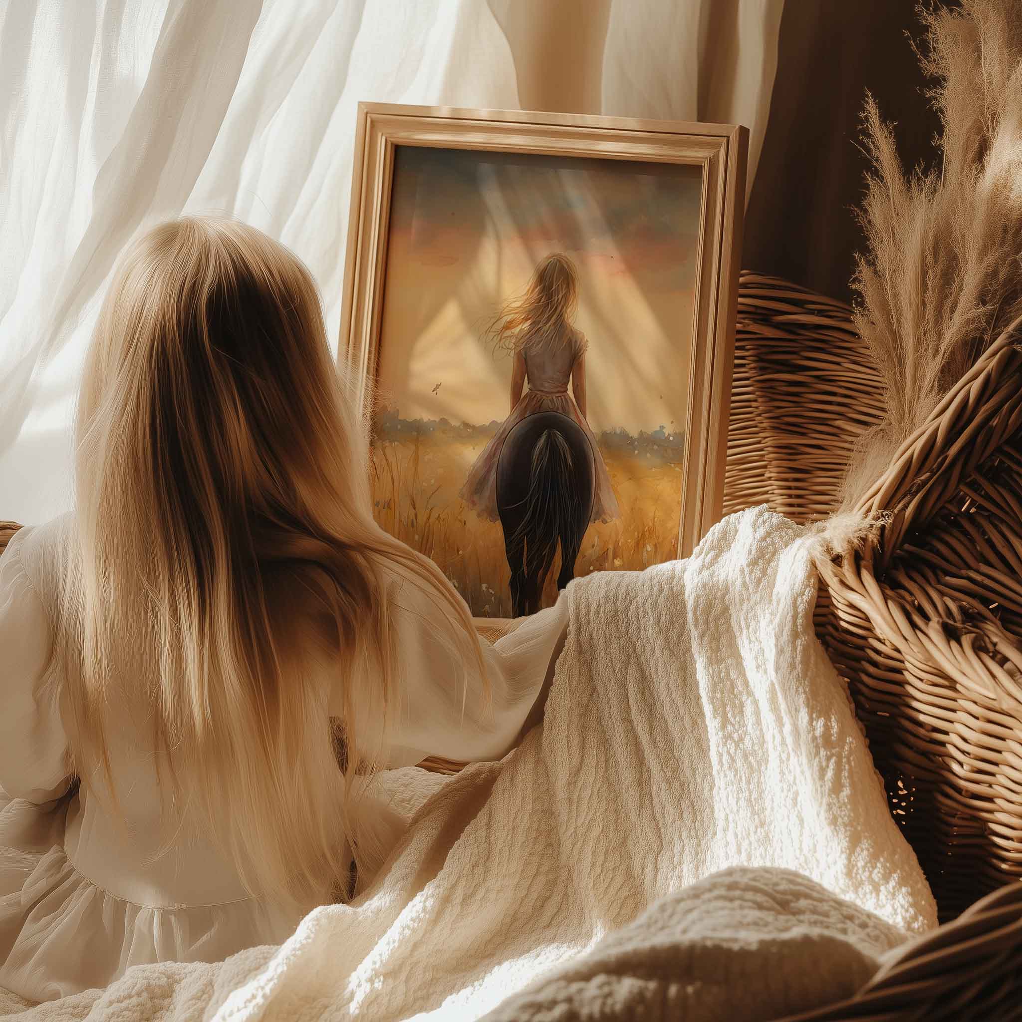 Terug naar collectie / Uncategorized / Zacht pastel bloemenveld met vrolijke dame te paard