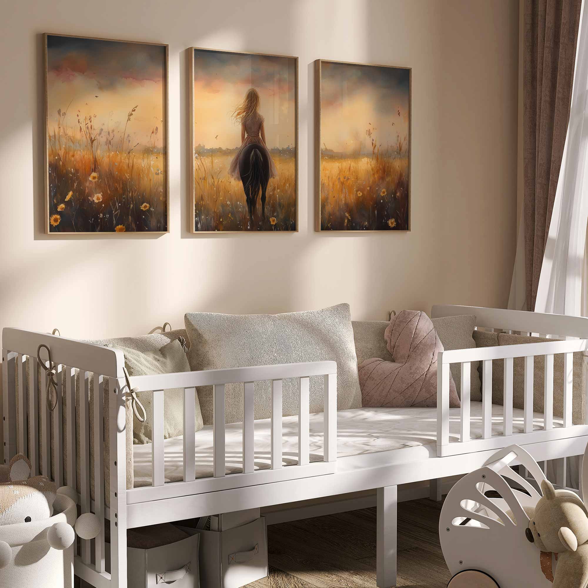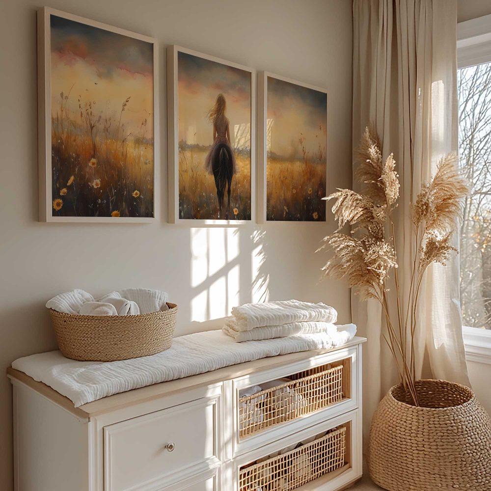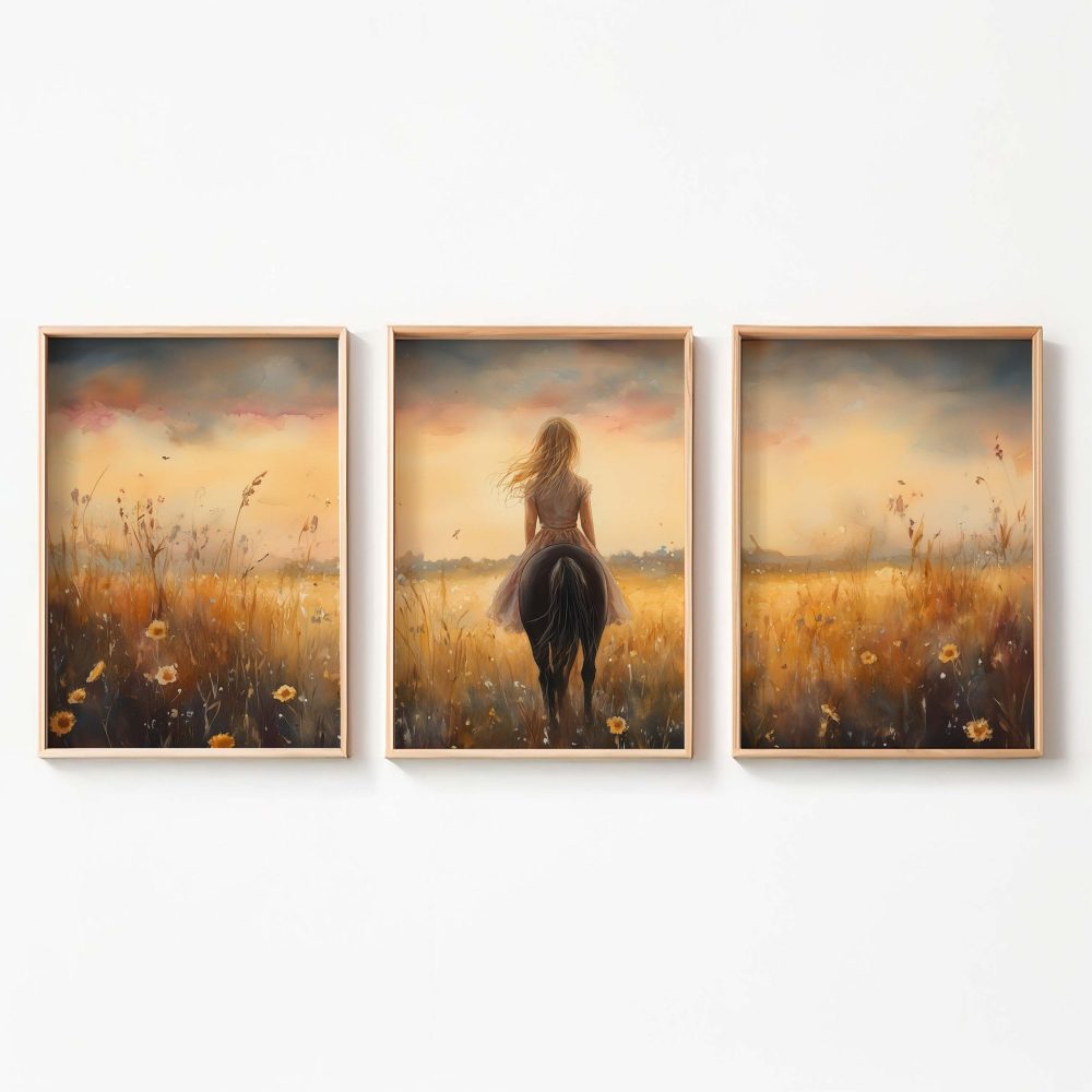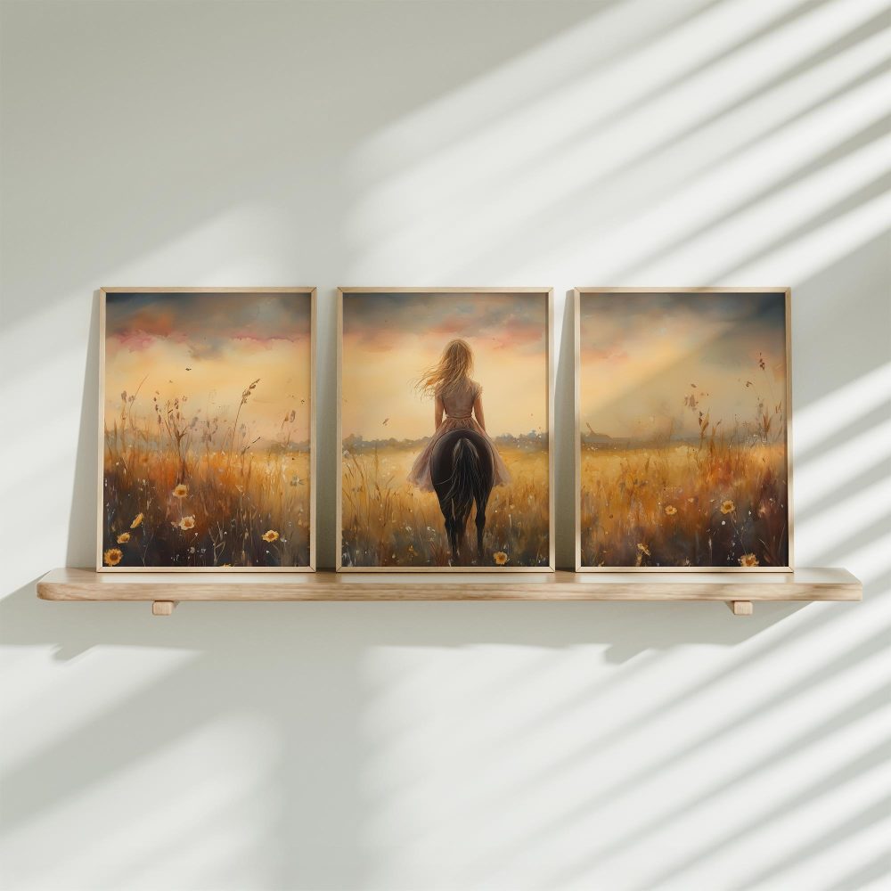 Terug naar collectie / Uncategorized / Zacht pastel bloemenveld met vrolijke dame te paard