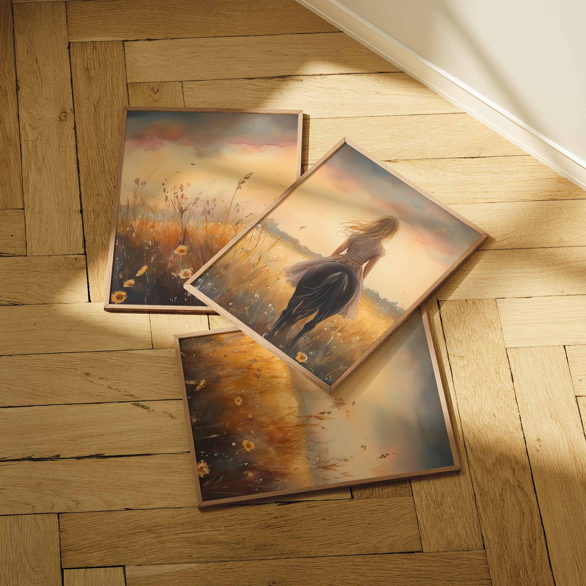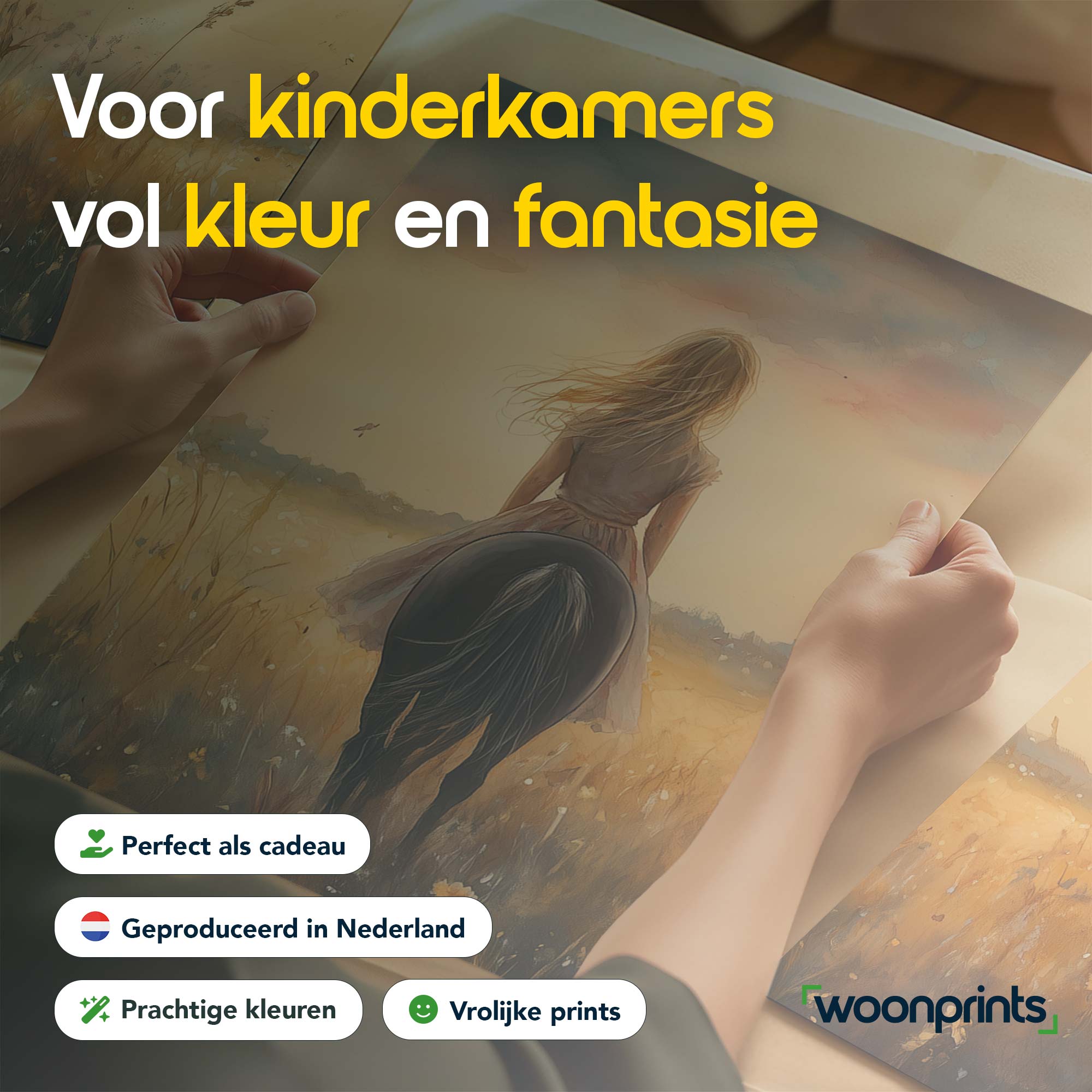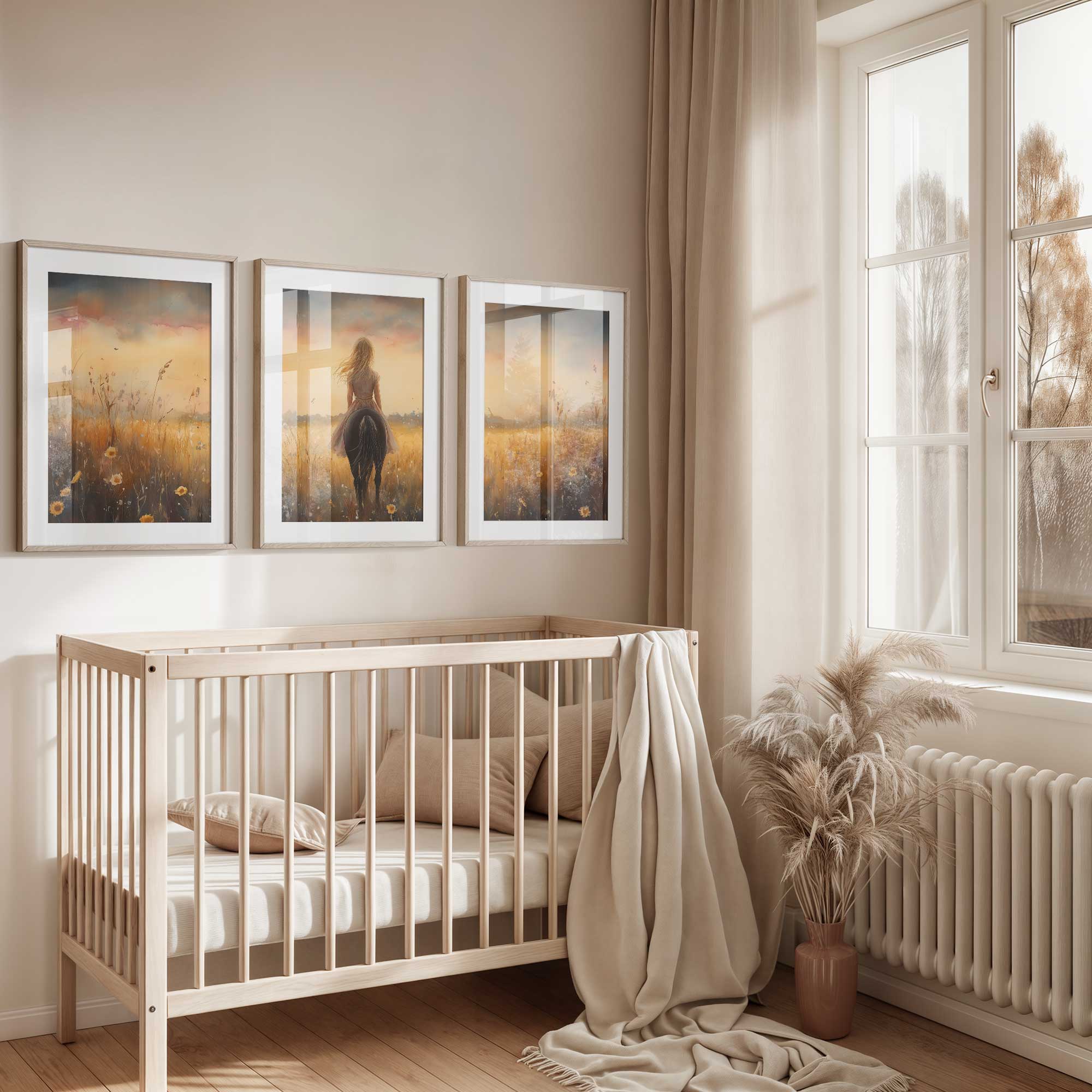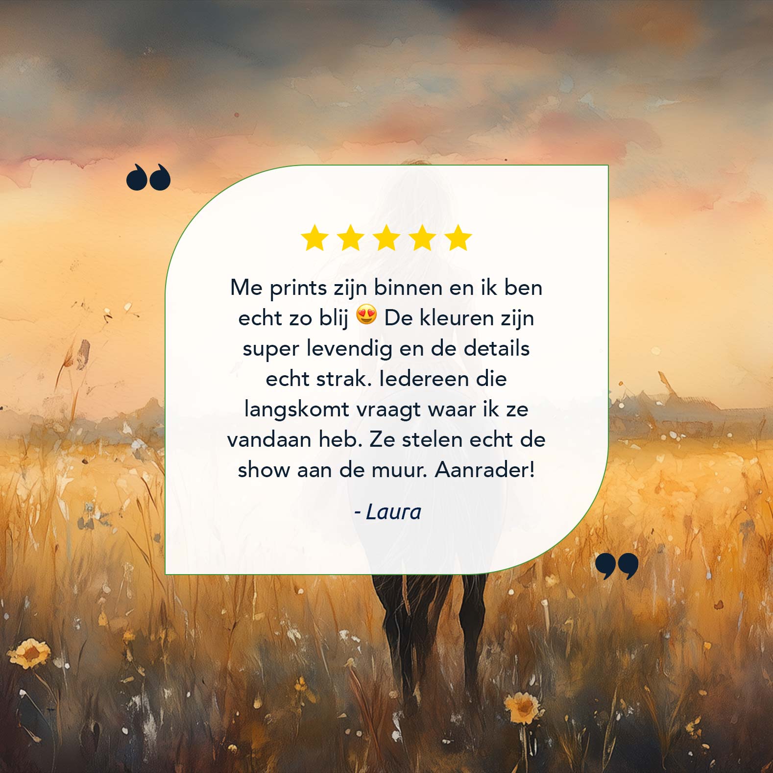 Terug naar collectie / Uncategorized / Zacht pastel bloemenveld met vrolijke dame te paard