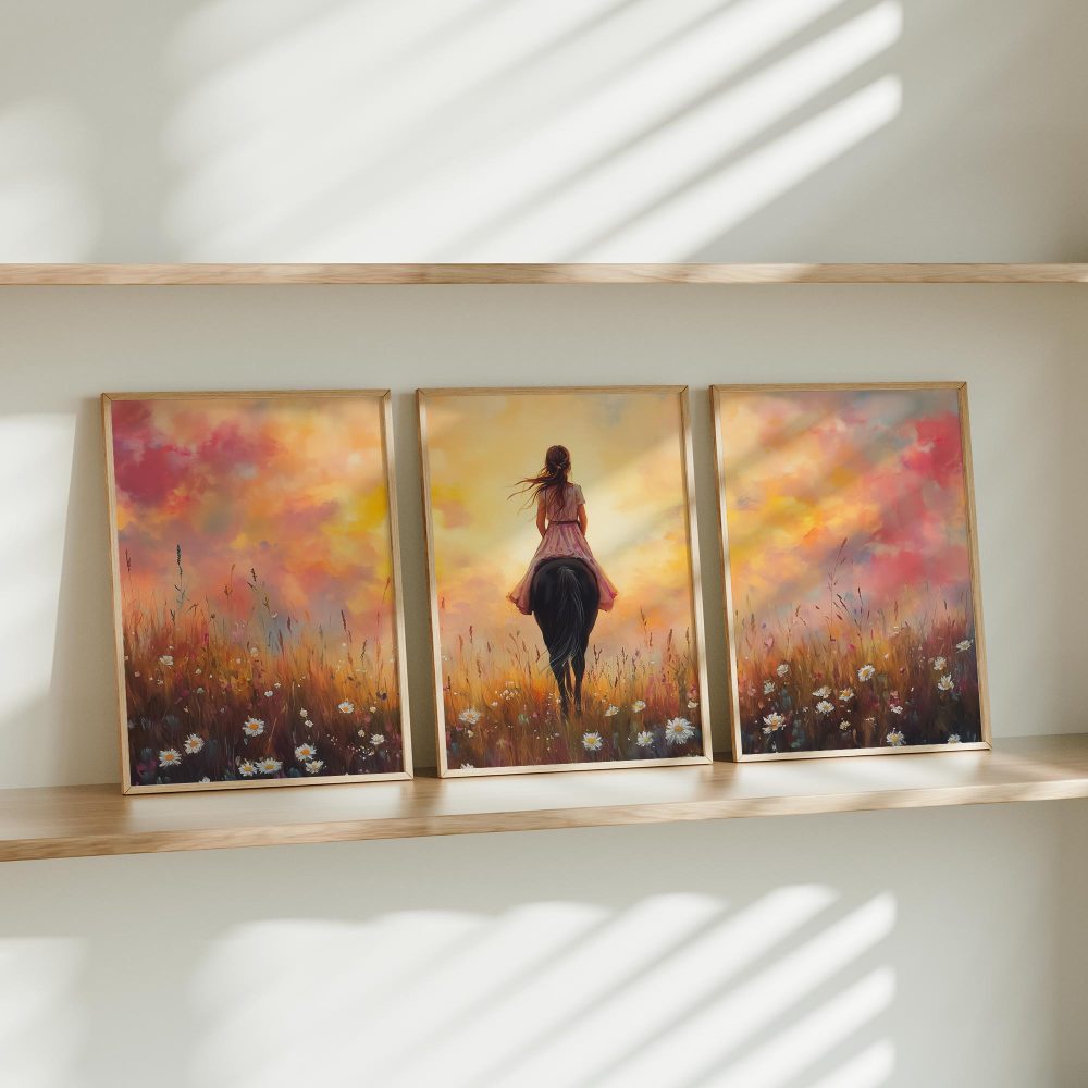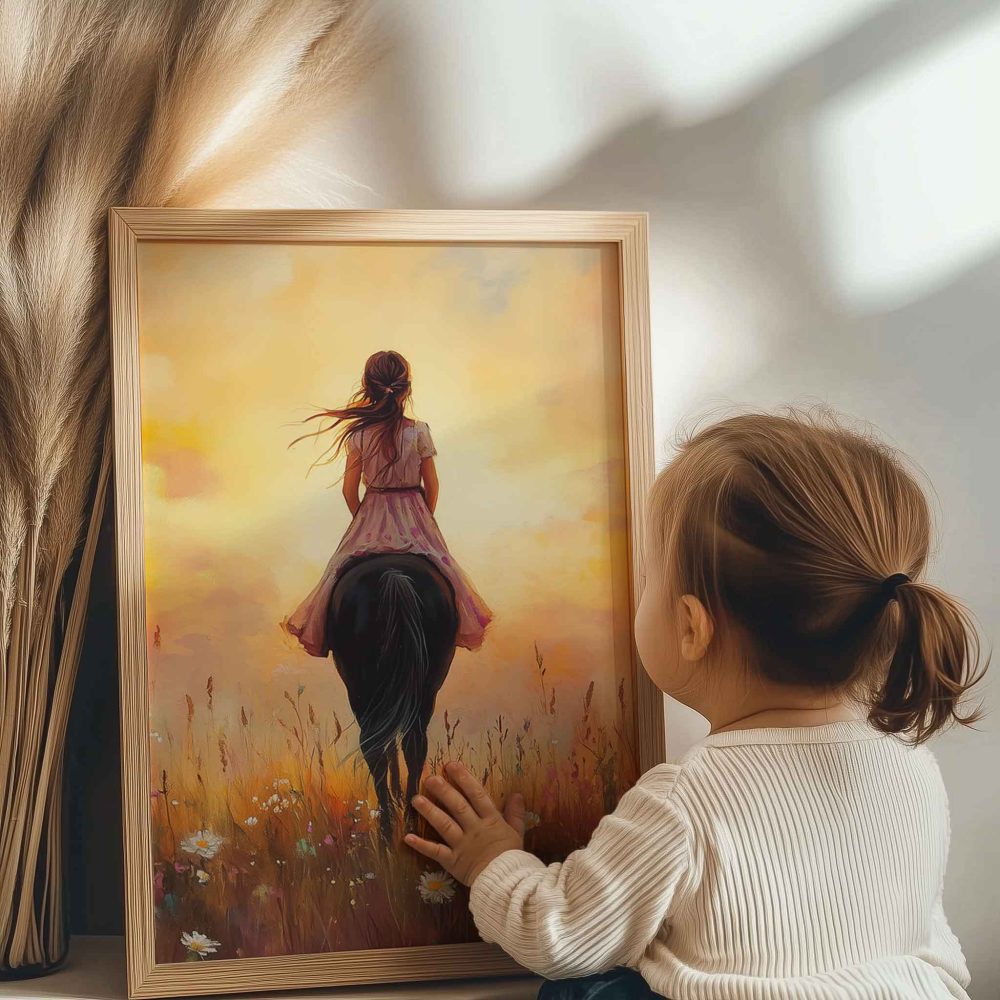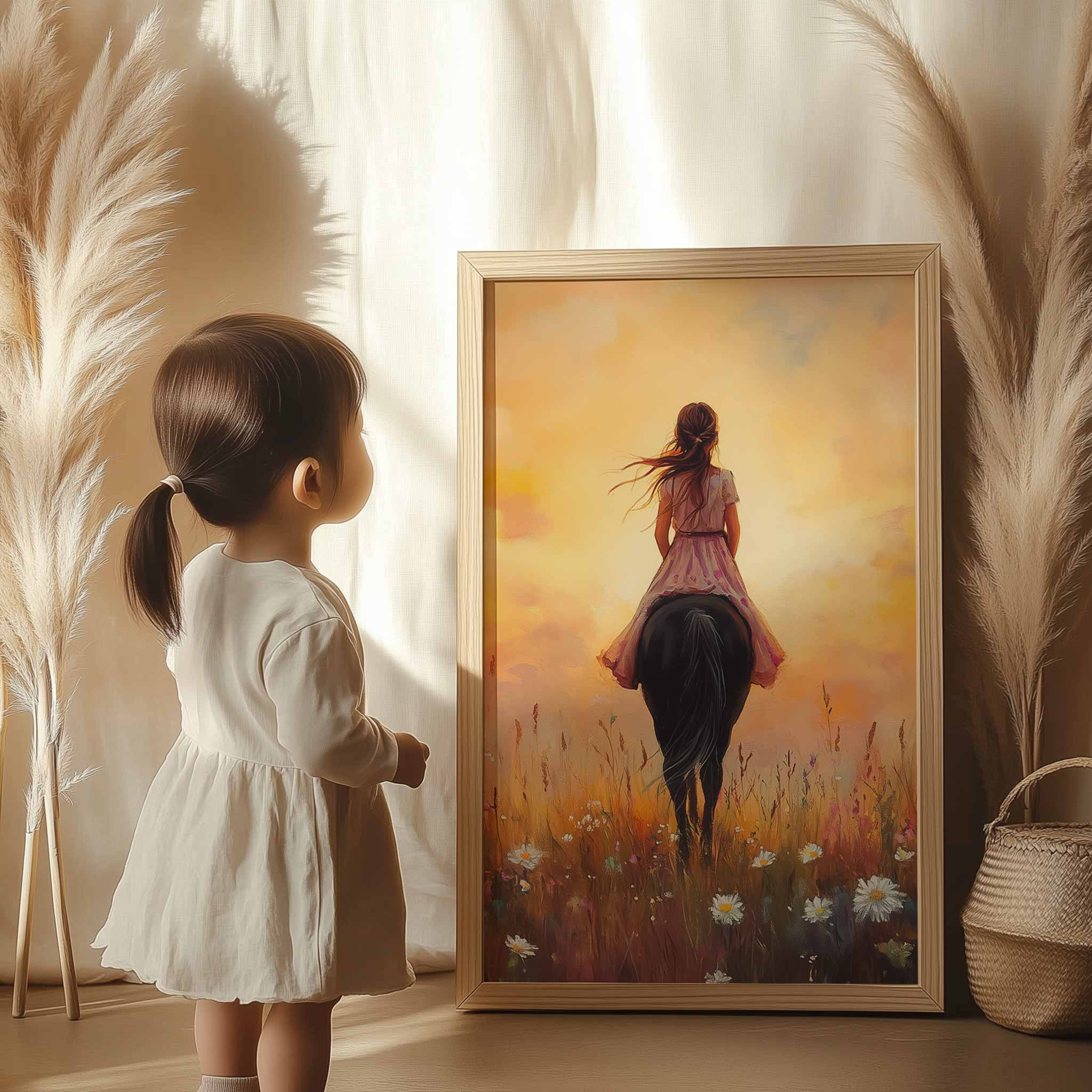 Terug naar collectie / Uncategorized / Zacht Roze Droom: Meisje te Paard tussen Bloemen