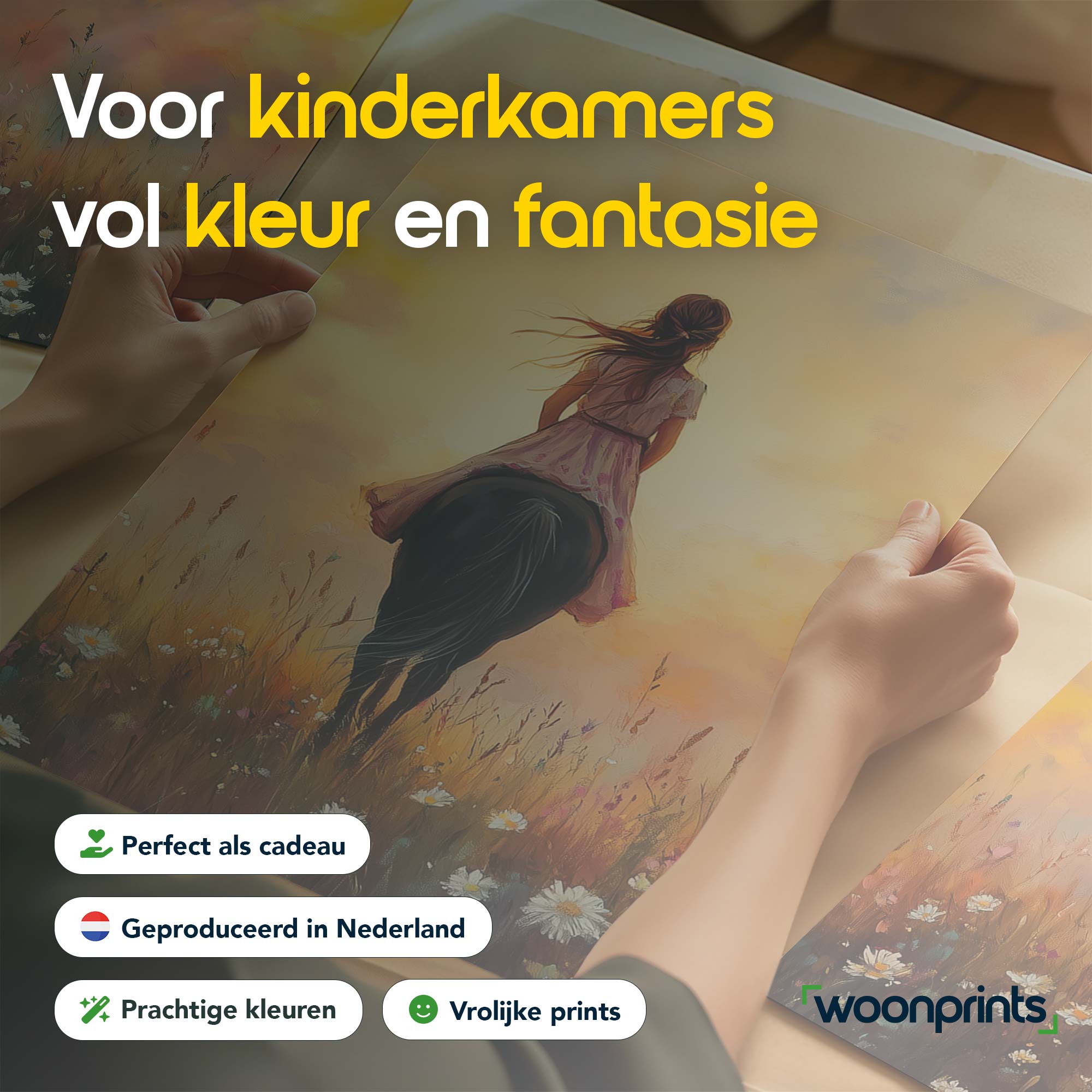 Zacht Roze Droom: Meisje te Paard tussen Bloemen