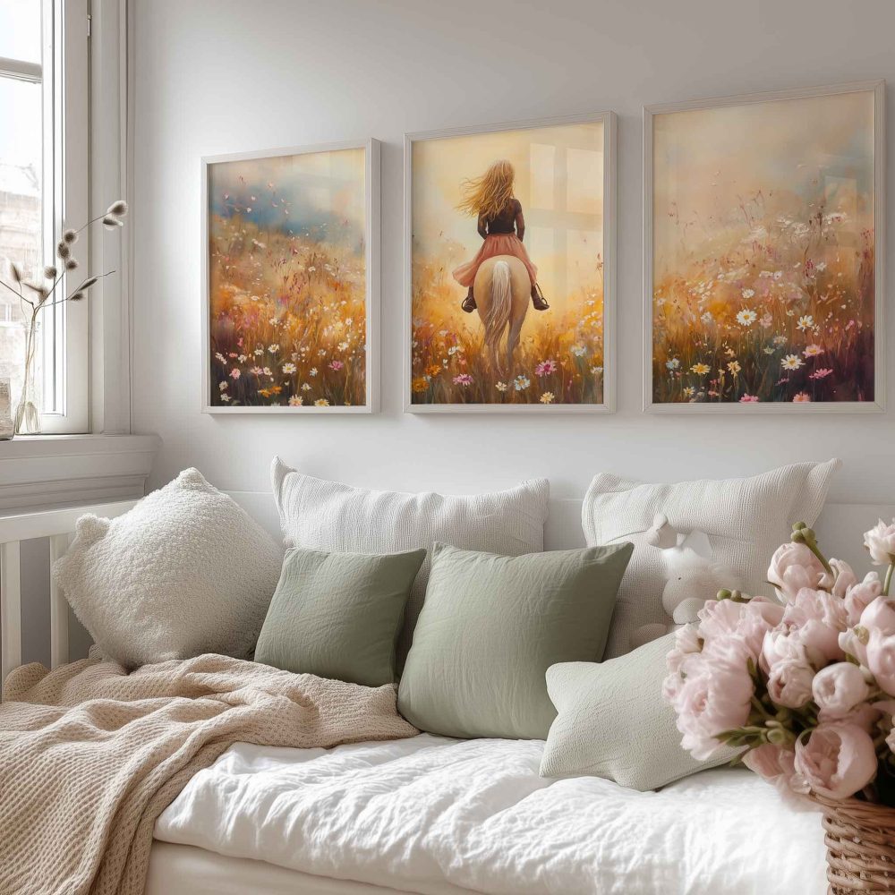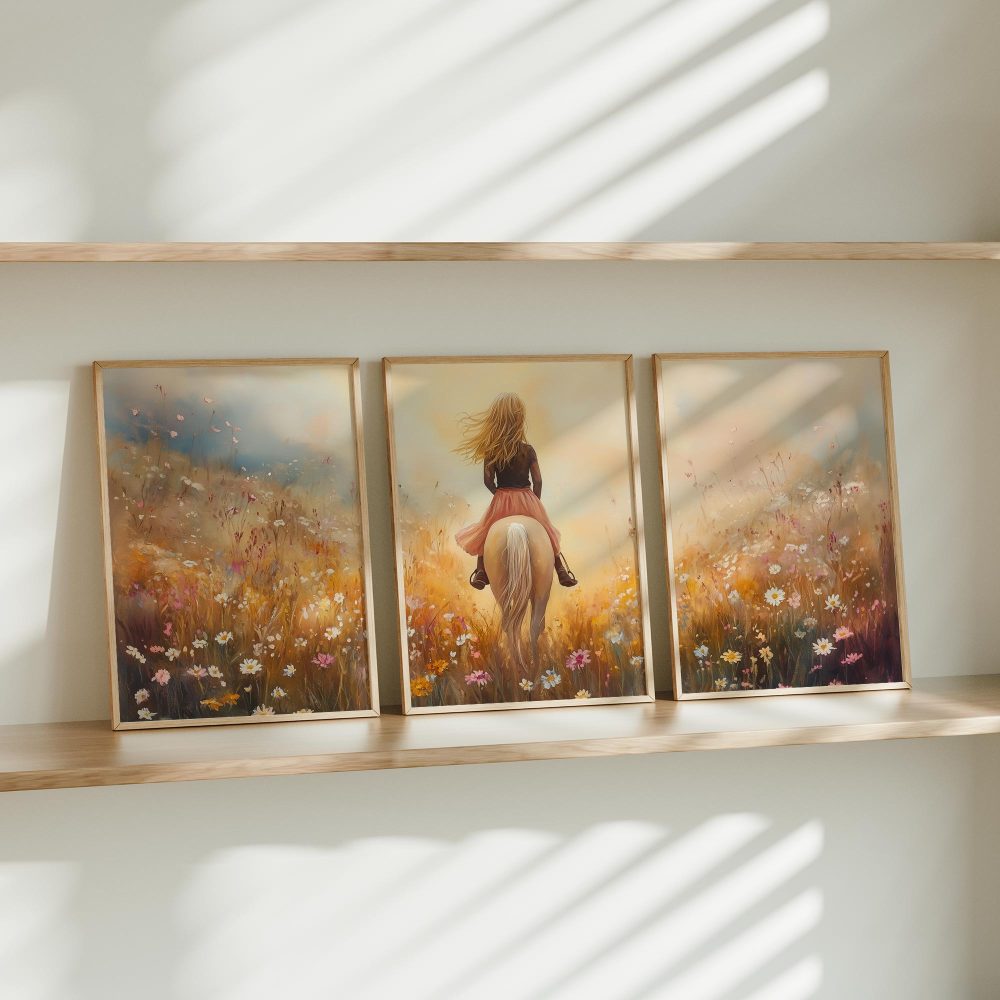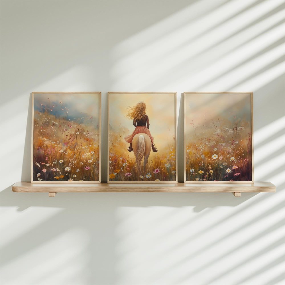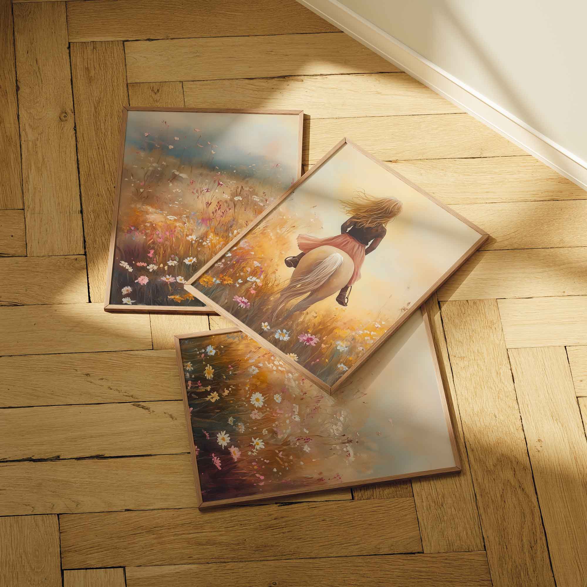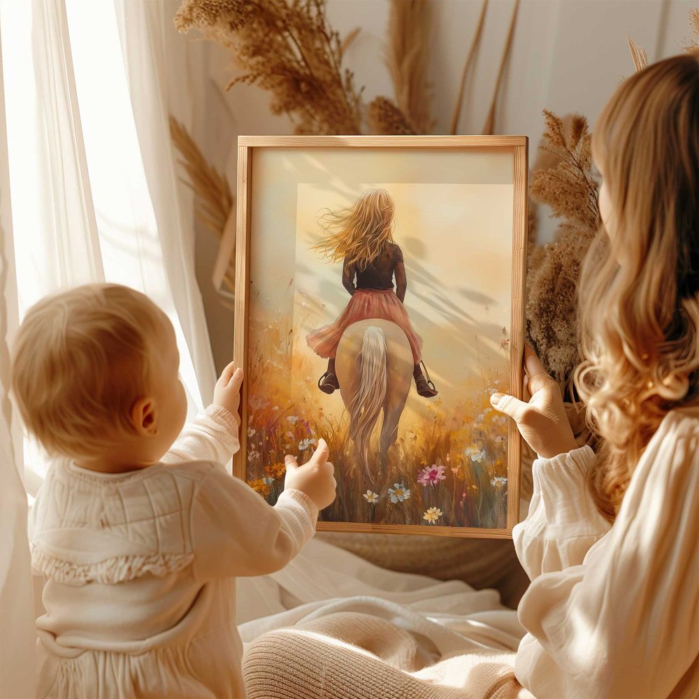 Terug naar collectie / Uncategorized / Zacht Roze Droom: Vrouw te Paard in Bloemenveld