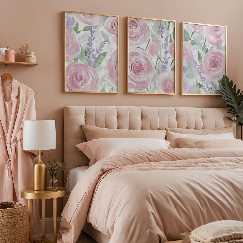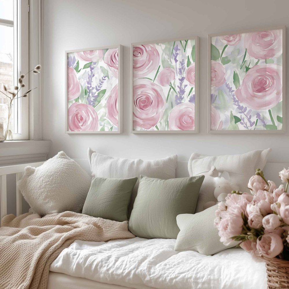 Zacht Roze Rozen en Lavendel – Speelse Waterverf Wanddecoratie