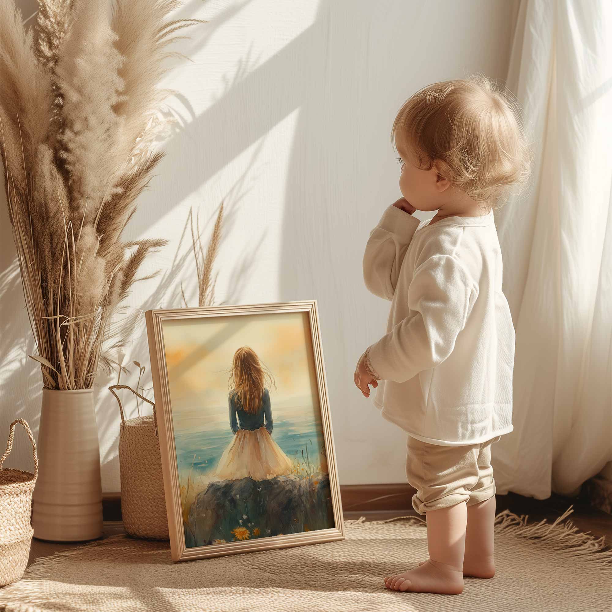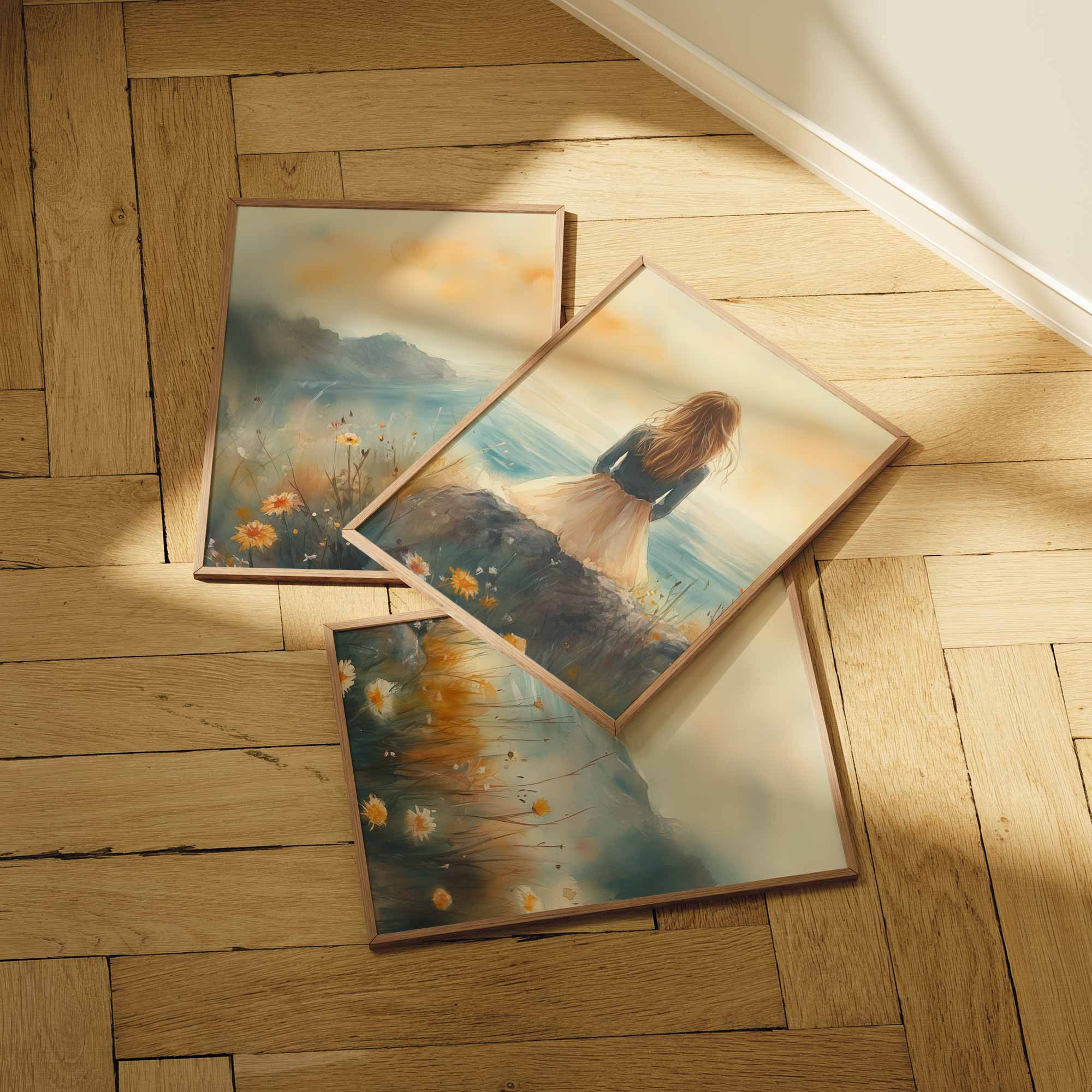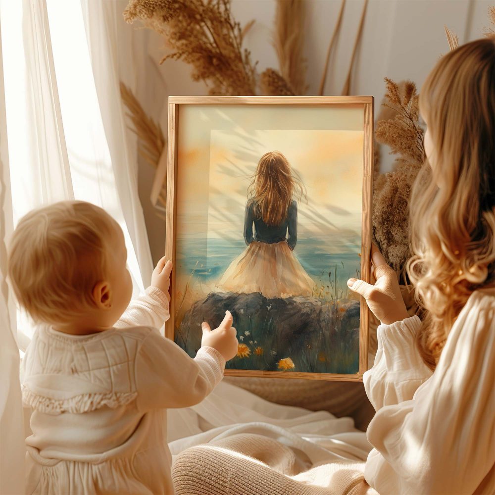 Terug naar collectie / Uncategorized / Zachte Dromen aan Zee: Vrouw tussen Bloemen en Golven