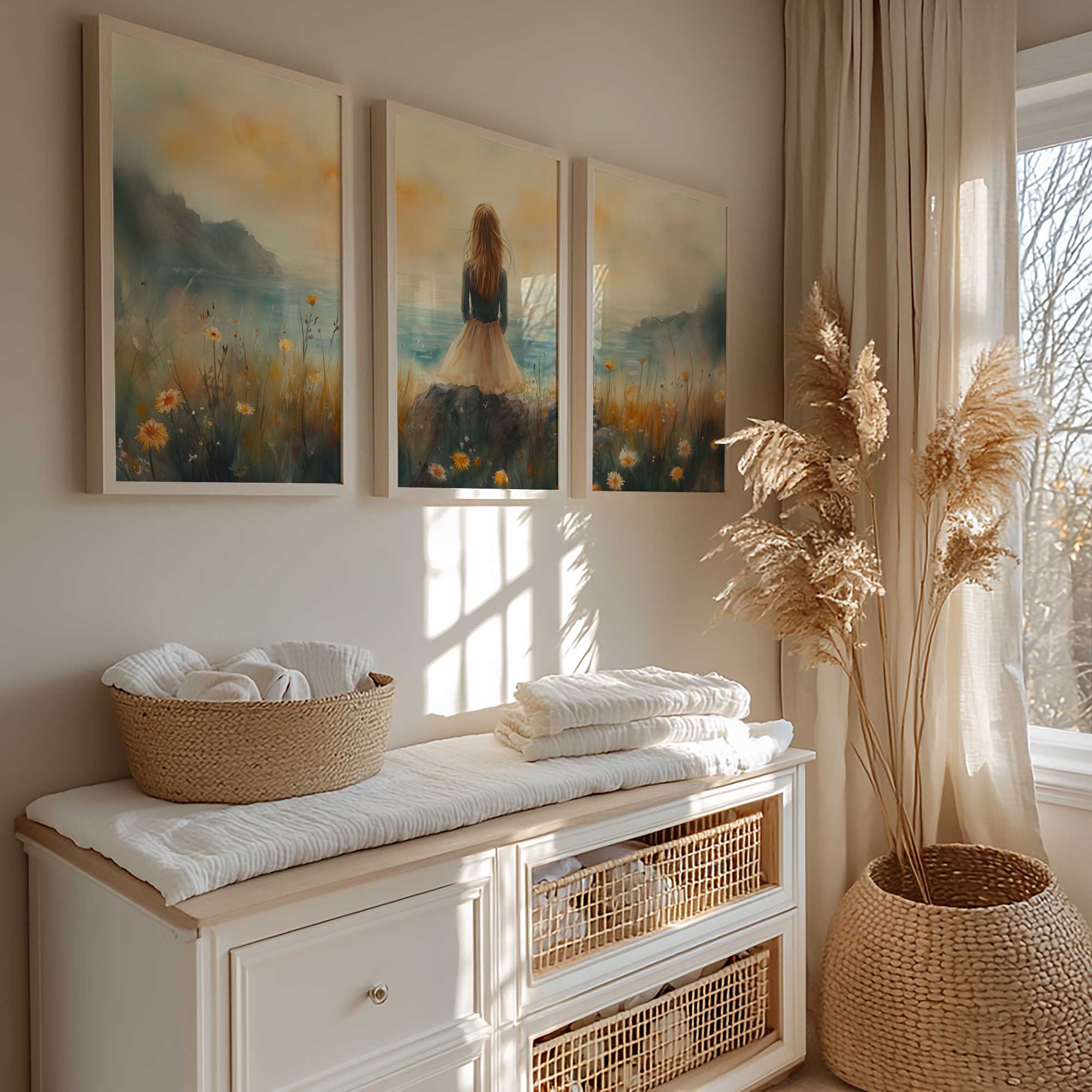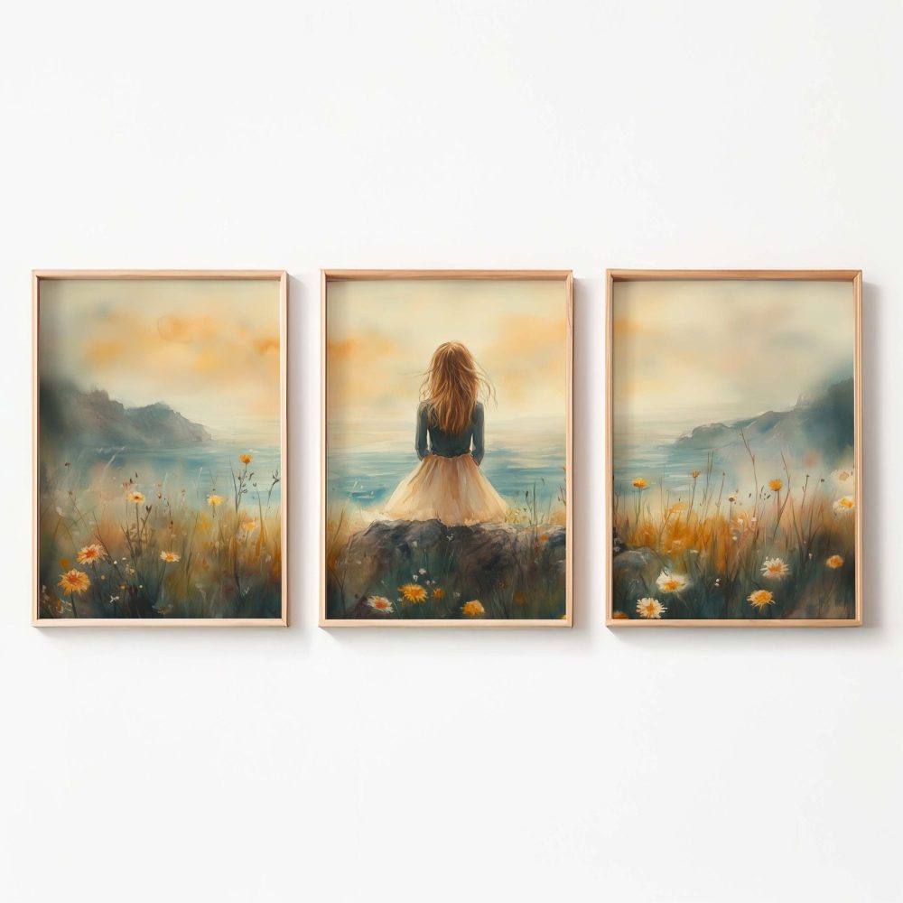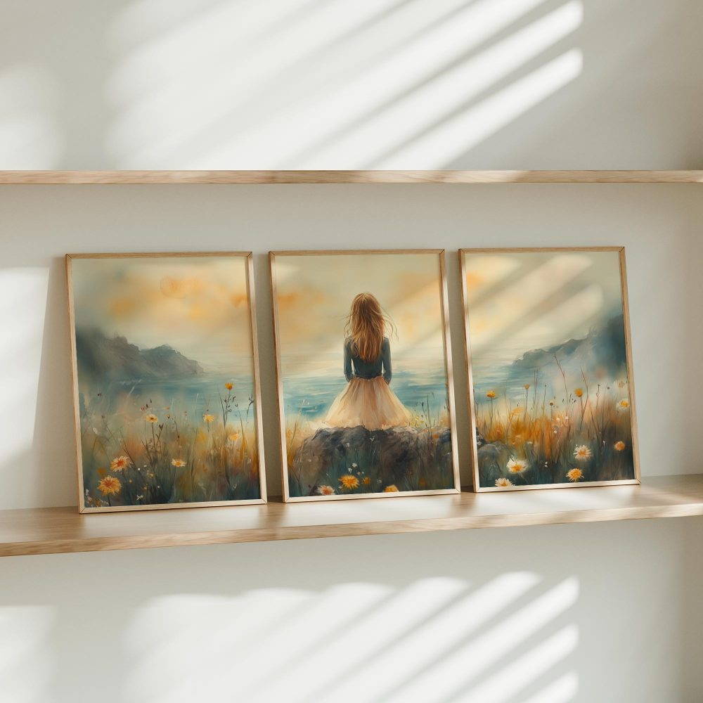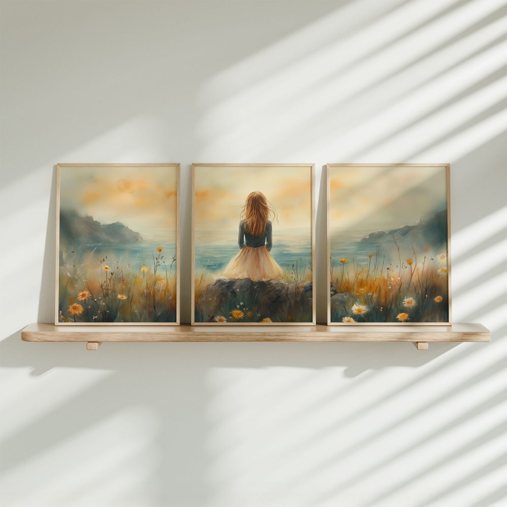 Terug naar collectie / Uncategorized / Zachte Dromen aan Zee: Vrouw tussen Bloemen en Golven