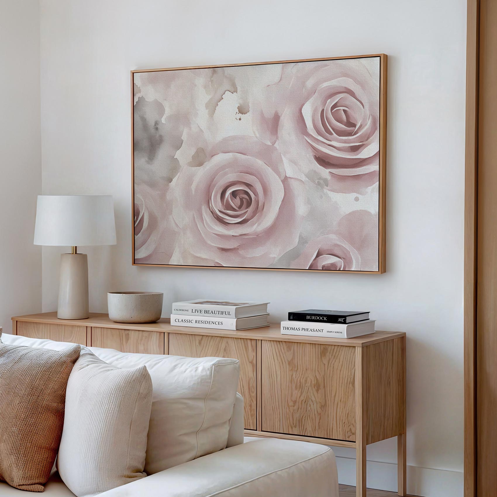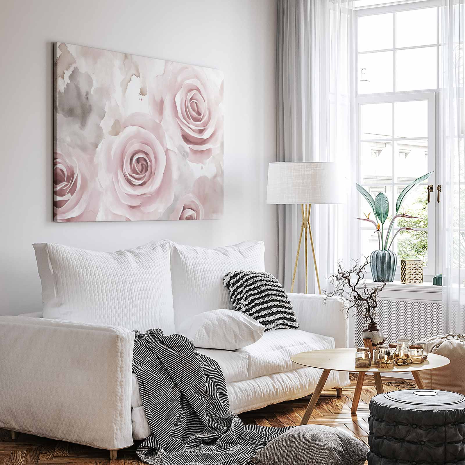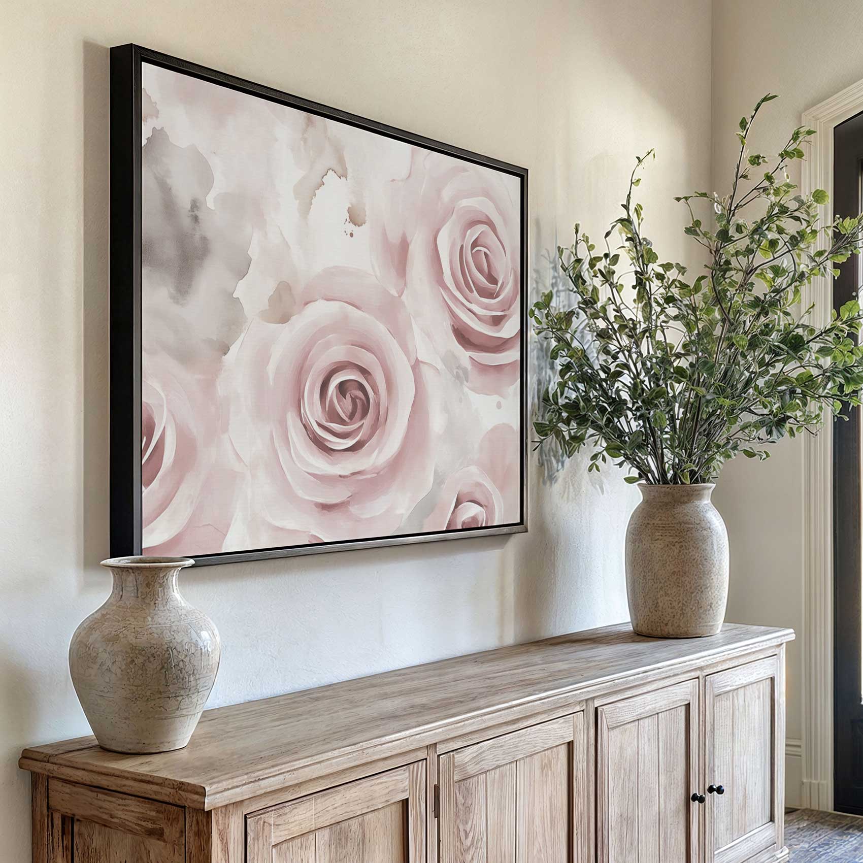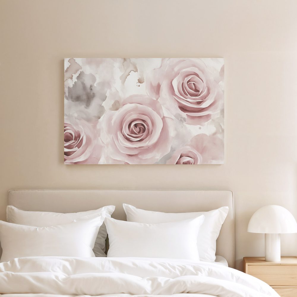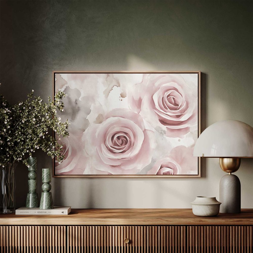 Terug naar collectie / Schilderijen / Bloemen Schilderij / Zachte roze waterrozen compositie
