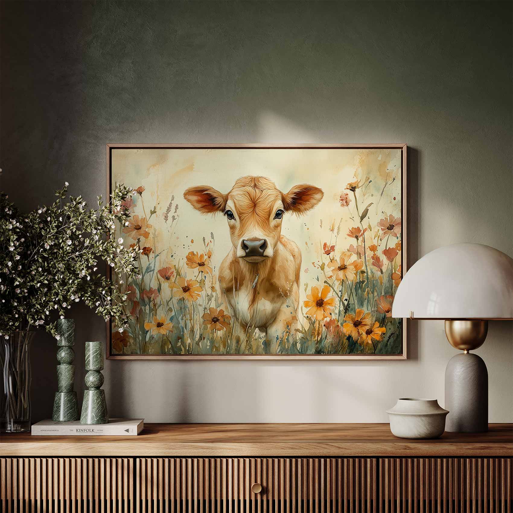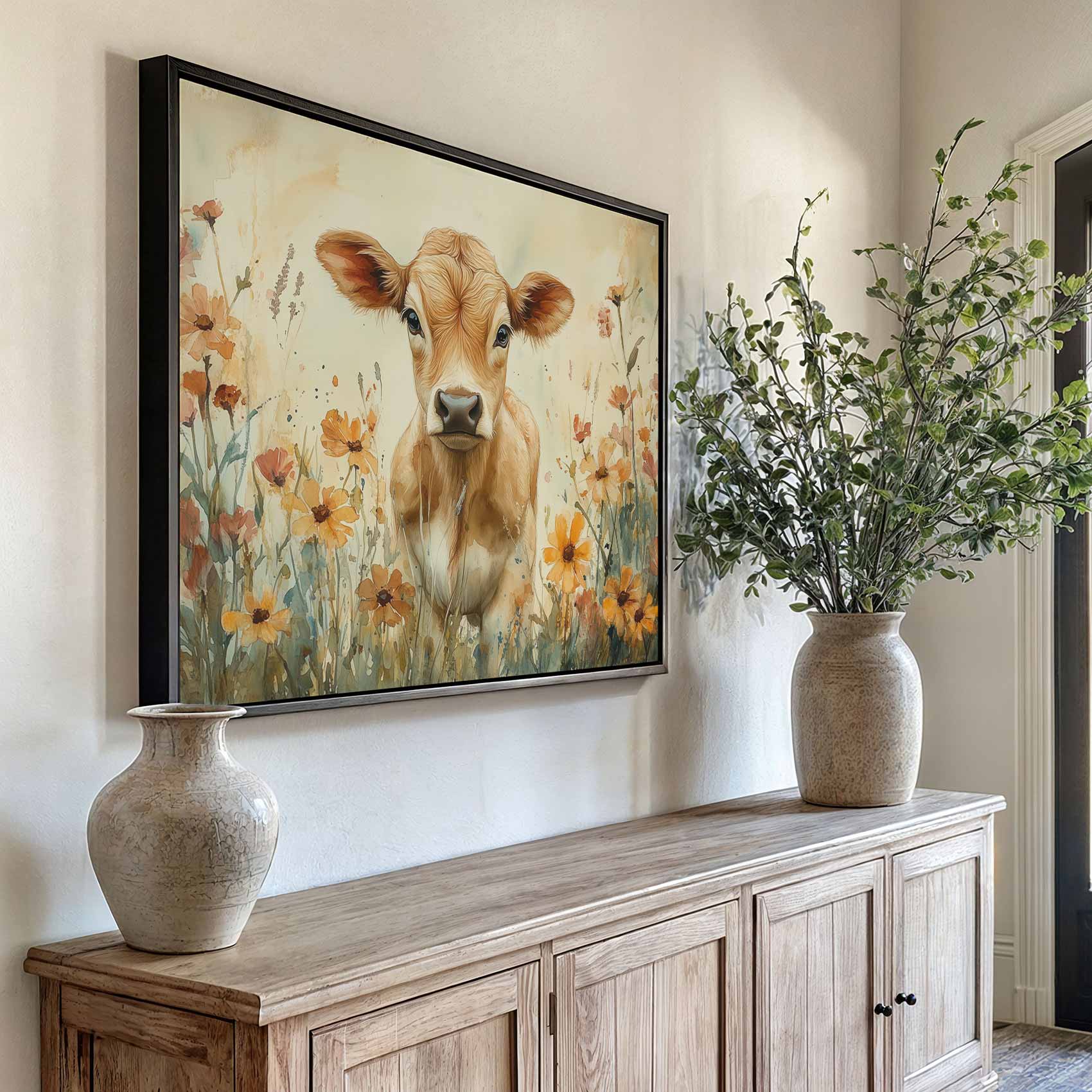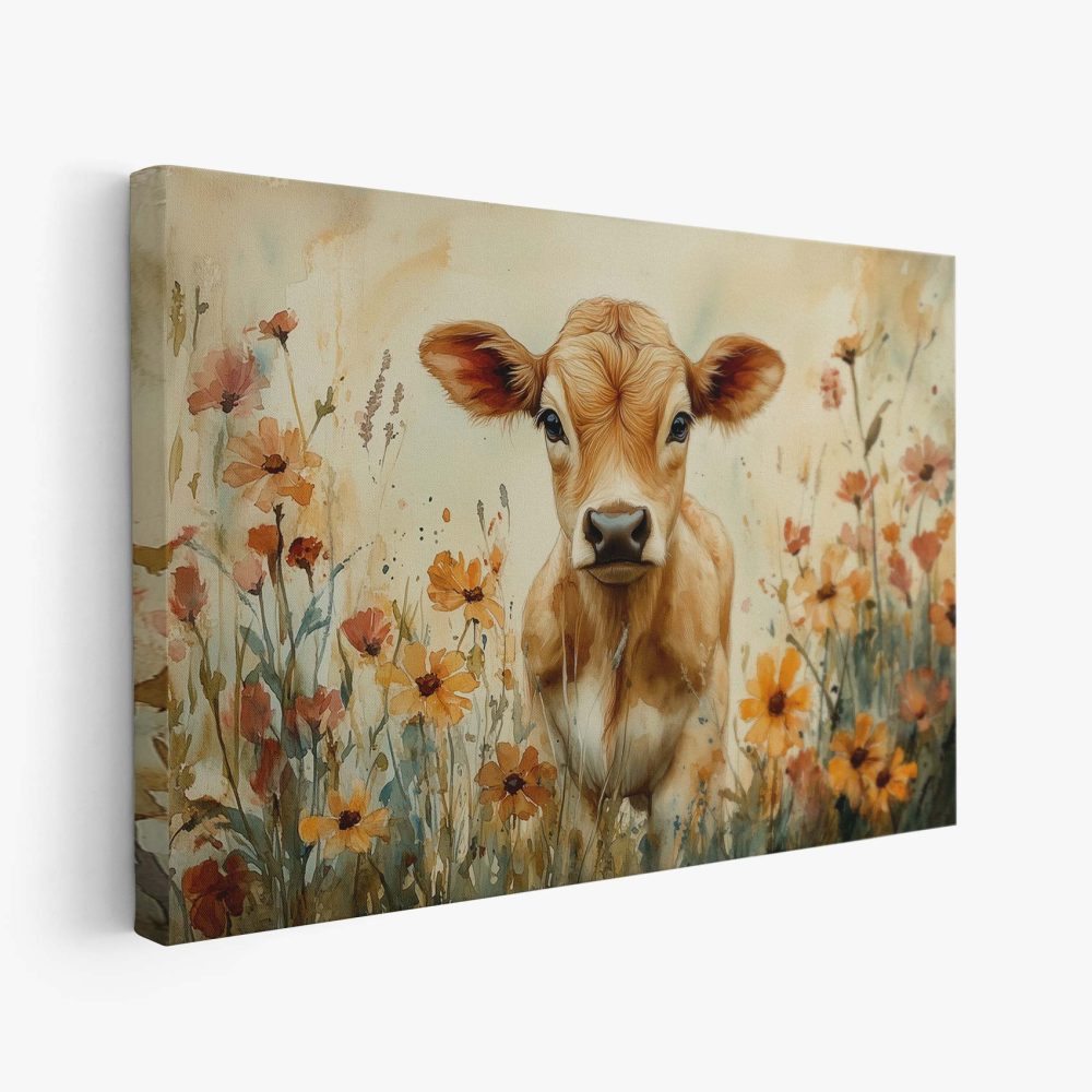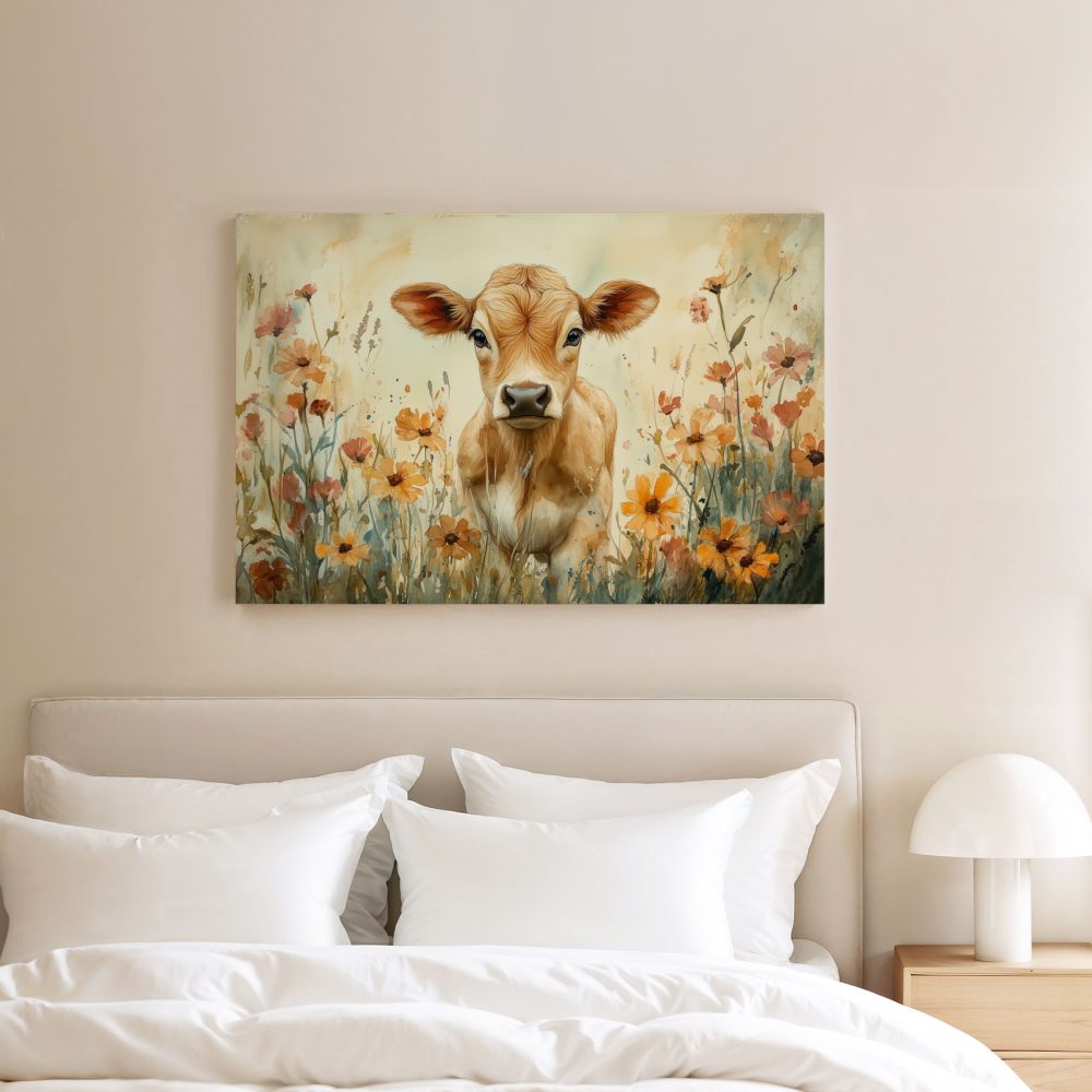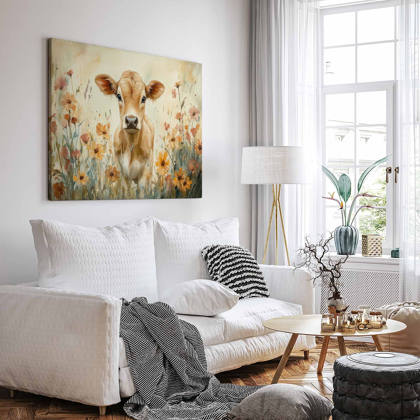 Terug naar collectie / Schilderijen / Bloemen Schilderij / Zachte waterverfkoe in bloemenveld