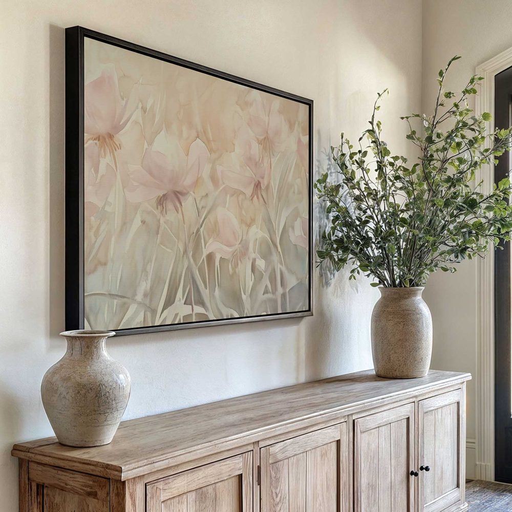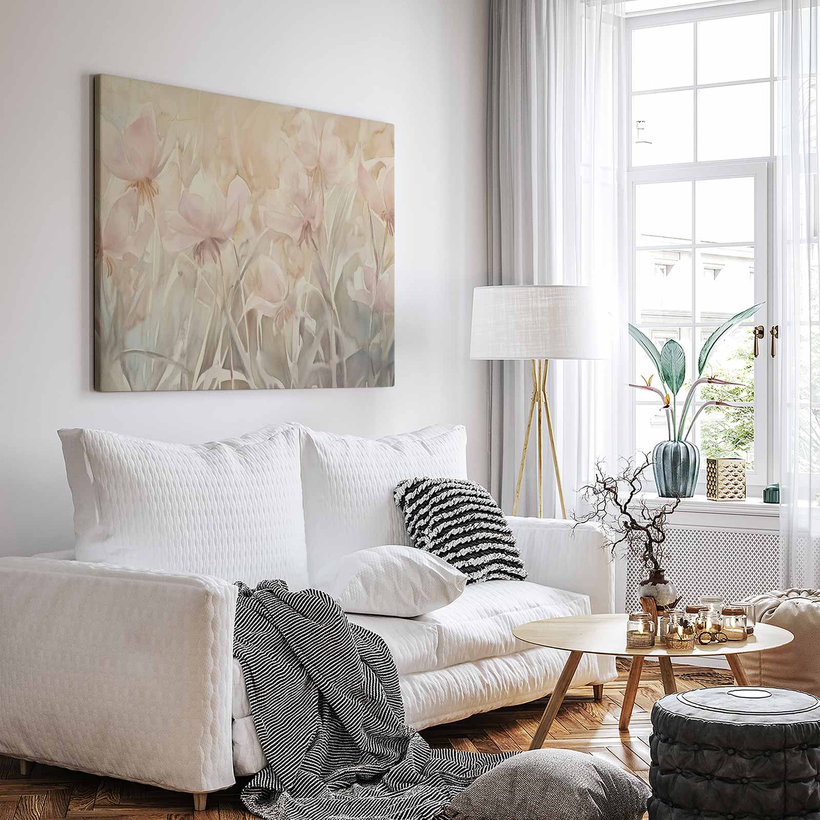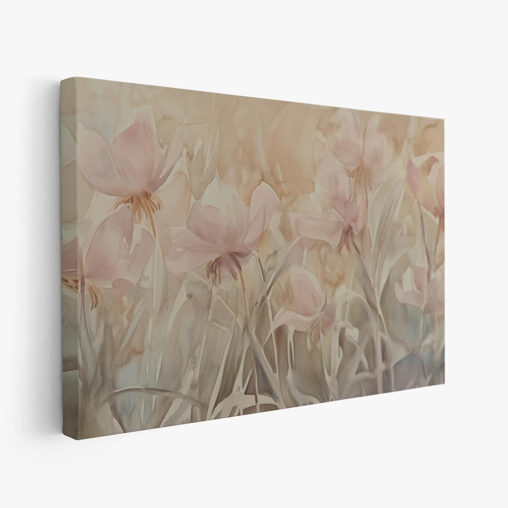 Terug naar collectie / Schilderijen / Bloemen Schilderij / Zachtroze watercolor bloemenveld