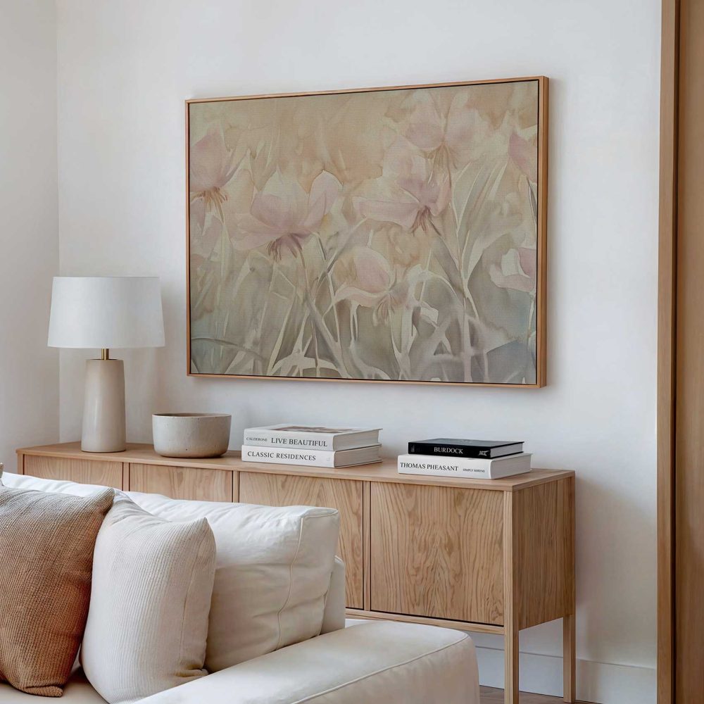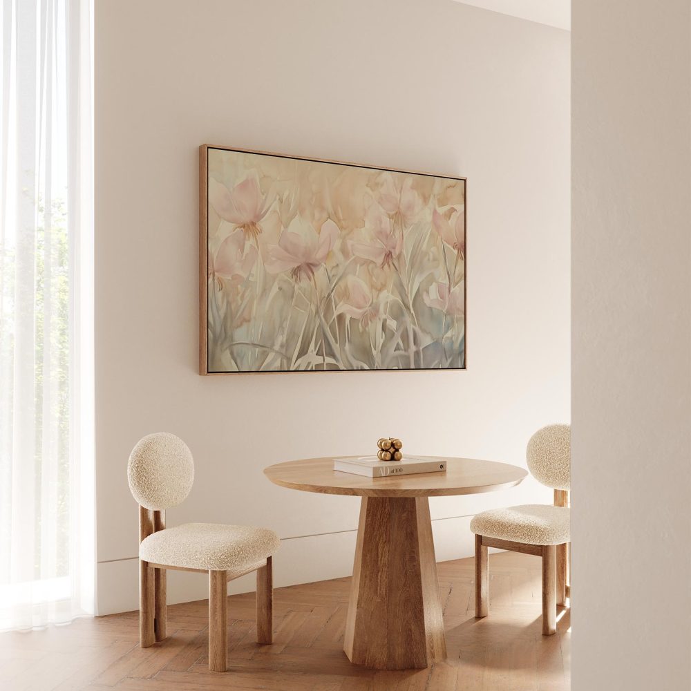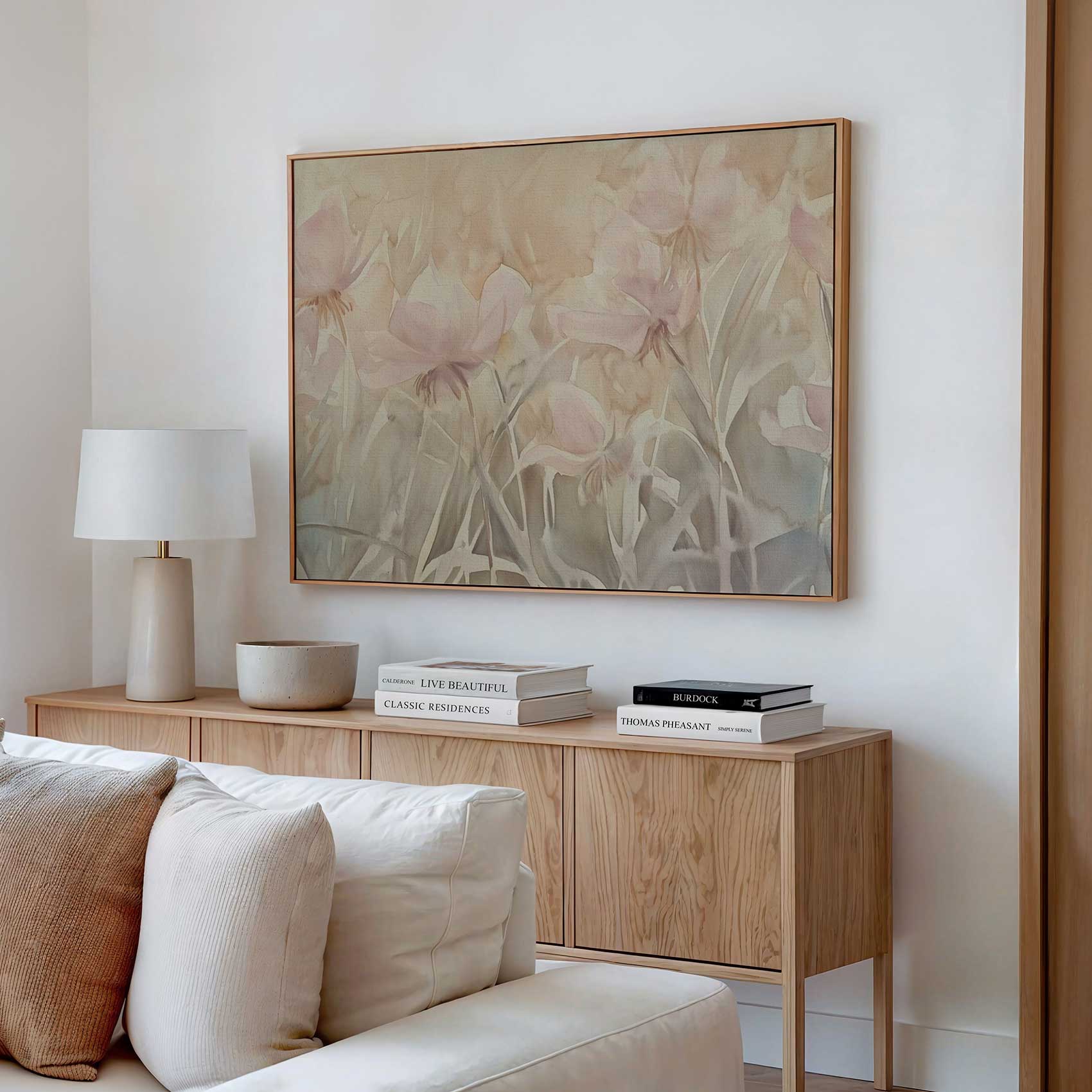 Terug naar collectie / Schilderijen / Bloemen Schilderij / Zachtroze watercolor bloemenveld