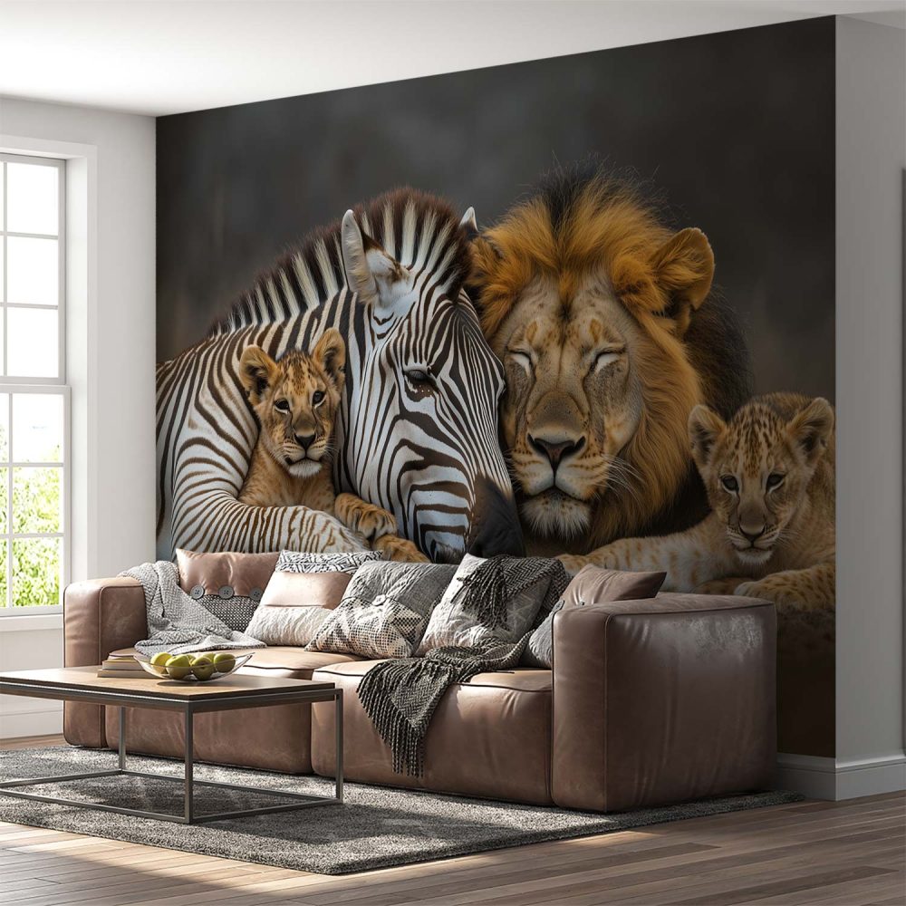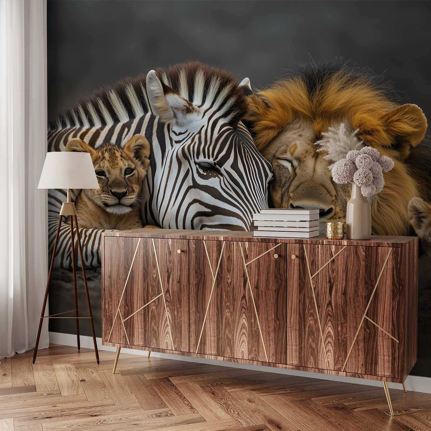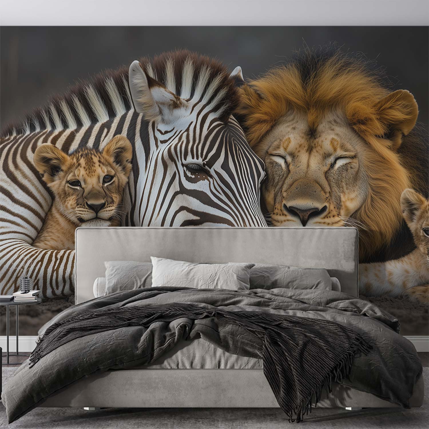 Terug naar collectie / Behang / Zebra en leeuwenwelpen samen behang