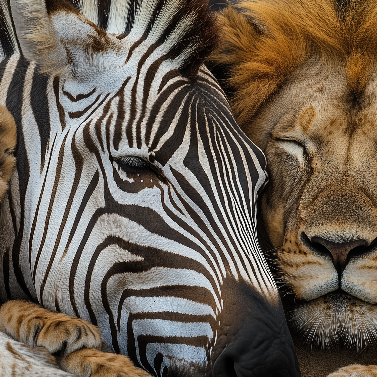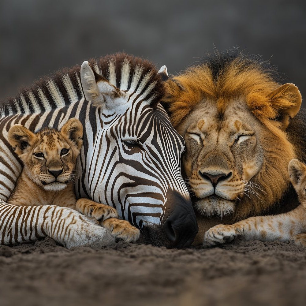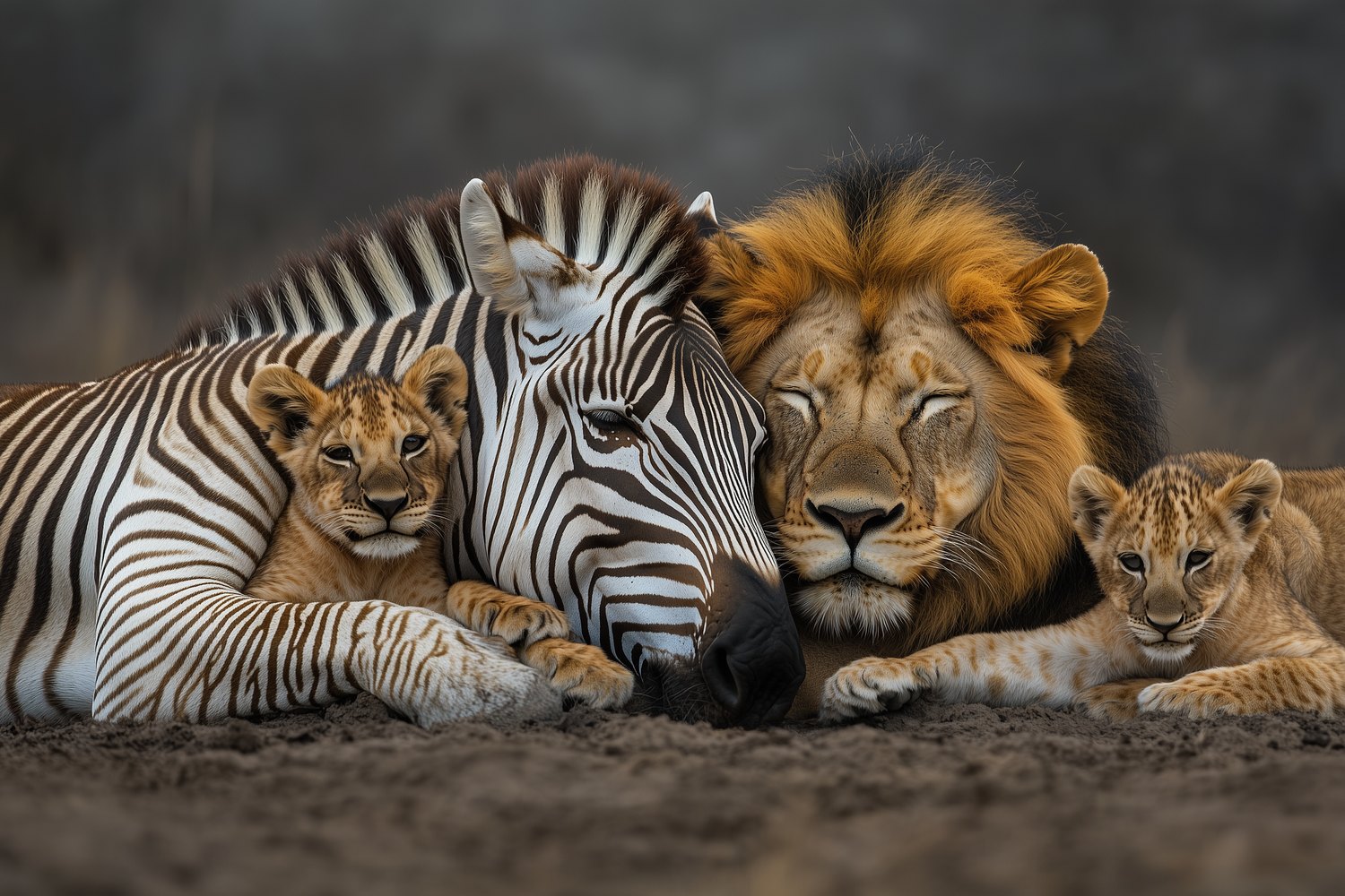 Terug naar collectie / Behang / Zebra en leeuwenwelpen samen behang
