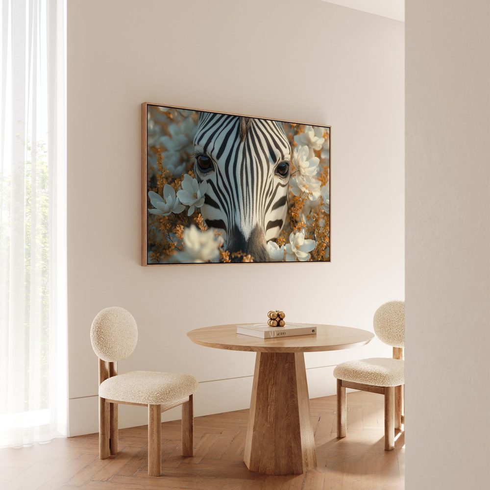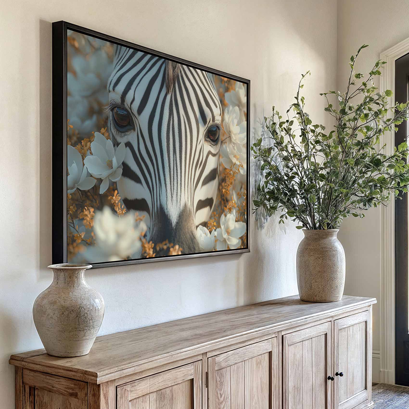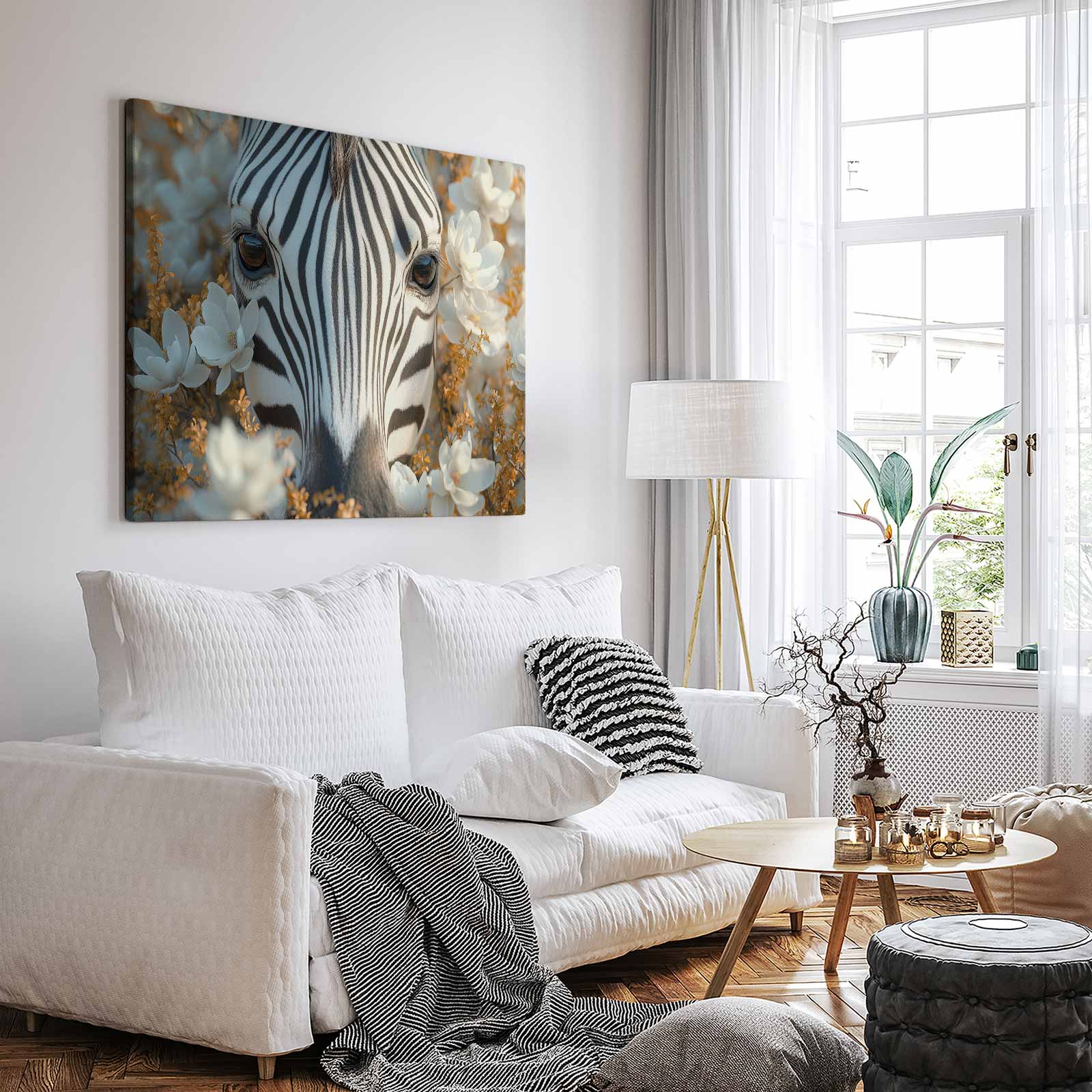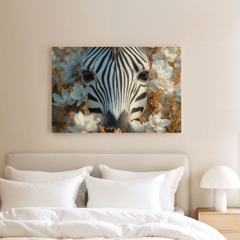 Terug naar collectie / Schilderijen / Bloemen Schilderij / Zebra tussen kleurige bloemen