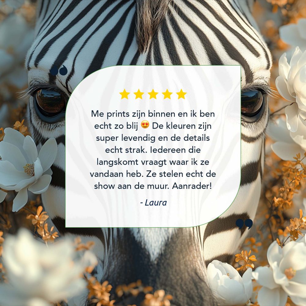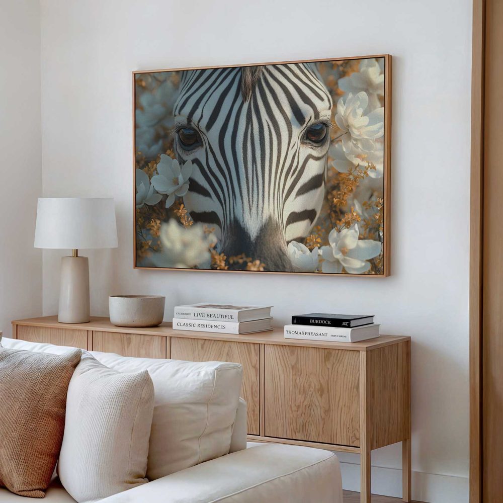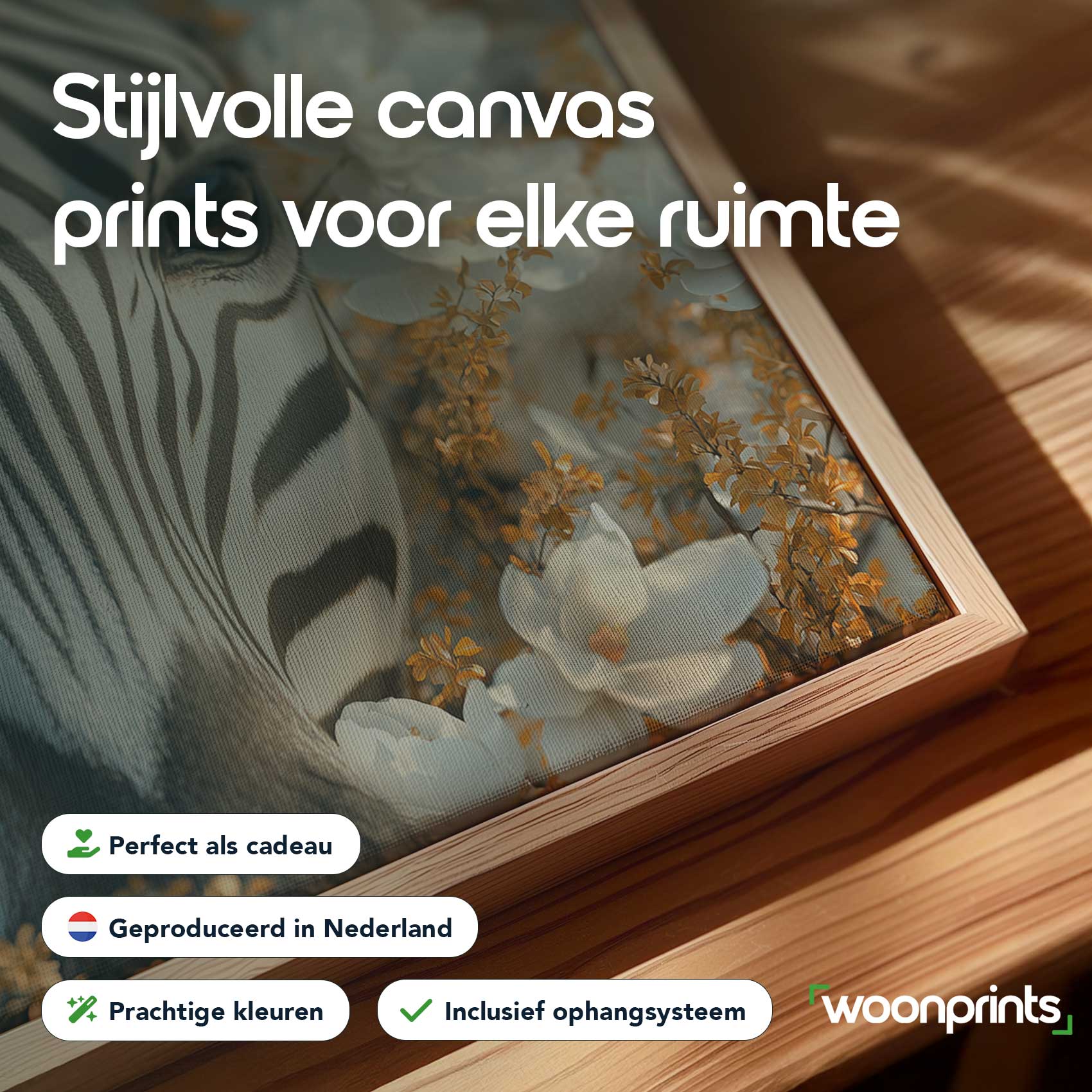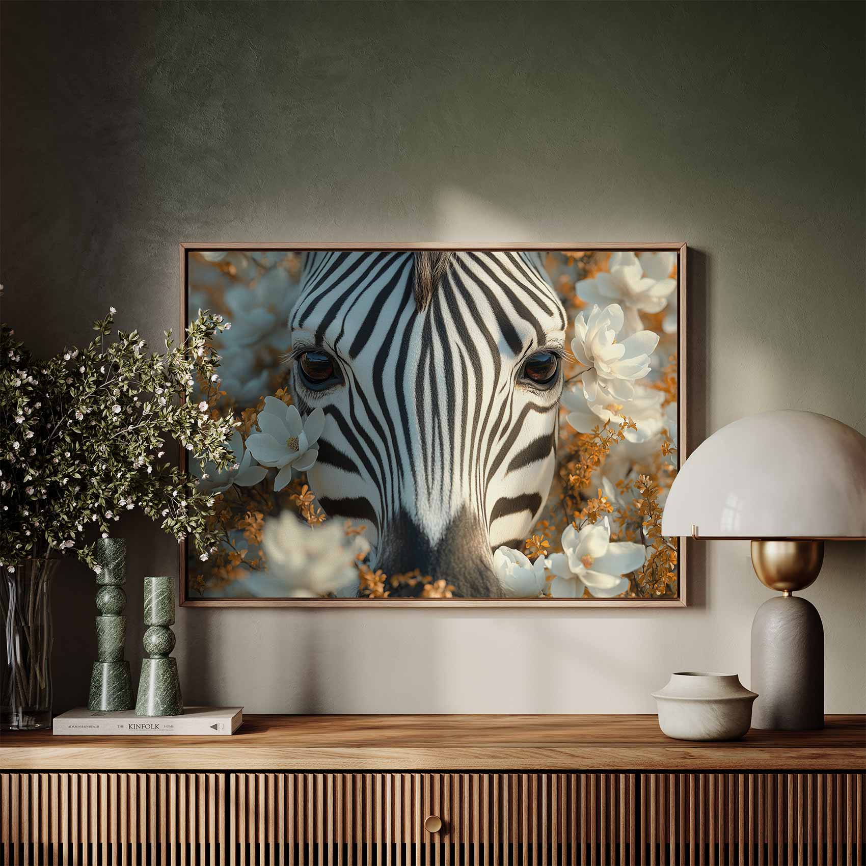 Terug naar collectie / Schilderijen / Bloemen Schilderij / Zebra tussen kleurige bloemen
