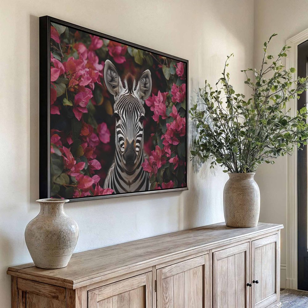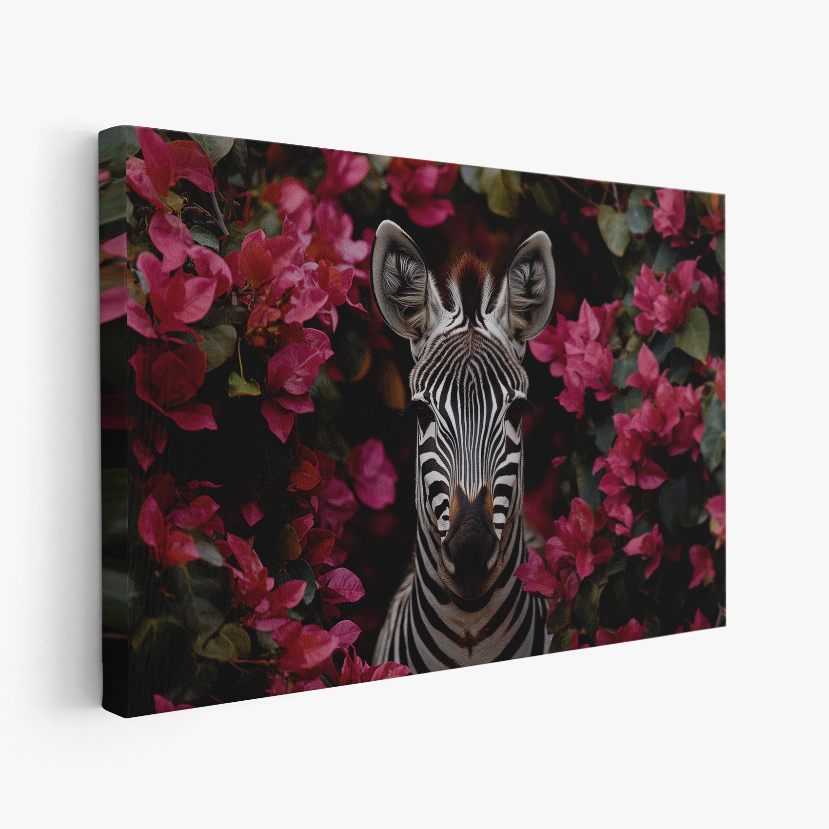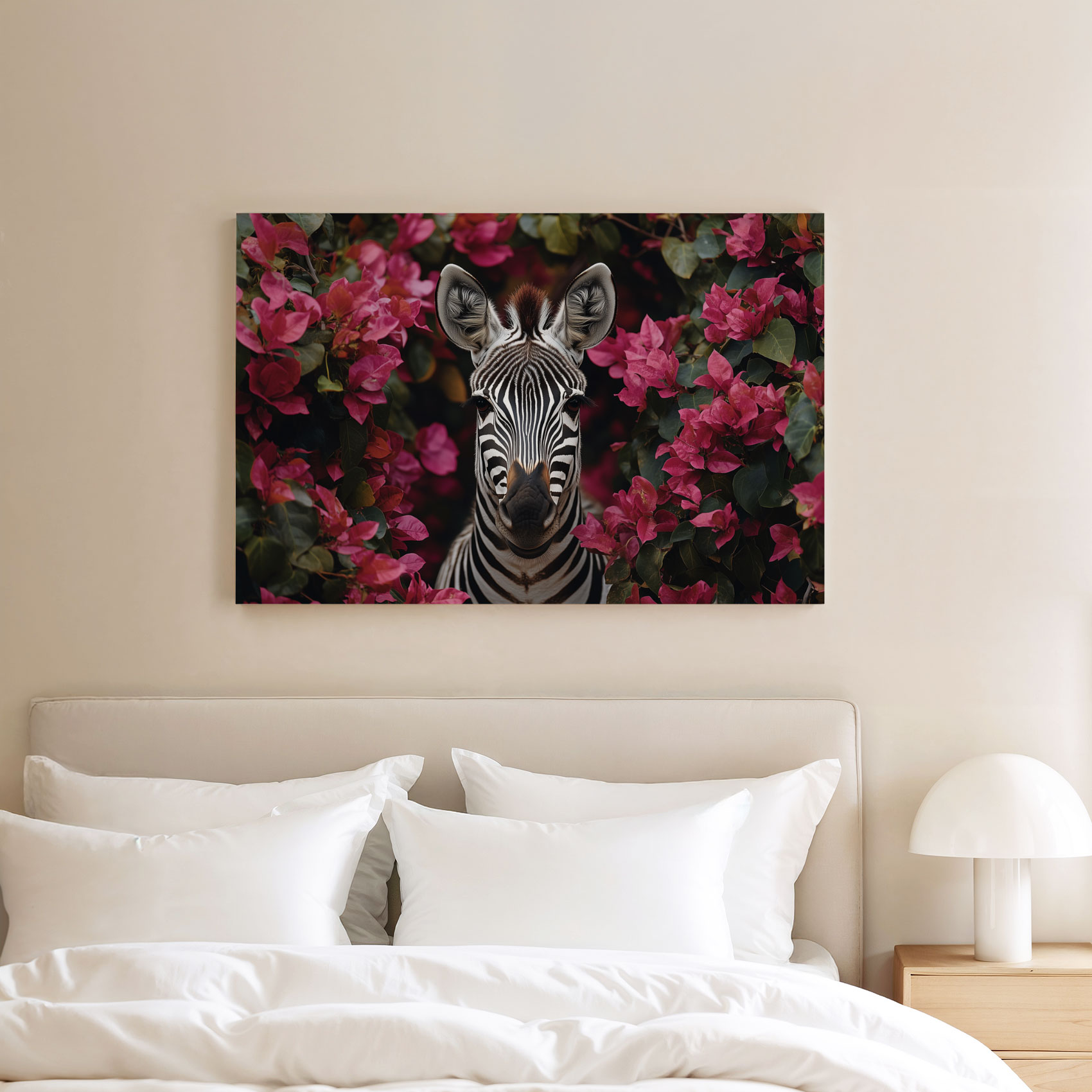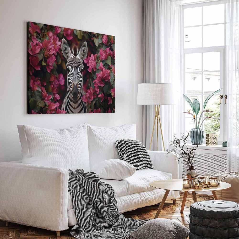 Terug naar collectie / Schilderijen / Bloemen Schilderij / Zebra tussen roze bloemen