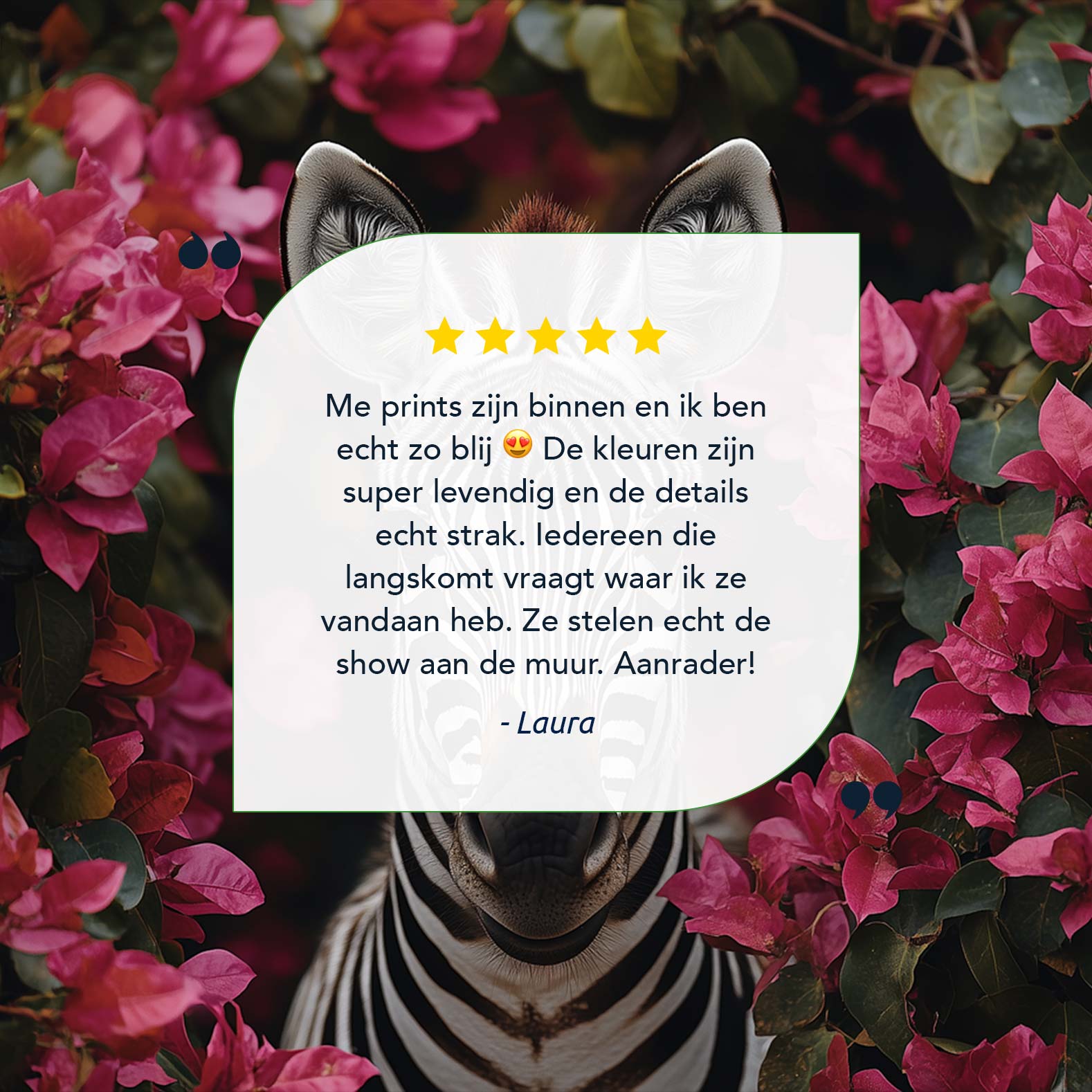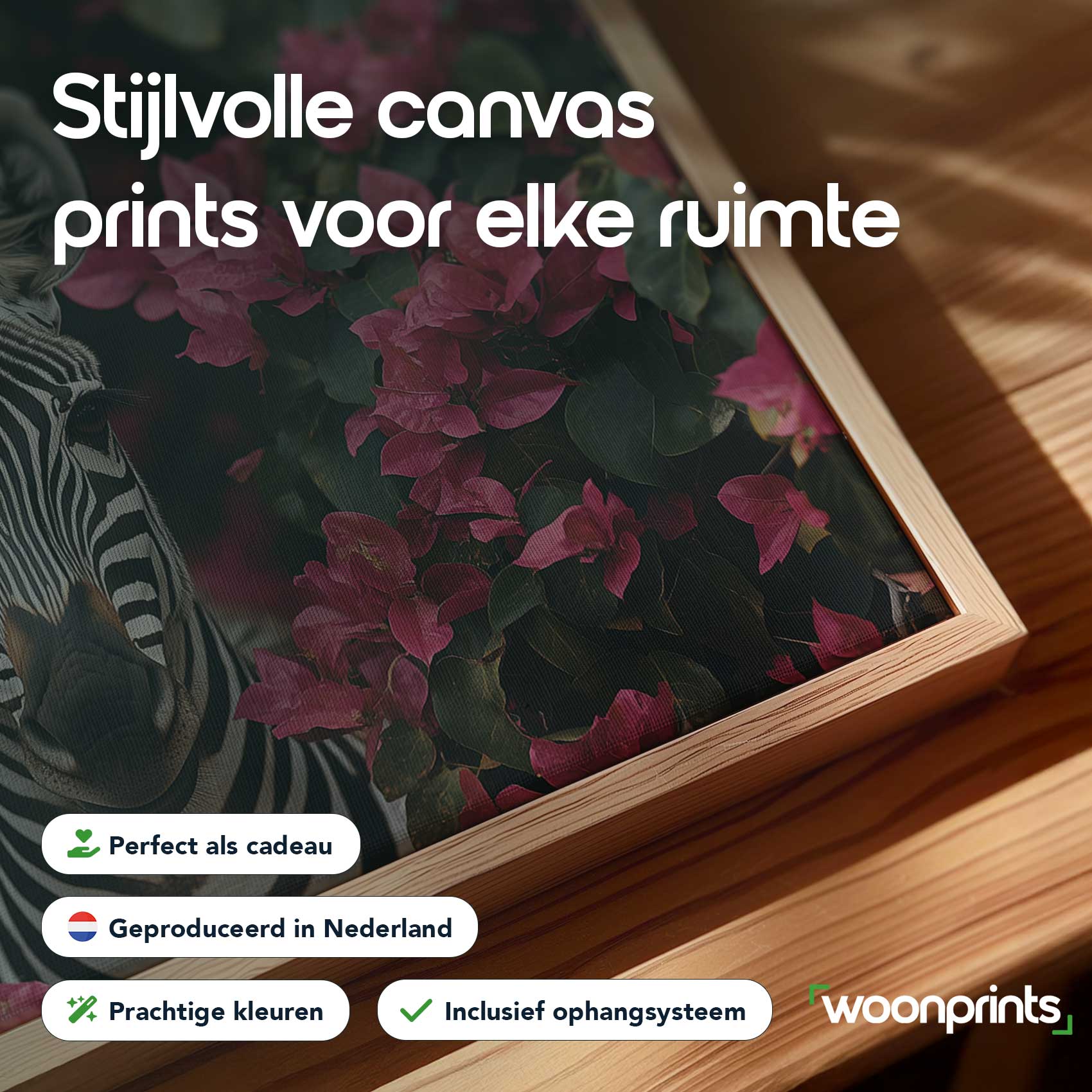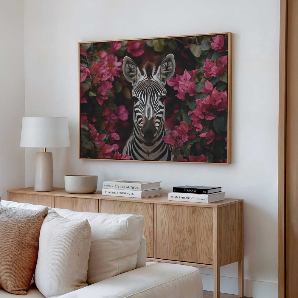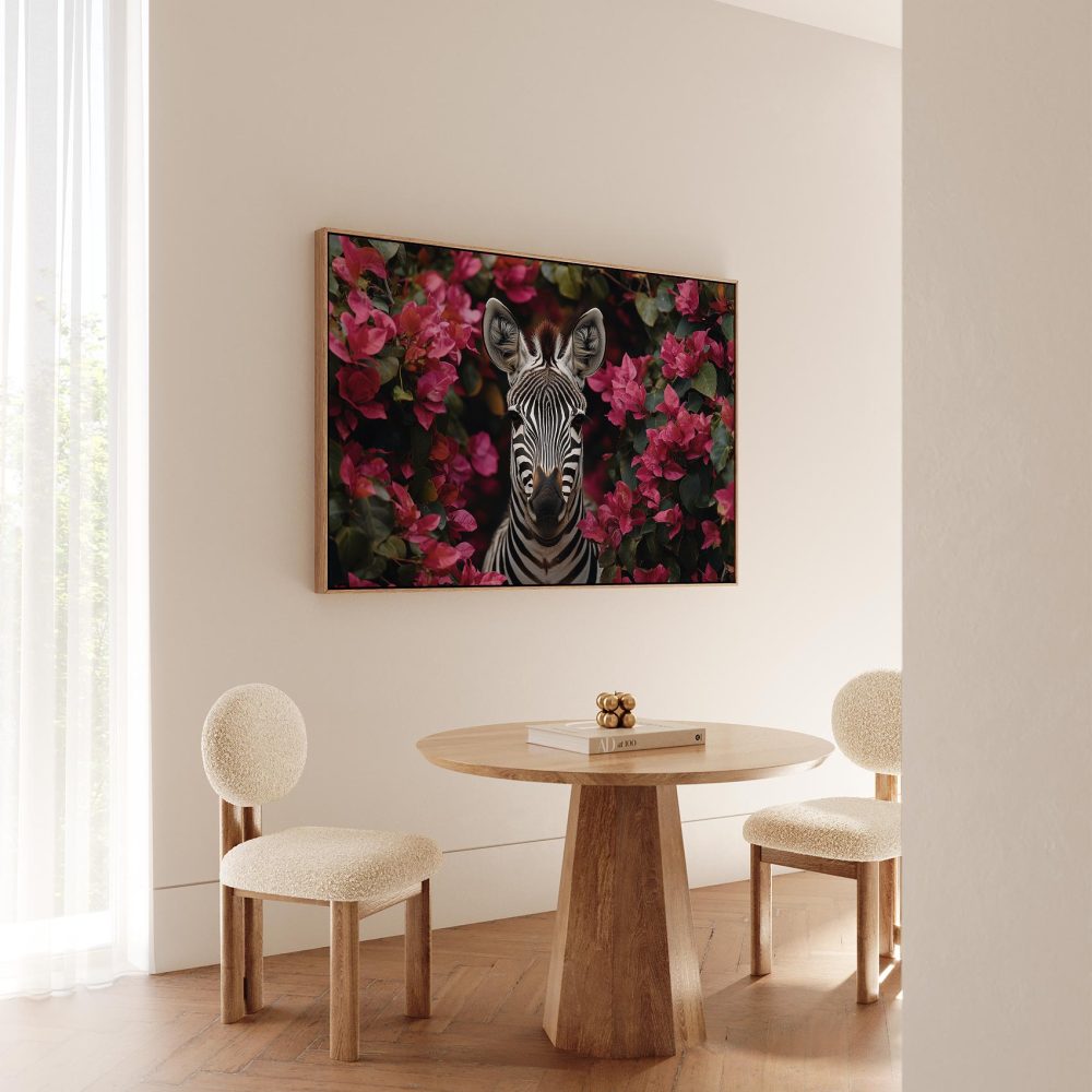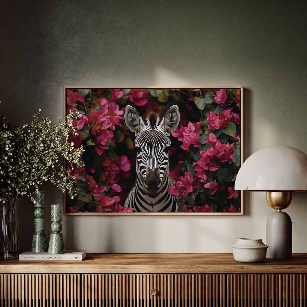 Terug naar collectie / Schilderijen / Bloemen Schilderij / Zebra tussen roze bloemen