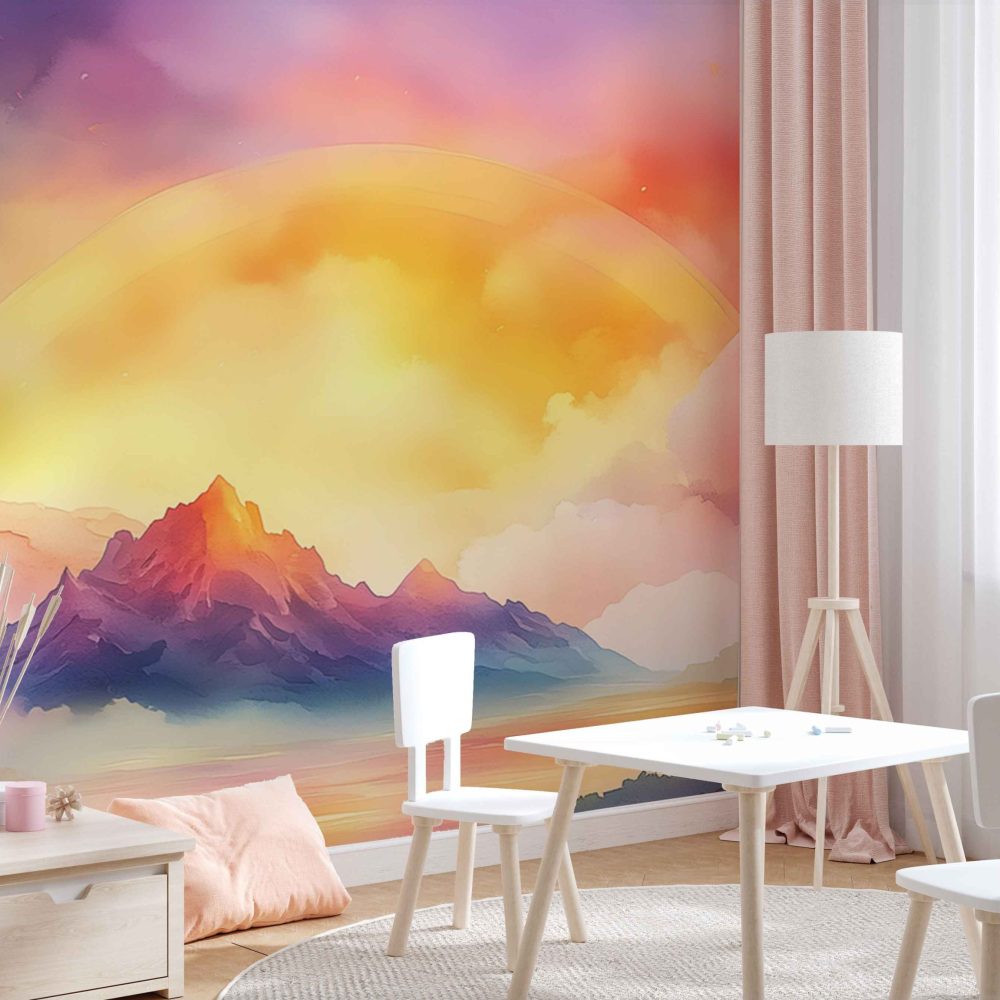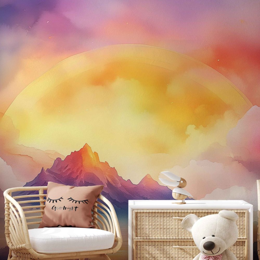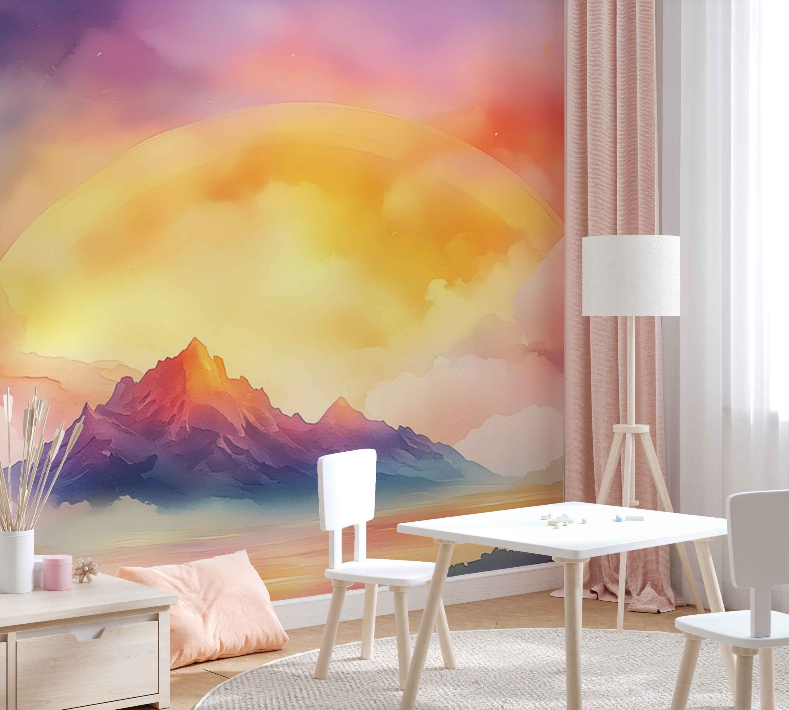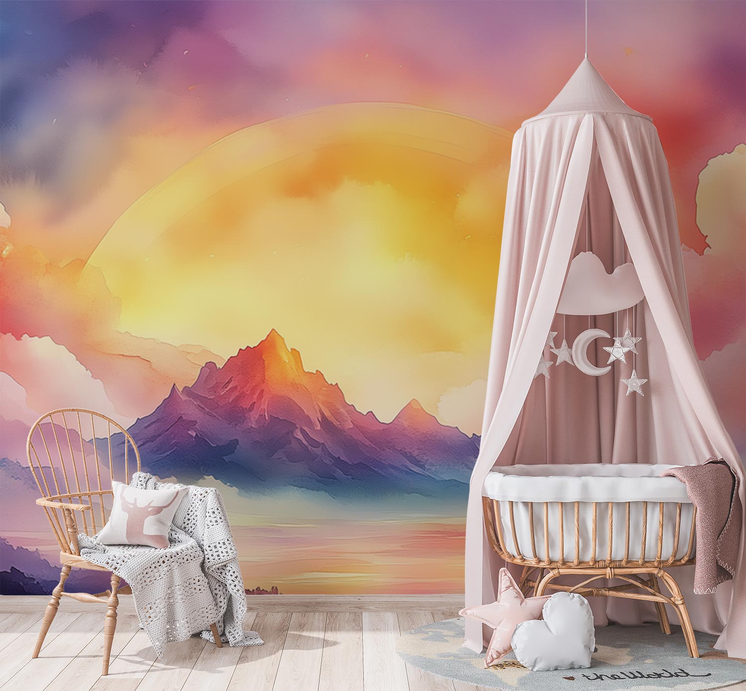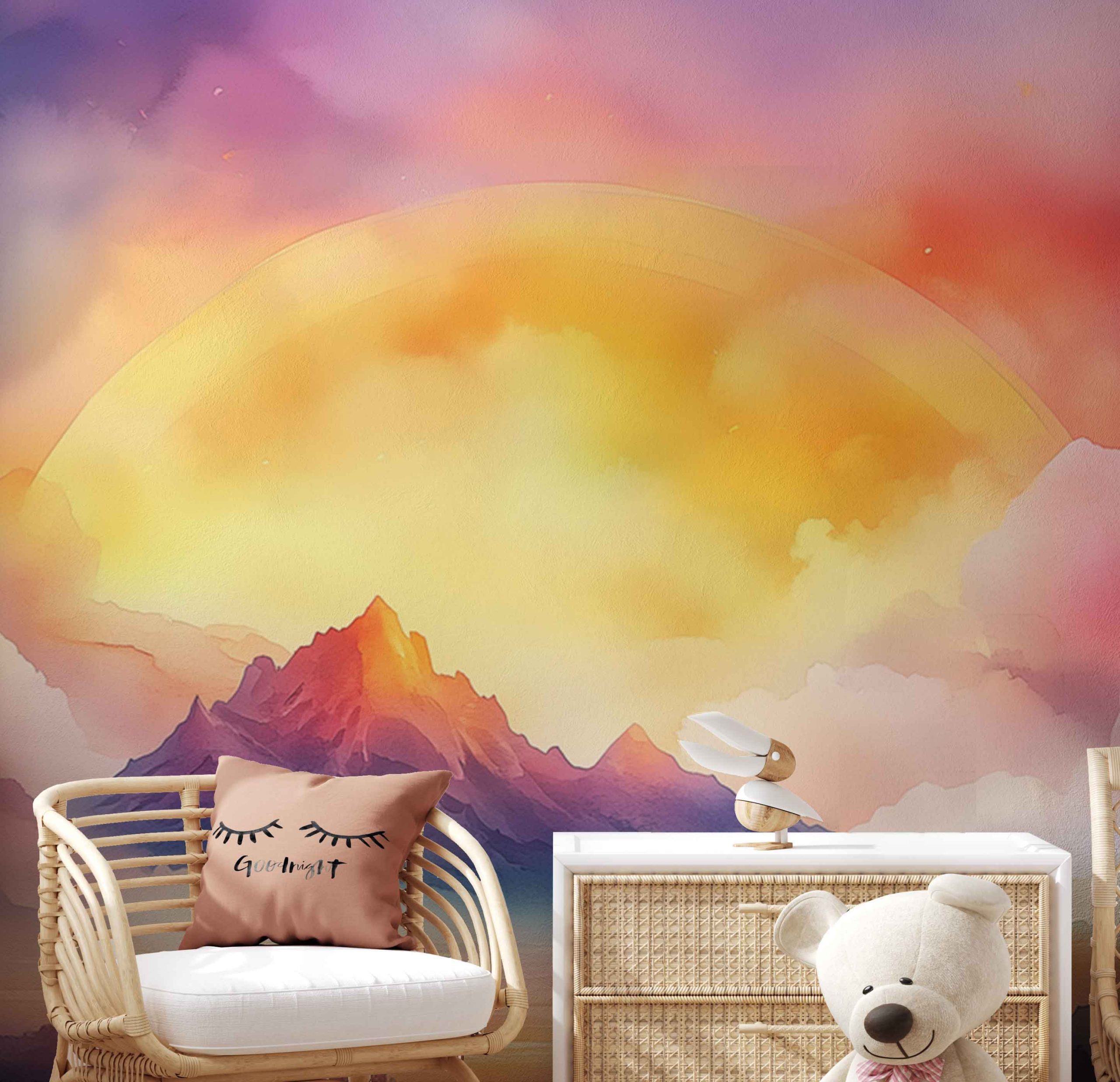 Terug naar collectie / Behang / Kinderkamer behang / Babykamer behang / Zonnig berglandschap waterverfschilderij behang