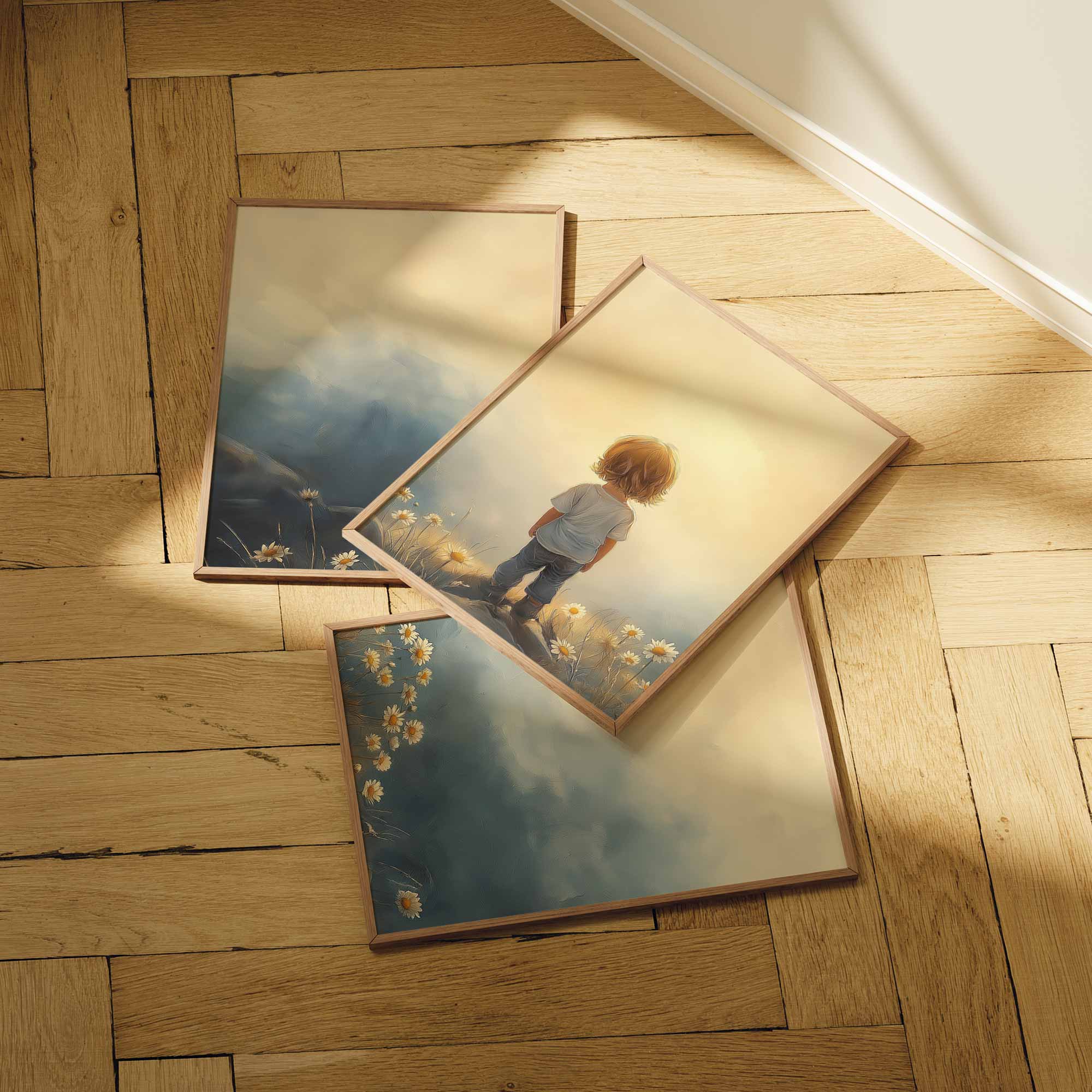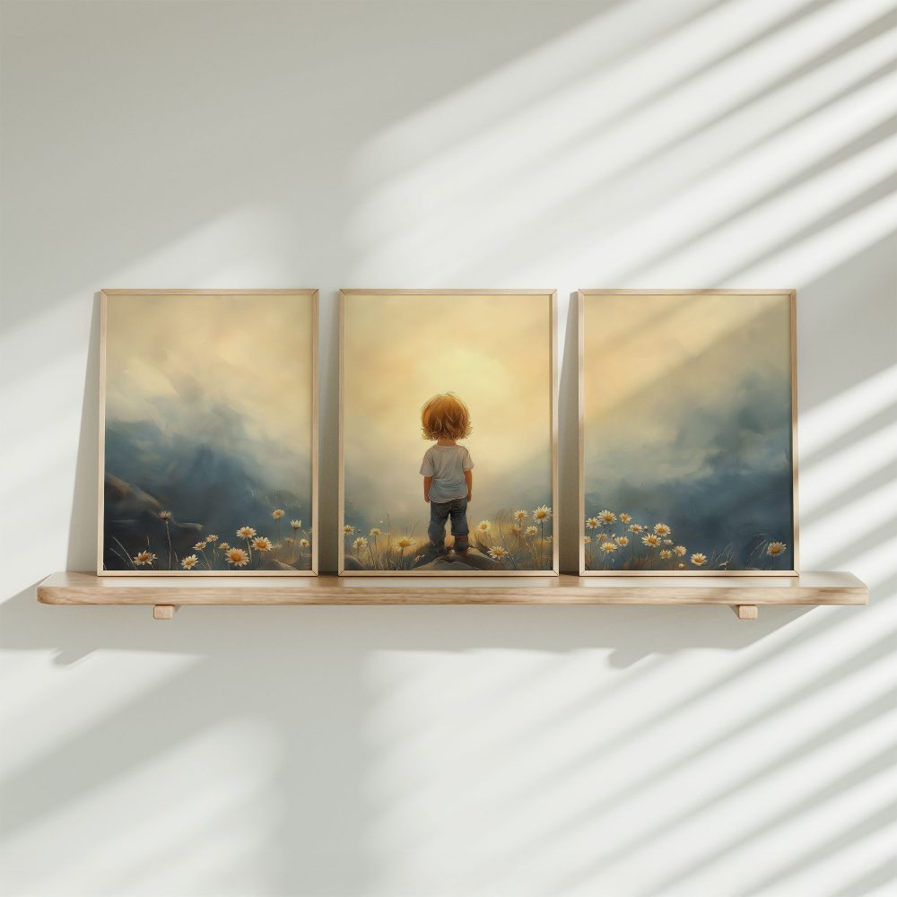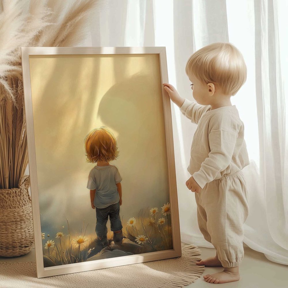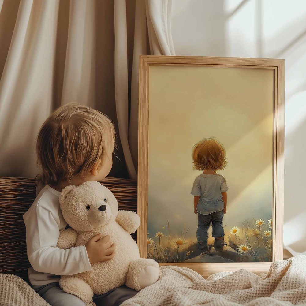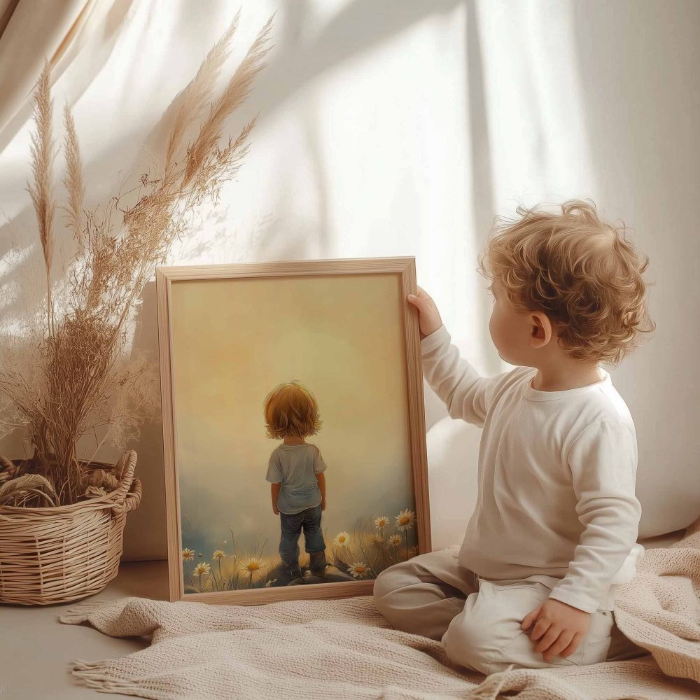 Terug naar collectie / Kinderkamer posters / Bloemen posters / Zonnig Bloeiend Landschap met Speels Kind