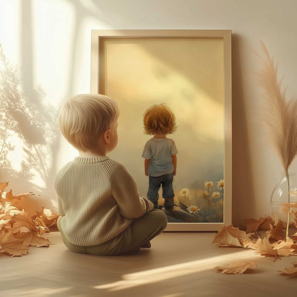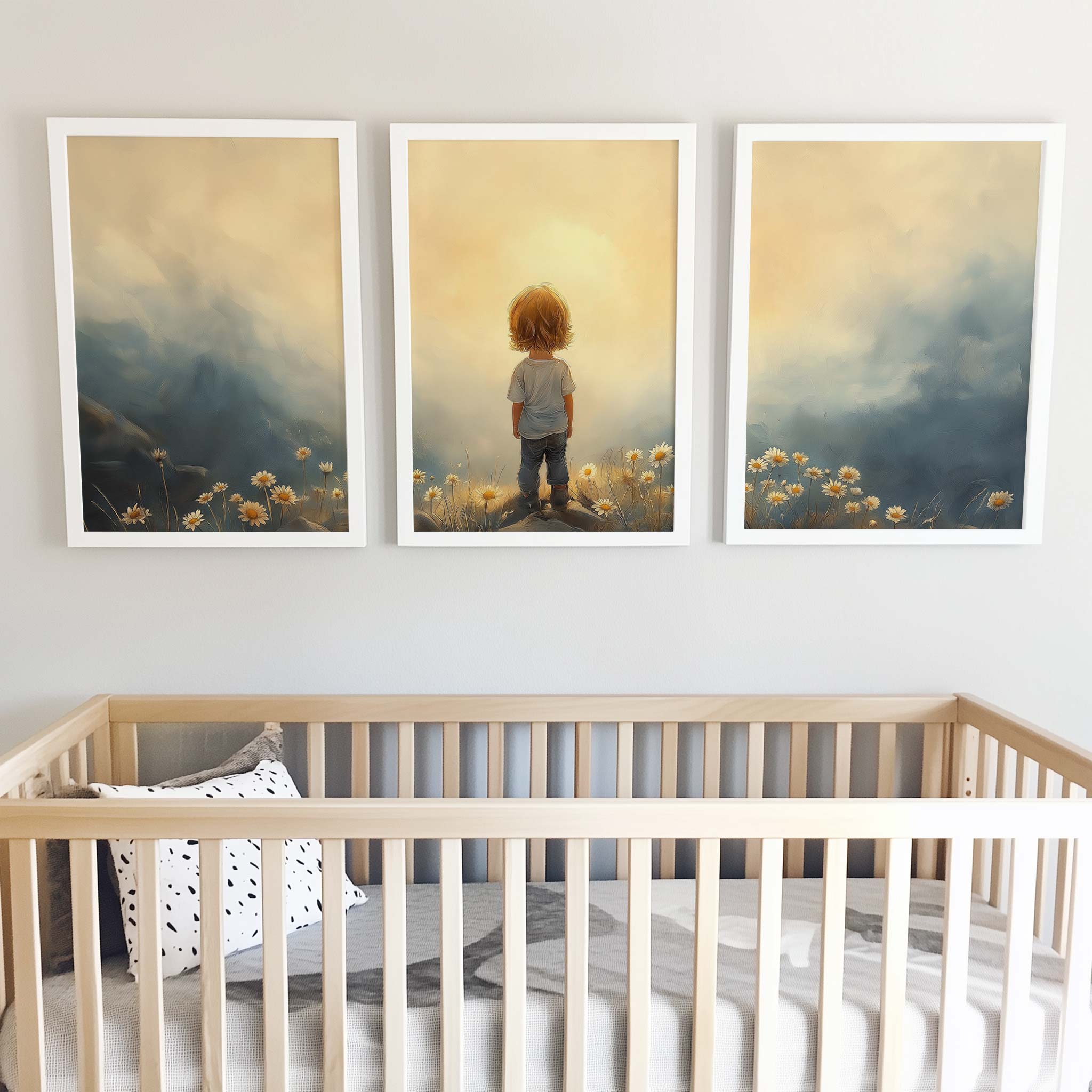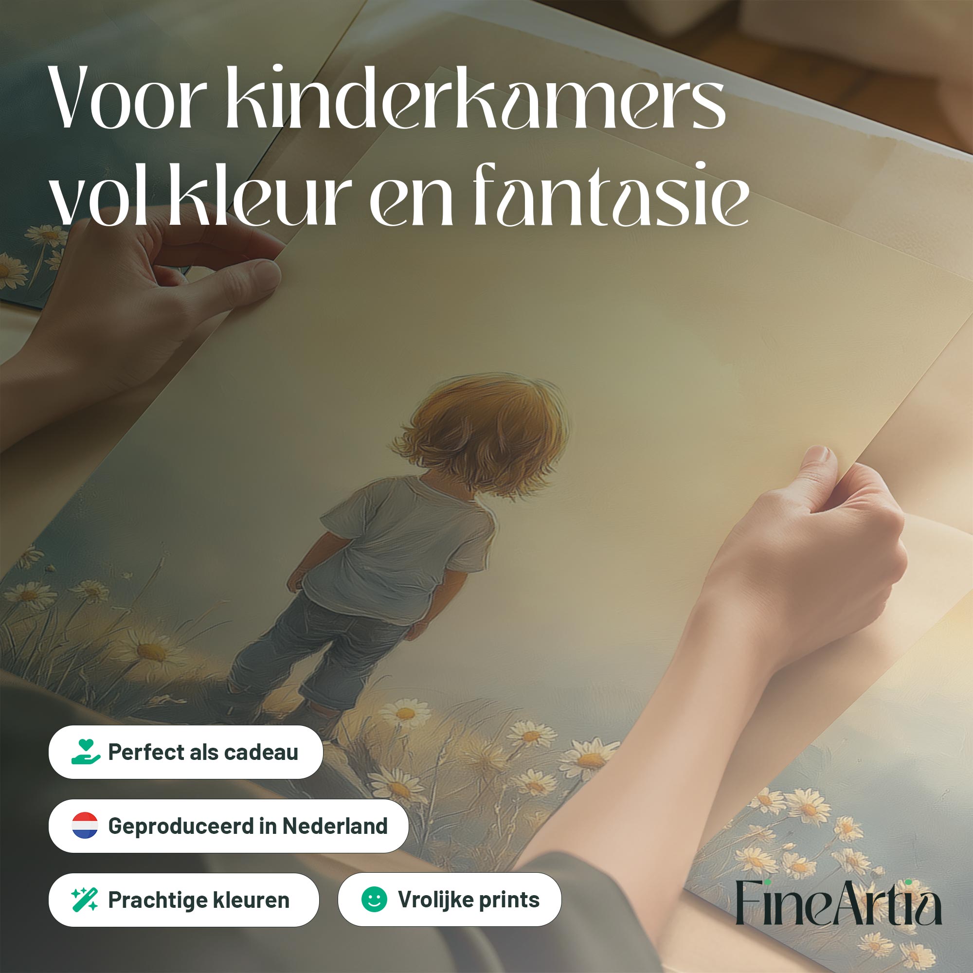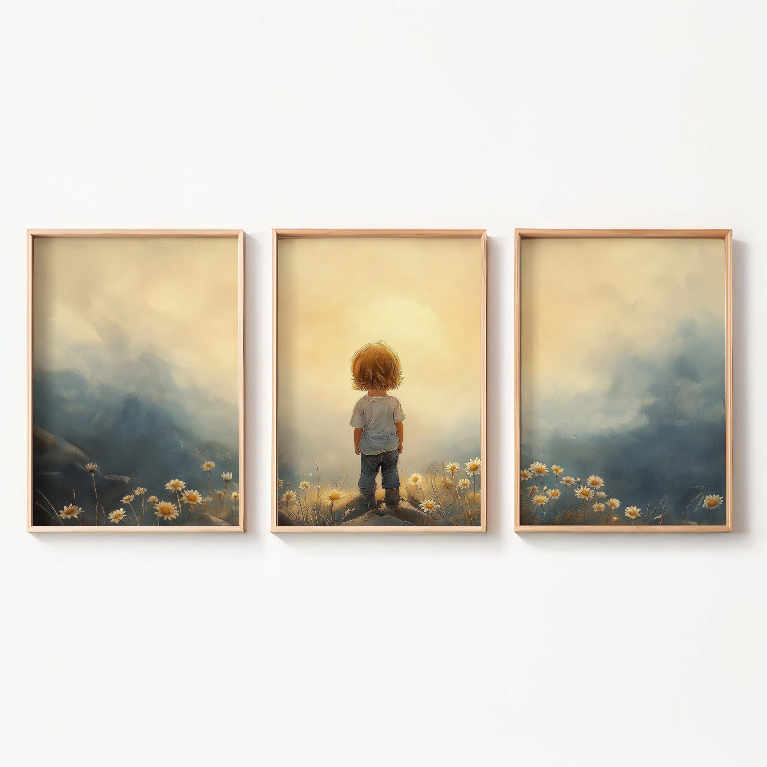 Terug naar collectie / Kinderkamer posters / Bloemen posters / Zonnig Bloeiend Landschap met Speels Kind