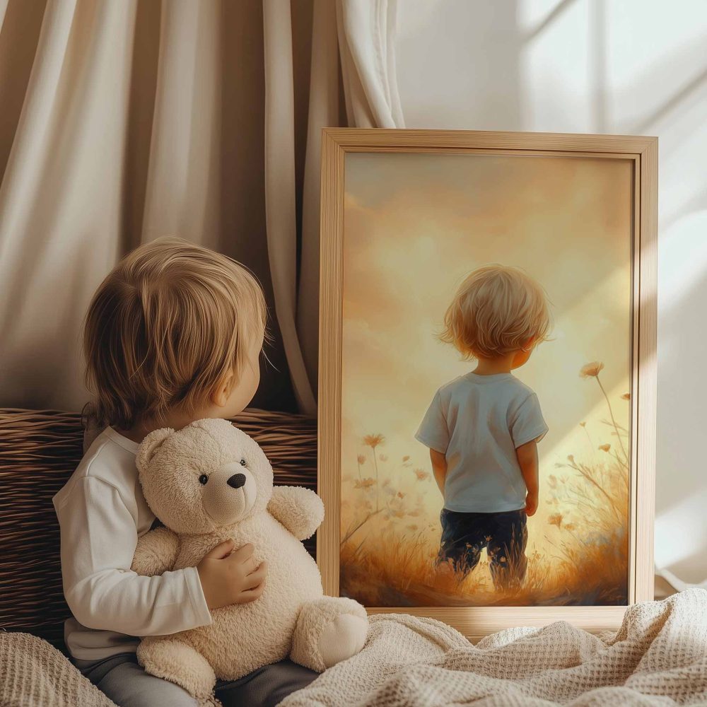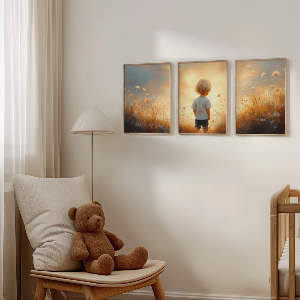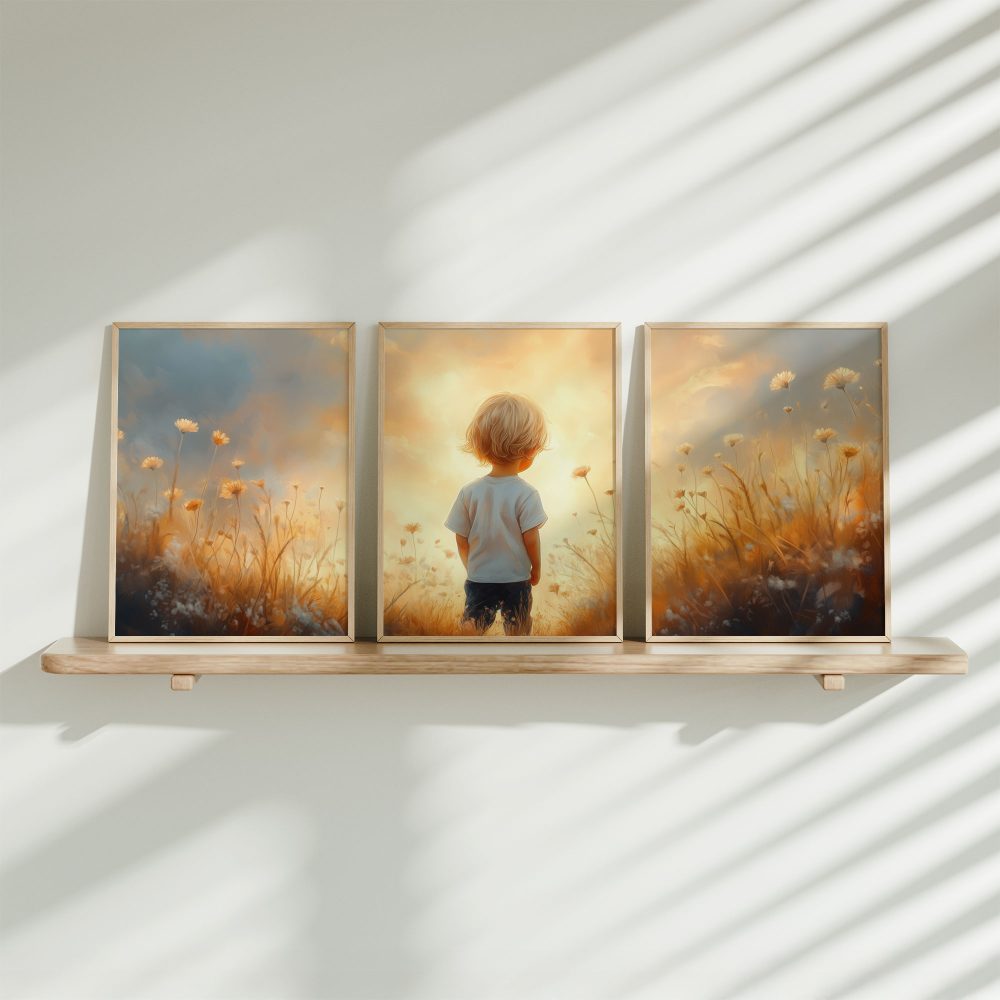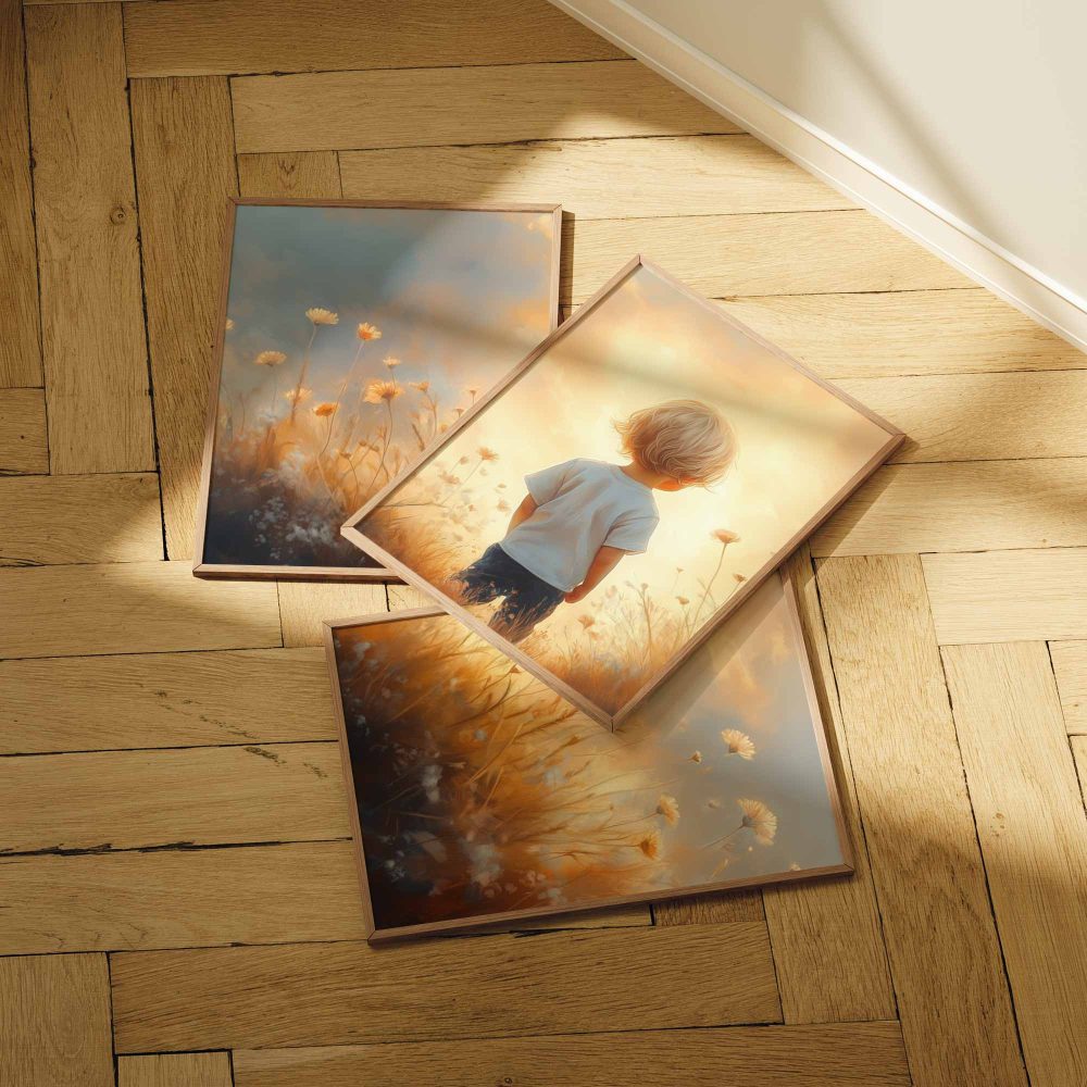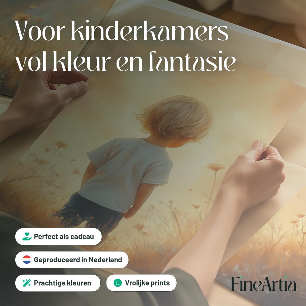 Terug naar collectie / Kinderkamer posters / Bloemen posters / Zonnig Bloemenveld met Dromerige Jongen