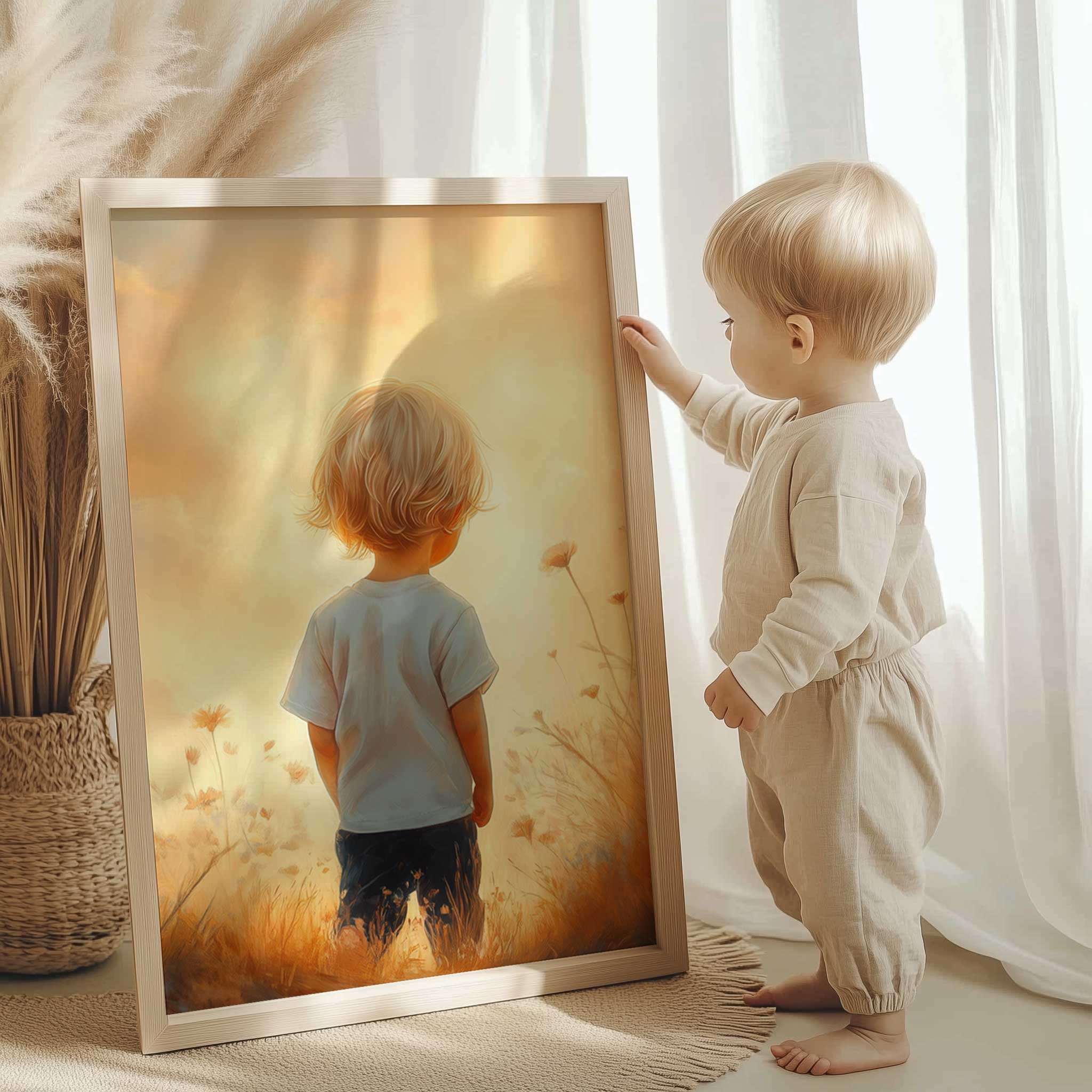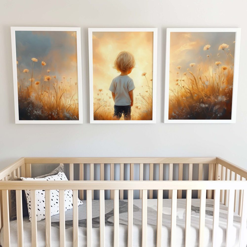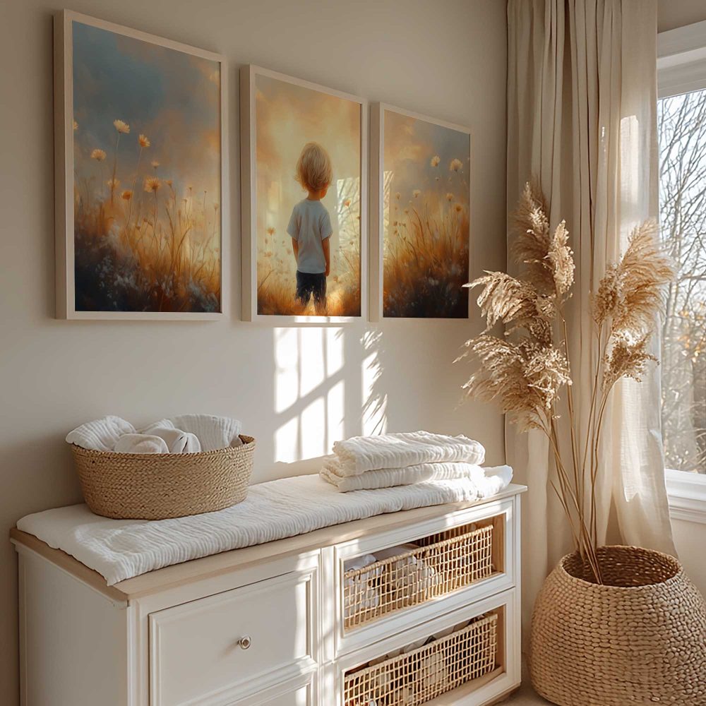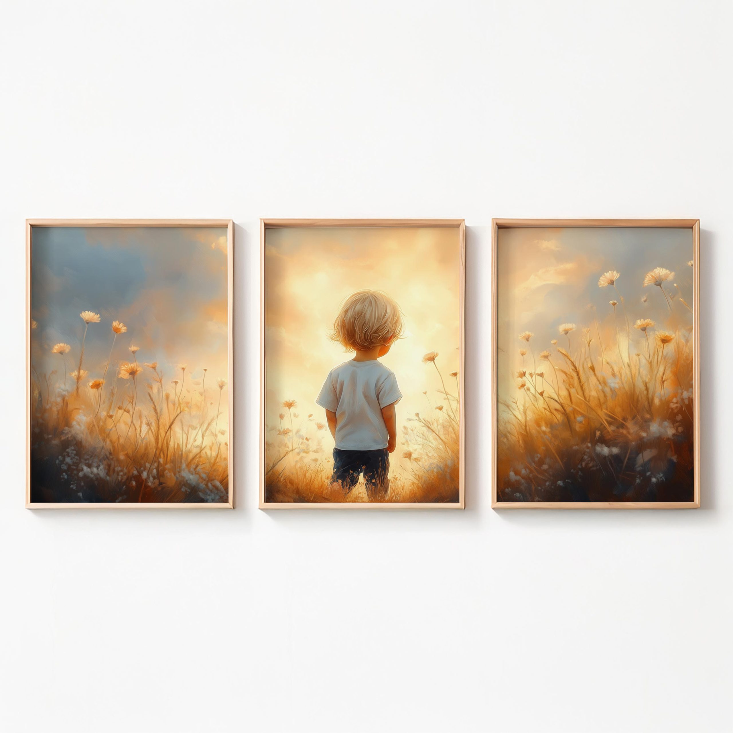 Terug naar collectie / Kinderkamer posters / Bloemen posters / Zonnig Bloemenveld met Dromerige Jongen