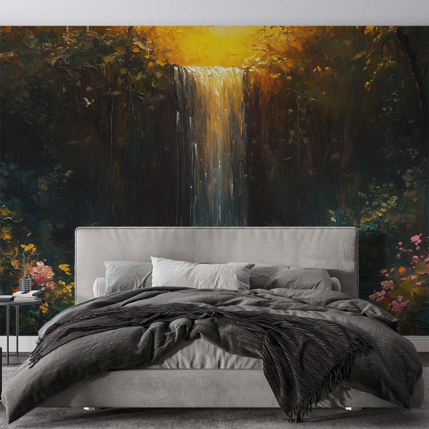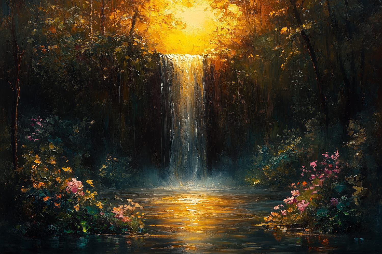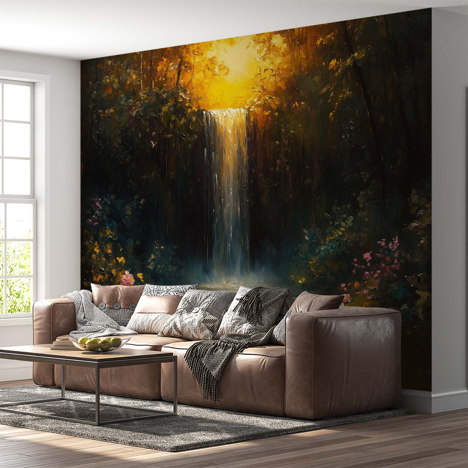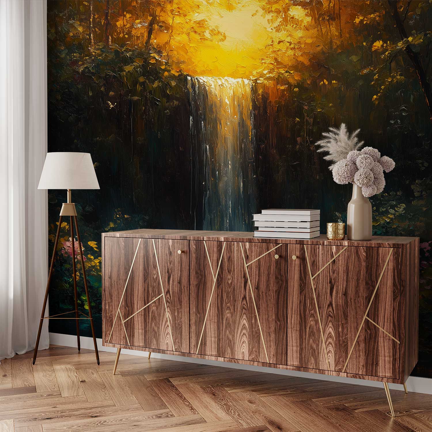 Zonnig boswaterval schilderij behang