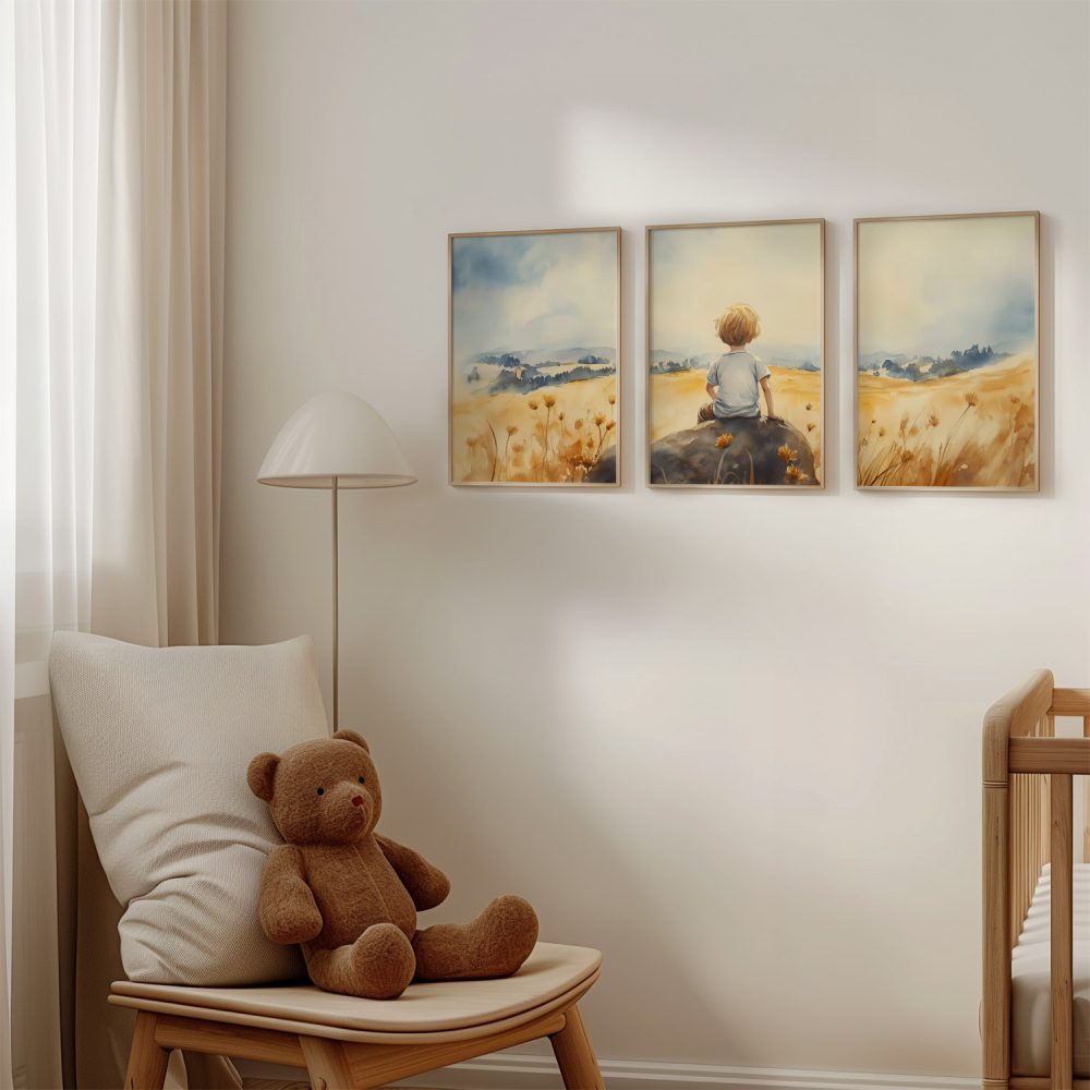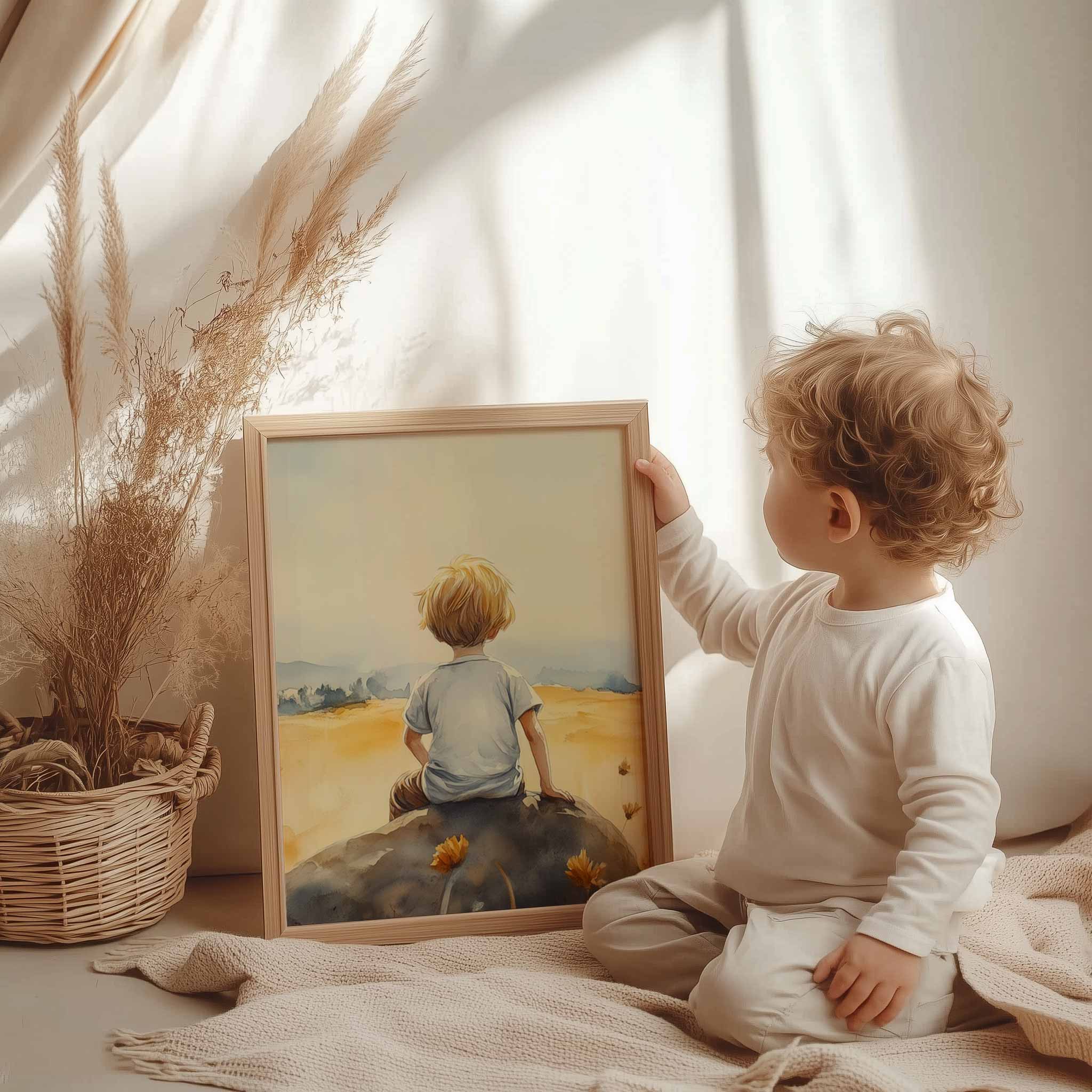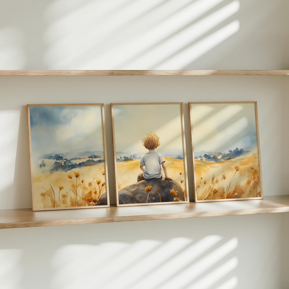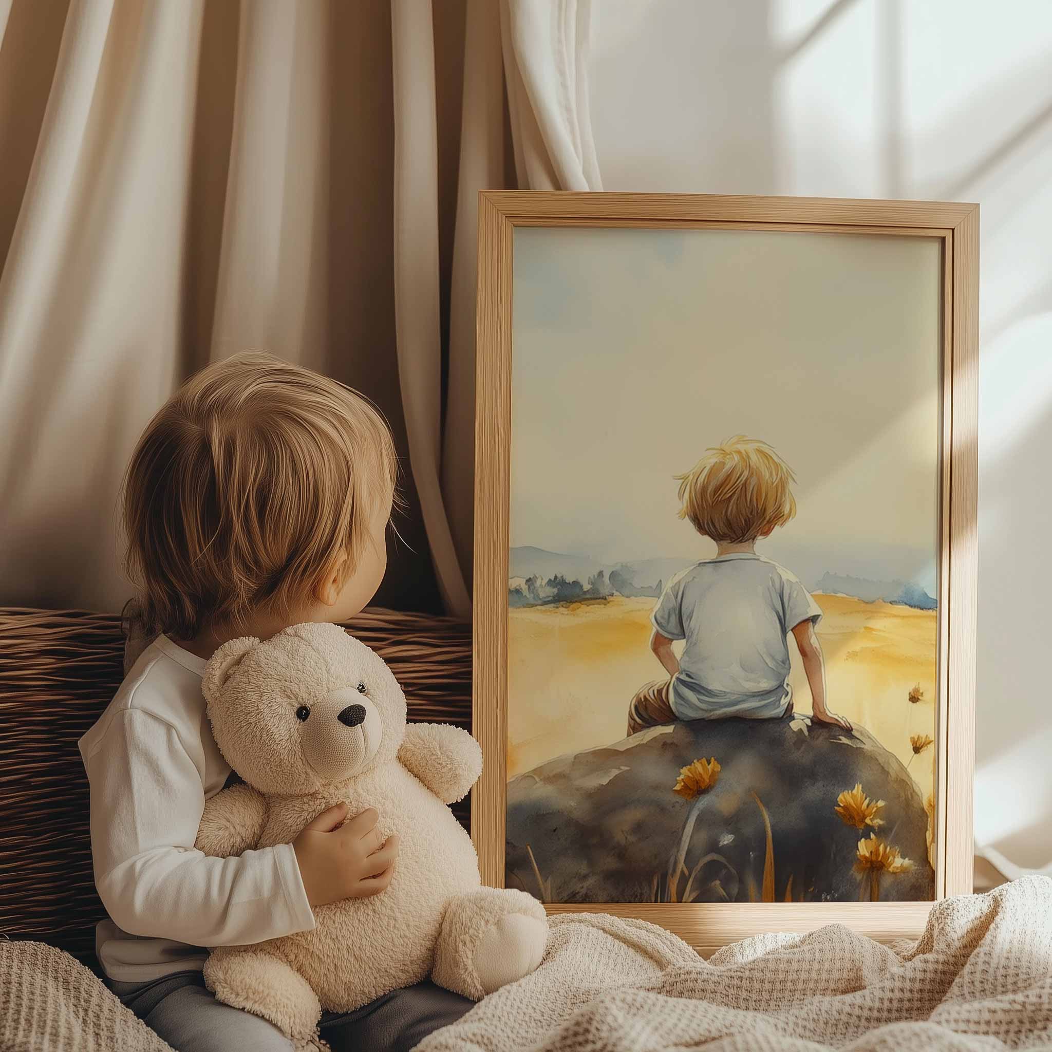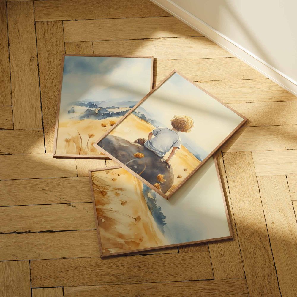 Terug naar collectie / Kinderkamer posters / Avontuurlijk posters / Zonnig jongetje in bloemenveld – Dromerig waterverfschilderij