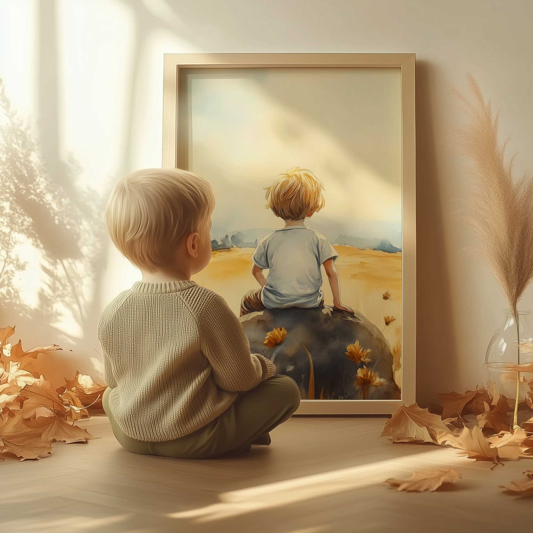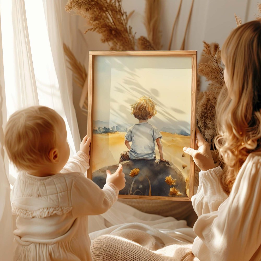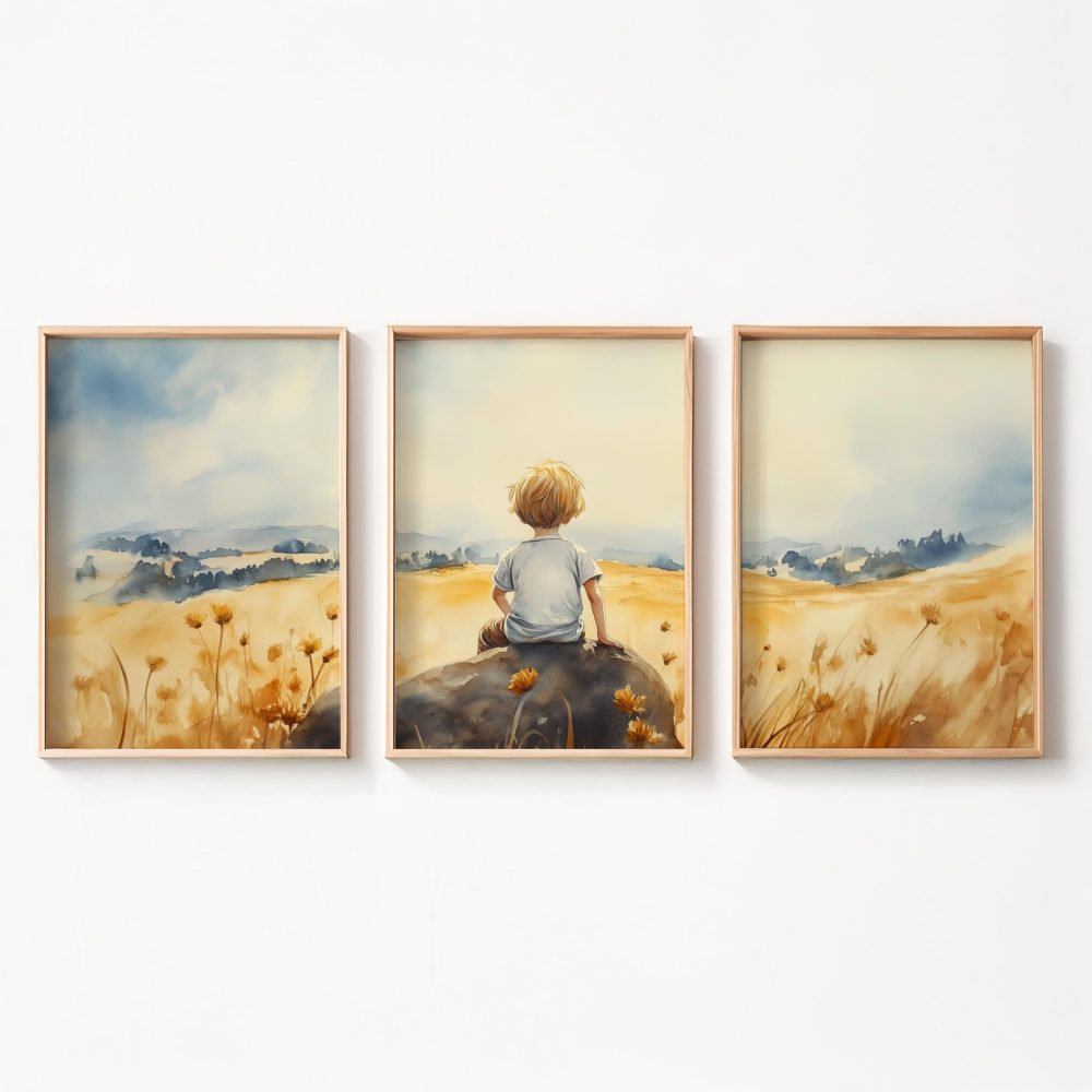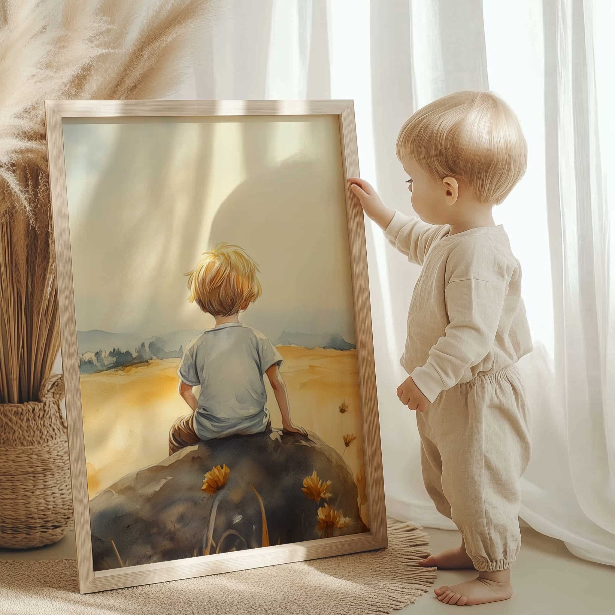 Terug naar collectie / Kinderkamer posters / Avontuurlijk posters / Zonnig jongetje in bloemenveld – Dromerig waterverfschilderij