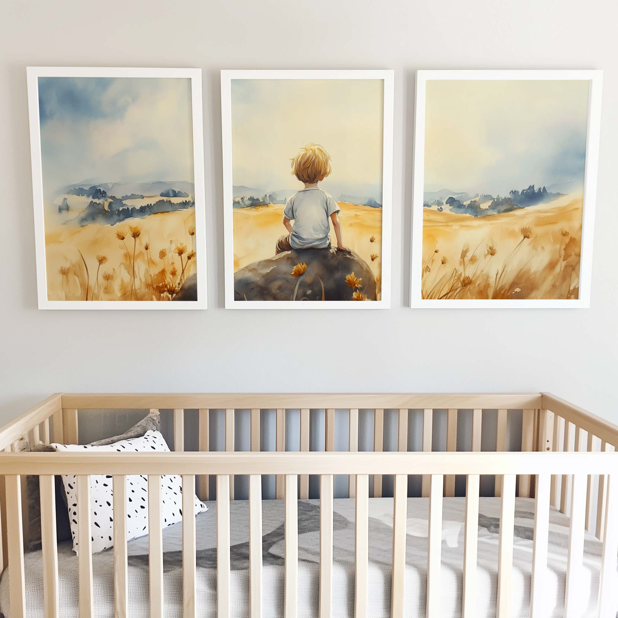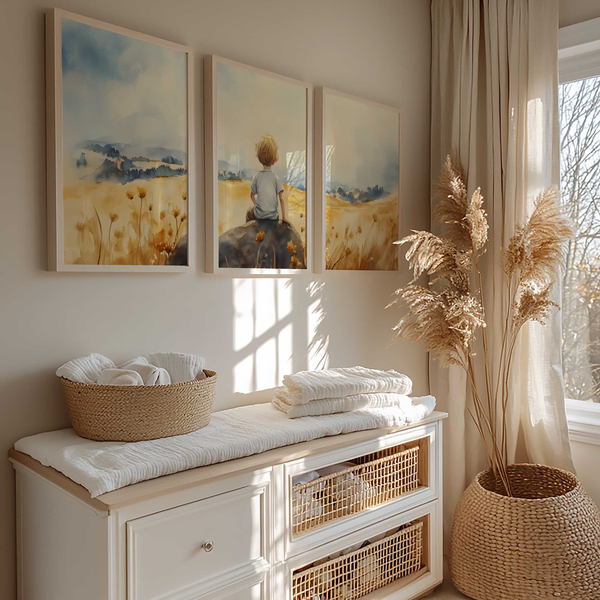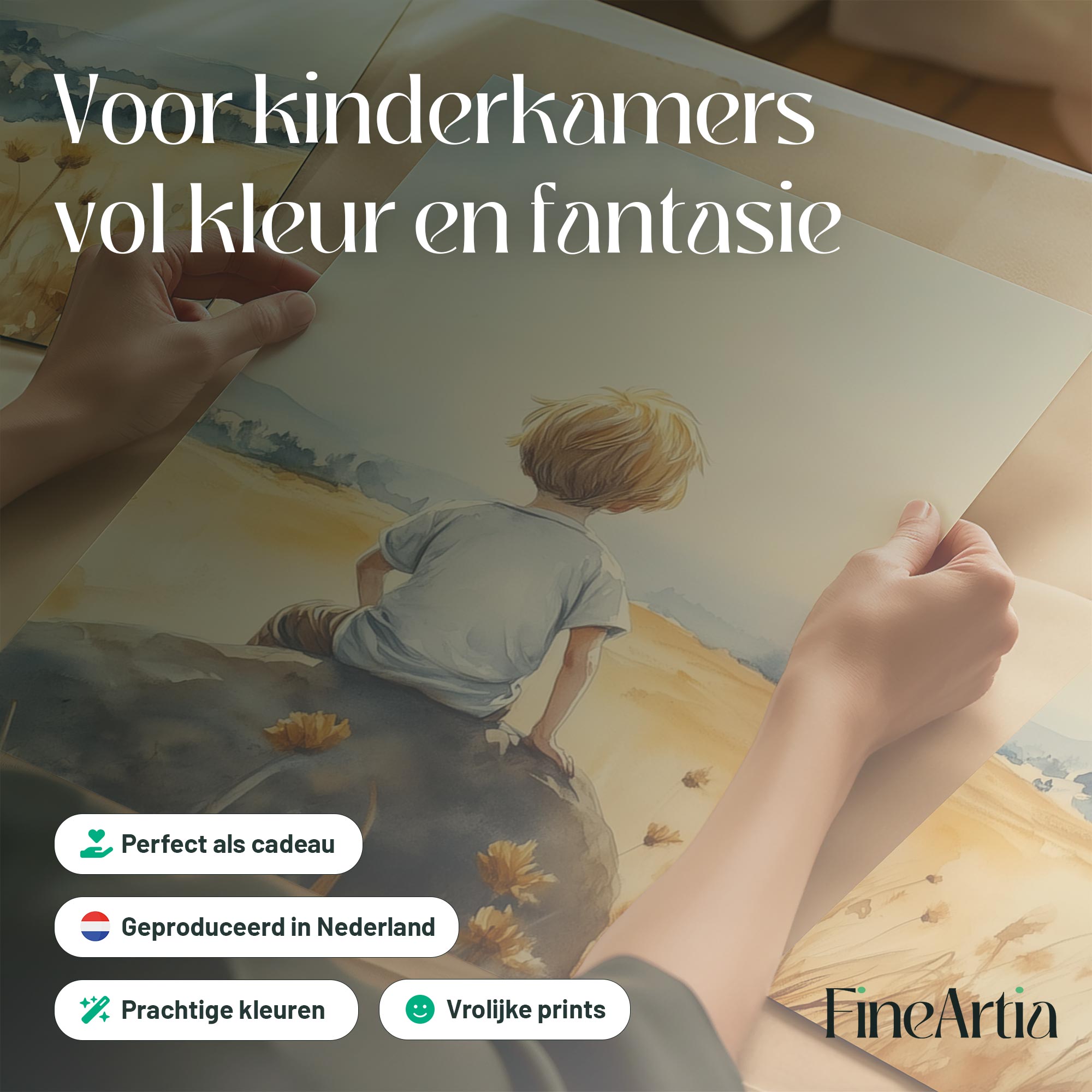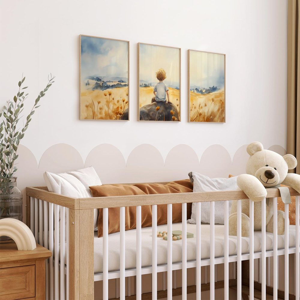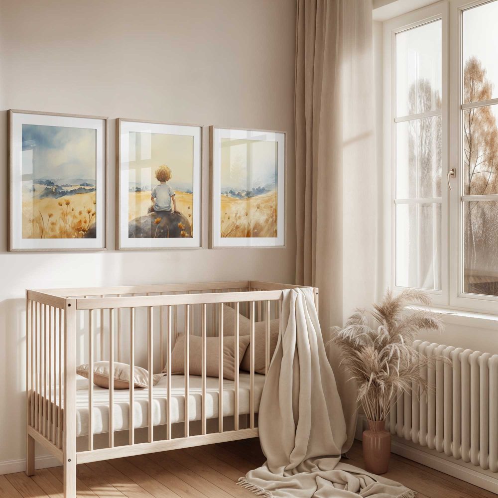 Terug naar collectie / Kinderkamer posters / Avontuurlijk posters / Zonnig jongetje in bloemenveld – Dromerig waterverfschilderij
