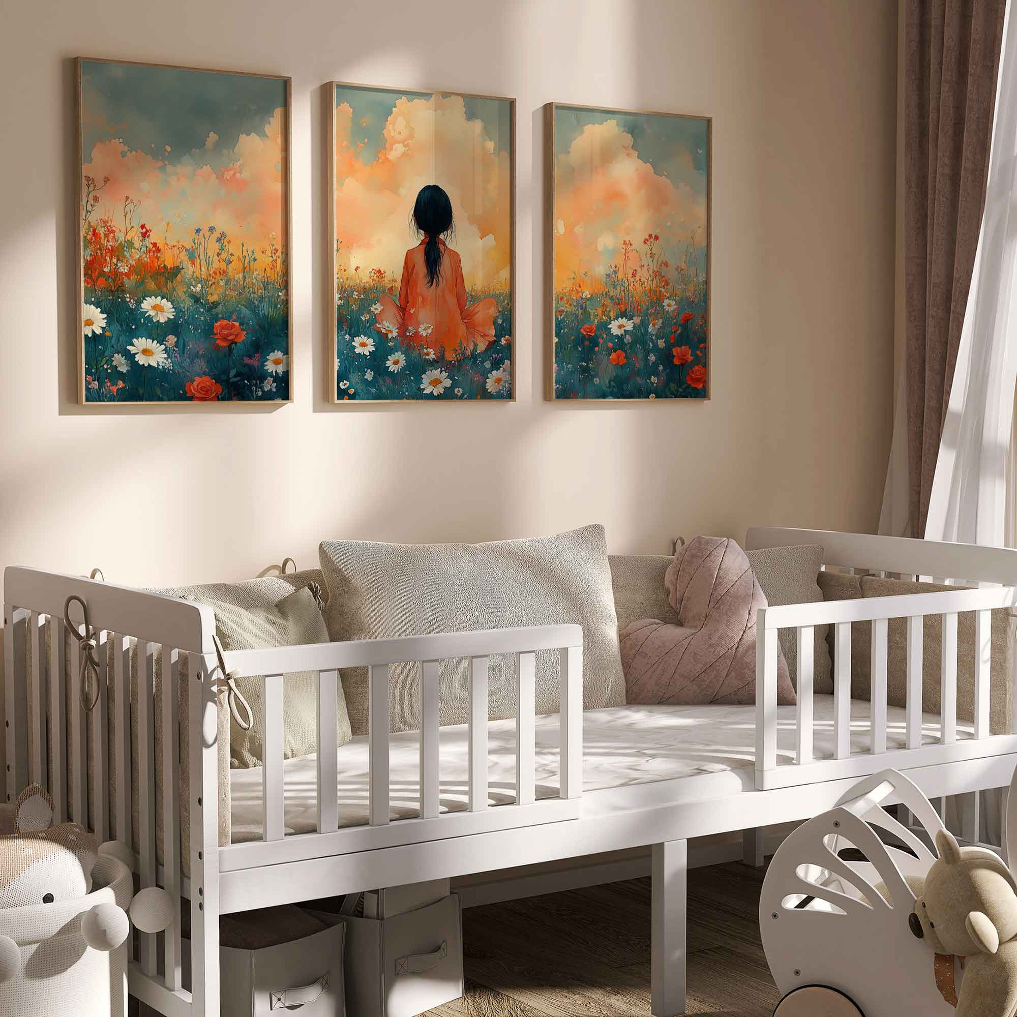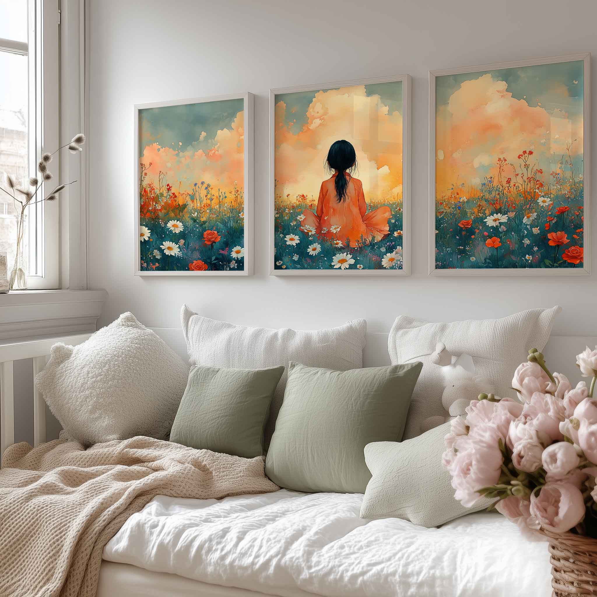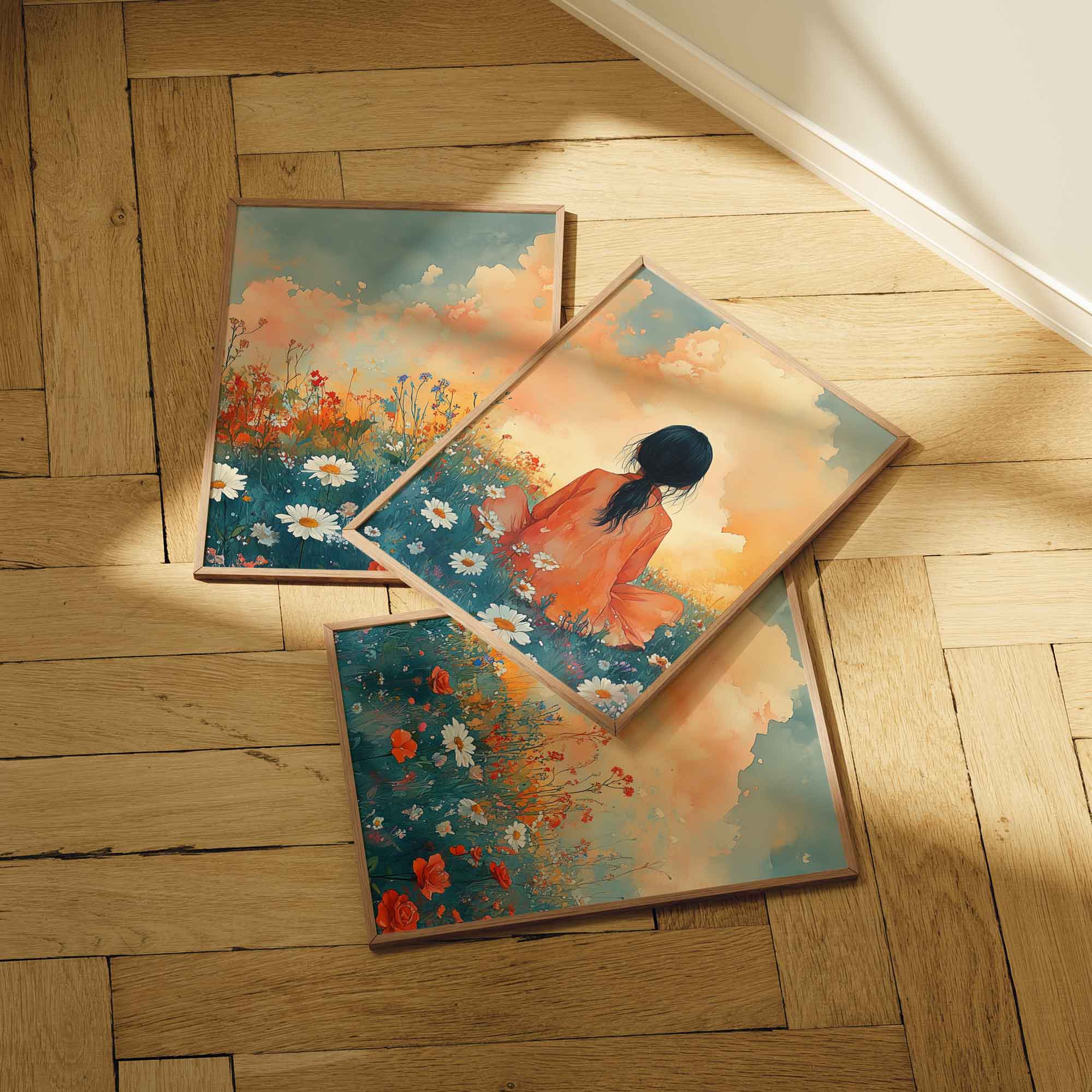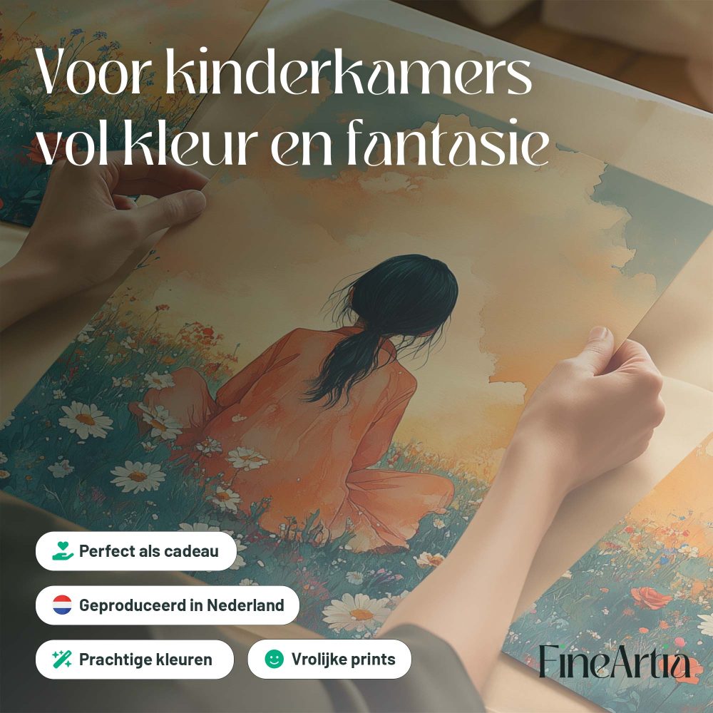 Terug naar collectie / Kinderkamer posters / Bloemen posters / Zonnig Meisje in Bloemenveld – Dromerig Waterverfschilderij
