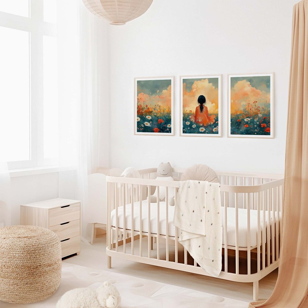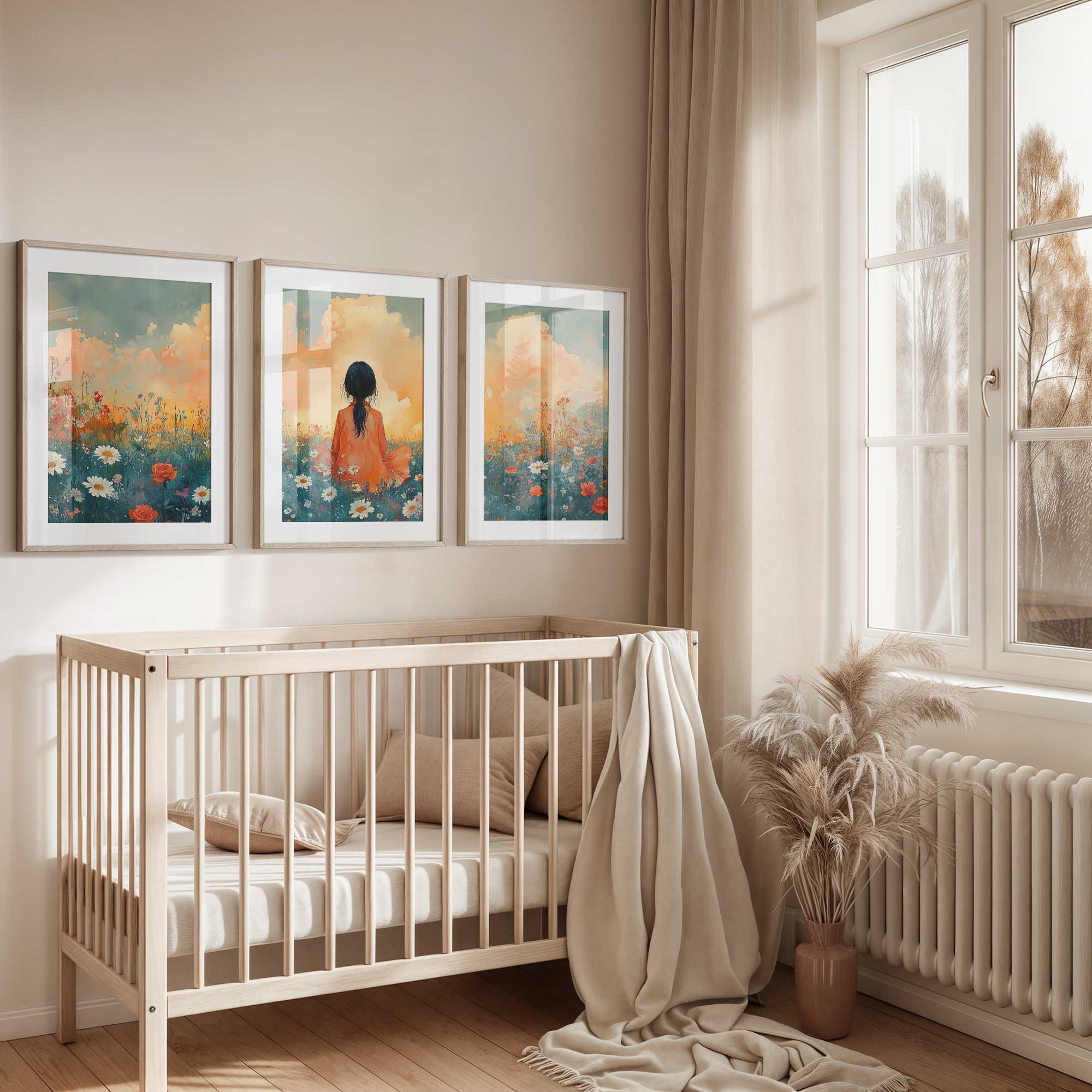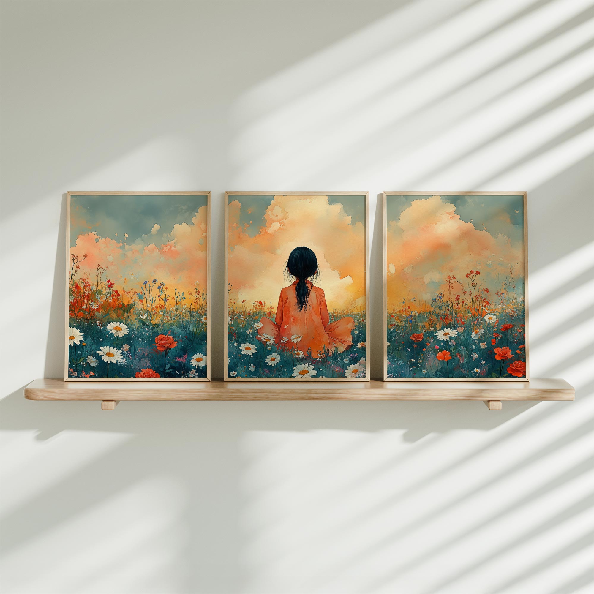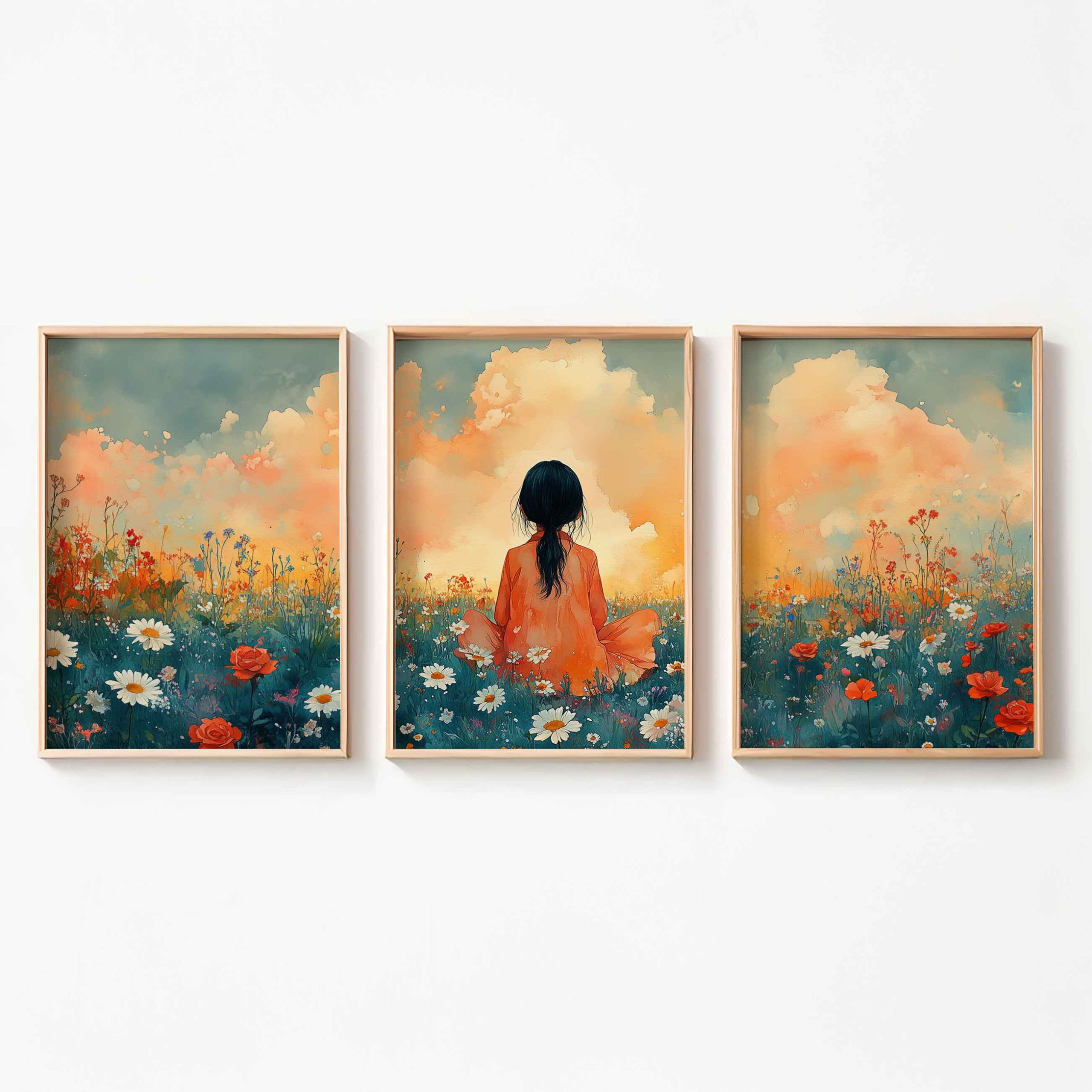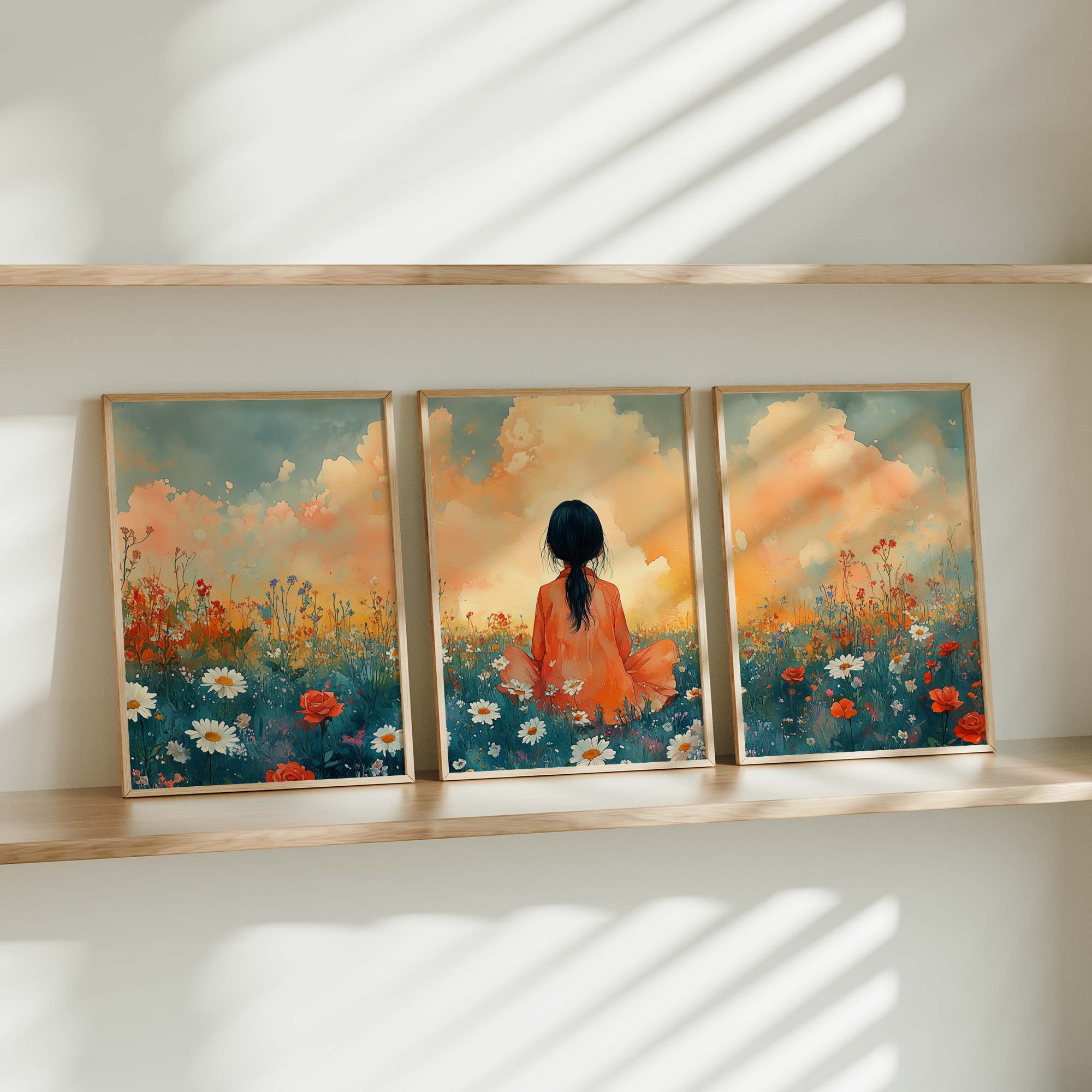 Terug naar collectie / Kinderkamer posters / Bloemen posters / Zonnig Meisje in Bloemenveld – Dromerig Waterverfschilderij