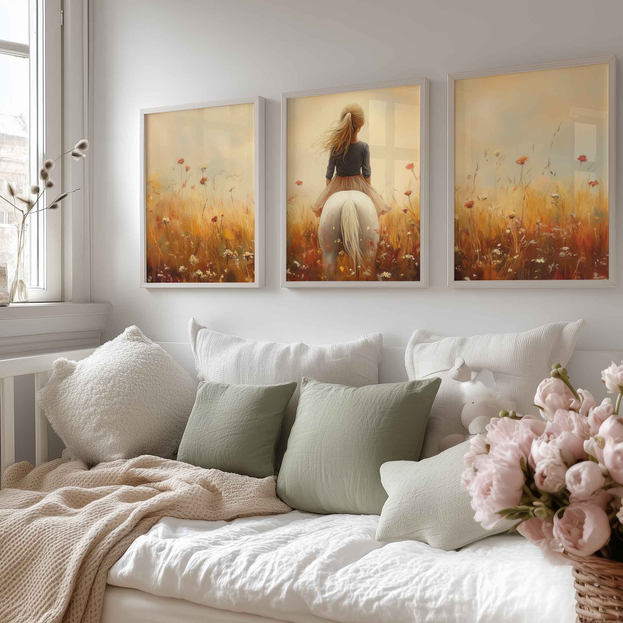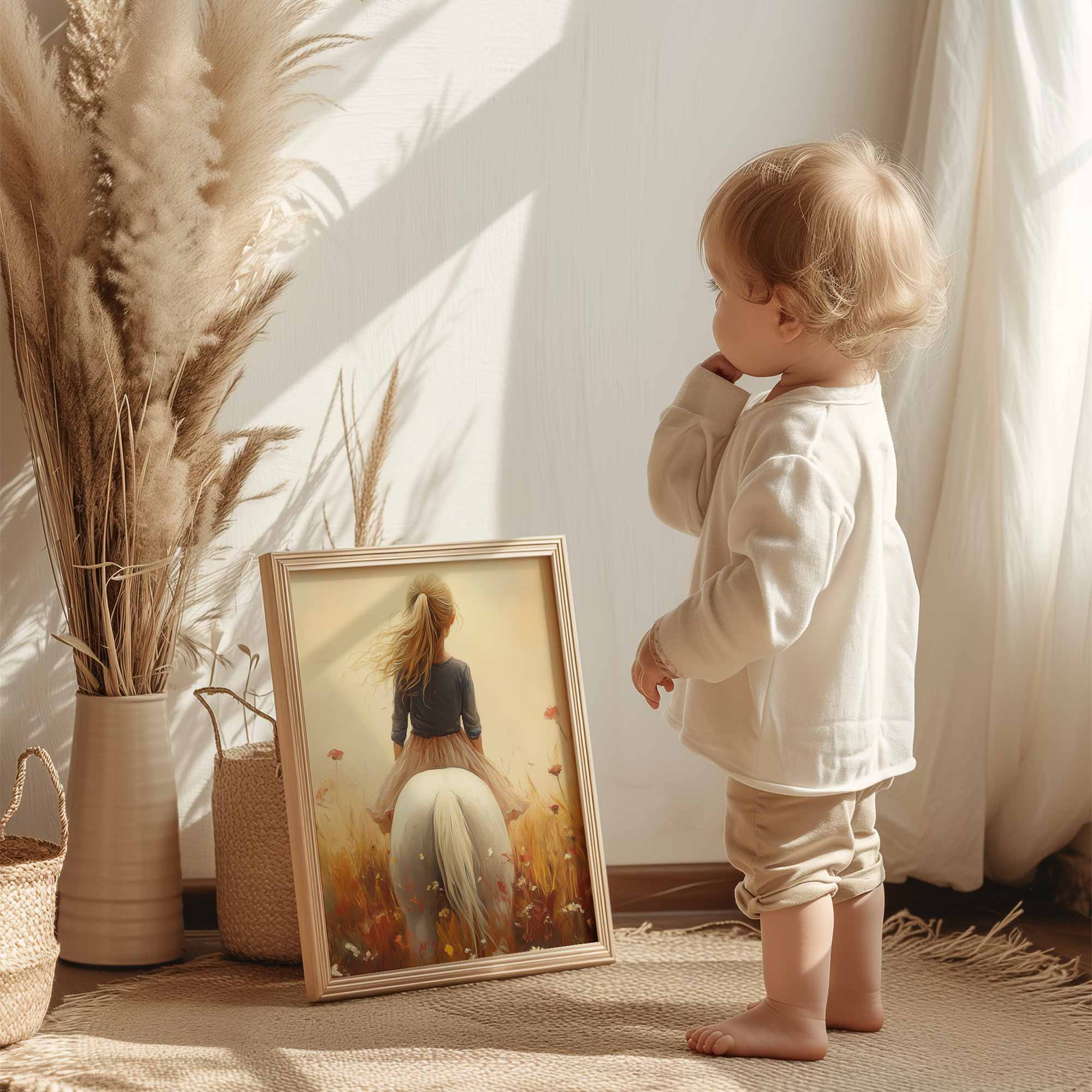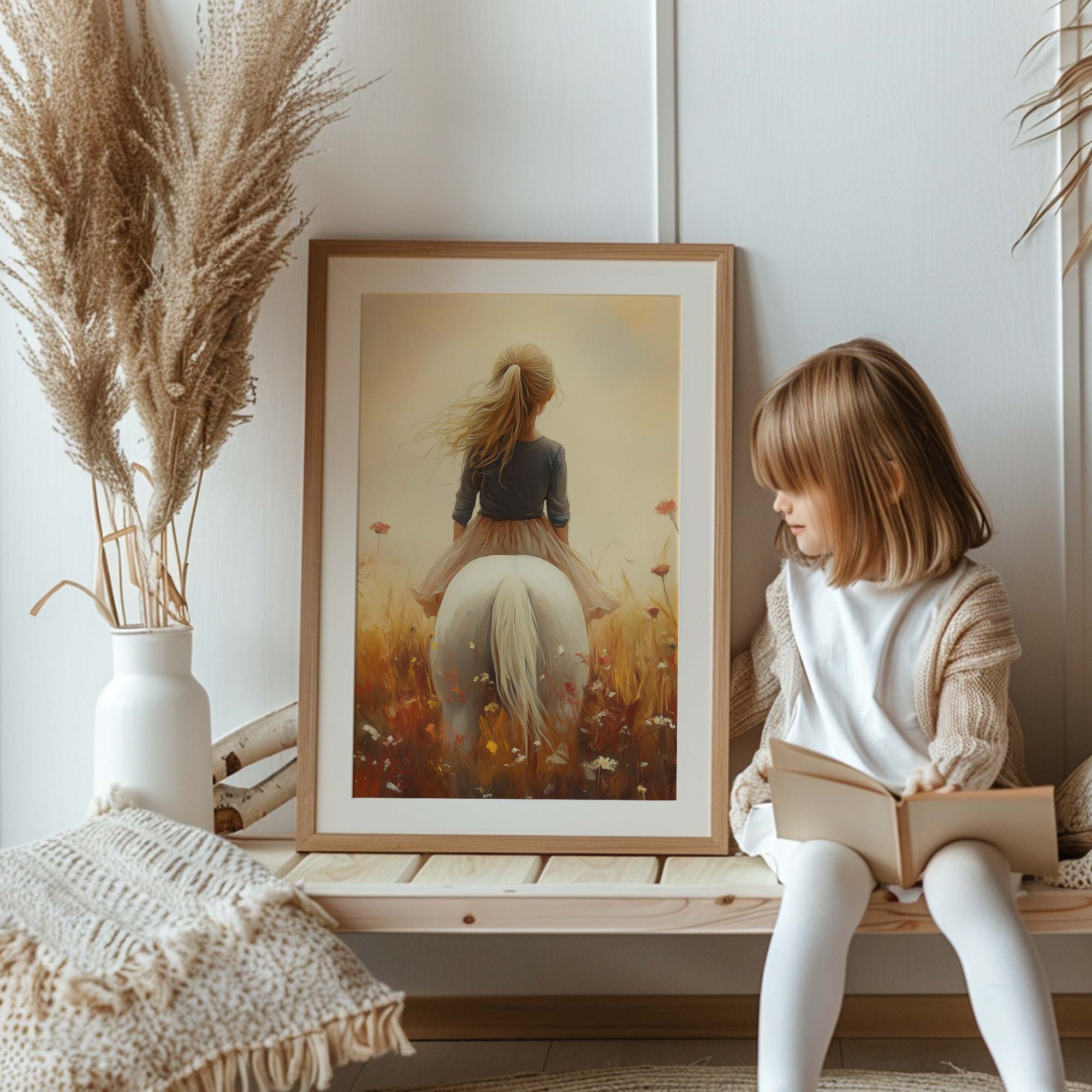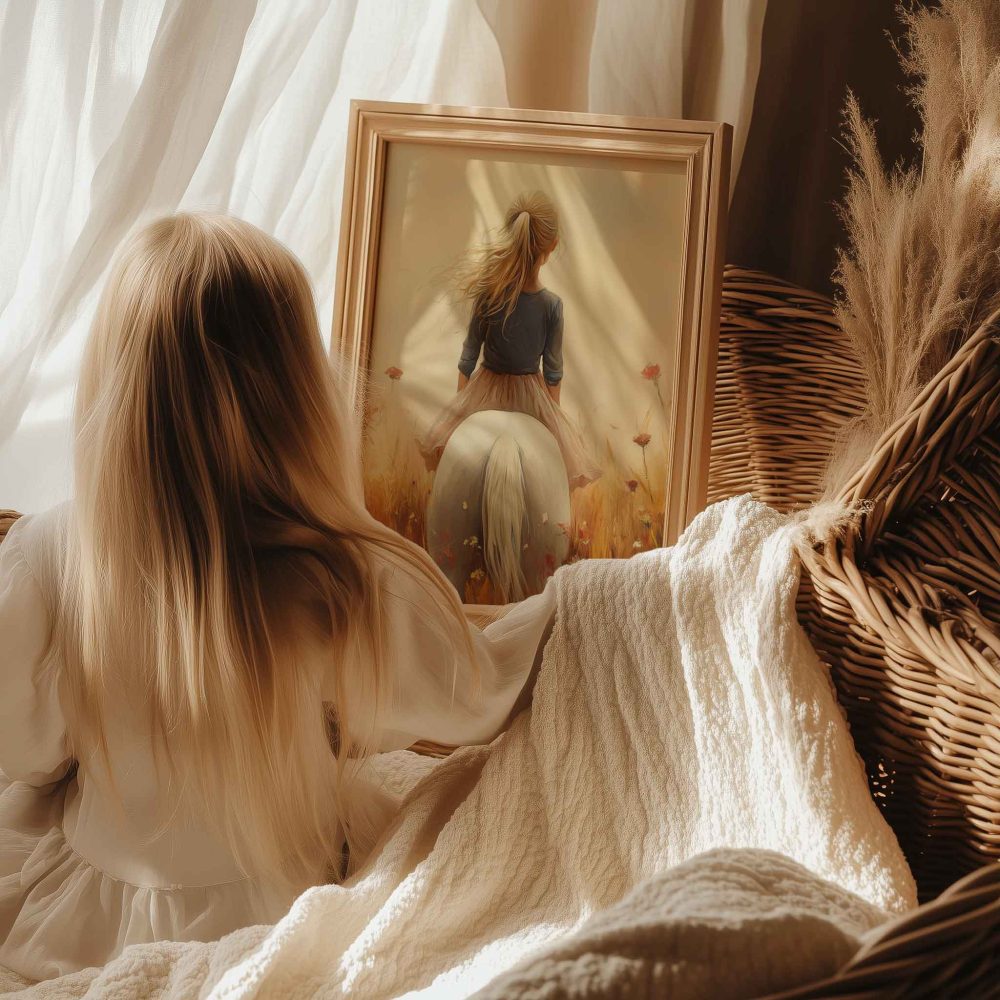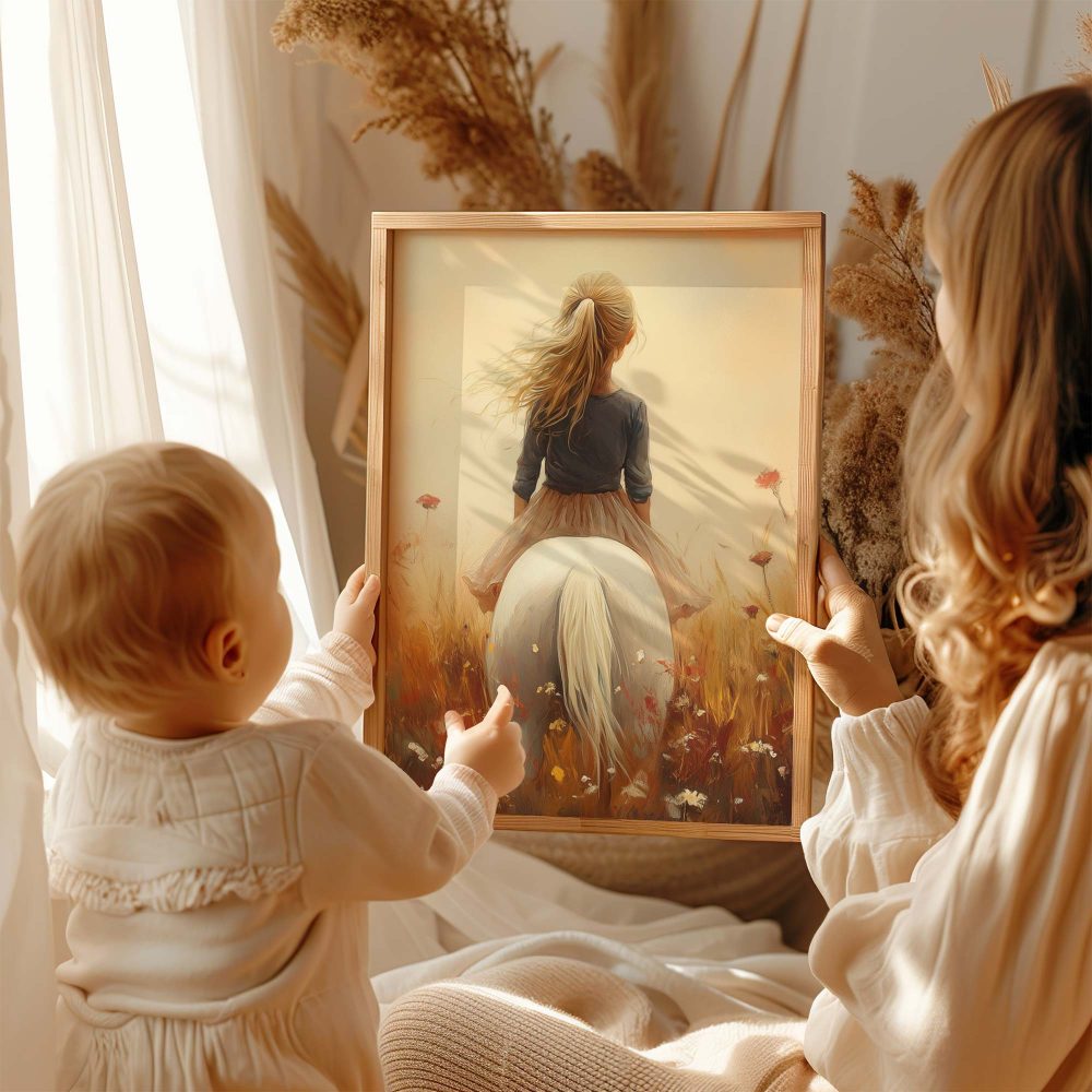 Terug naar collectie / Uncategorized / Zonnig Meisje op Wit Paard in Bloemenveld