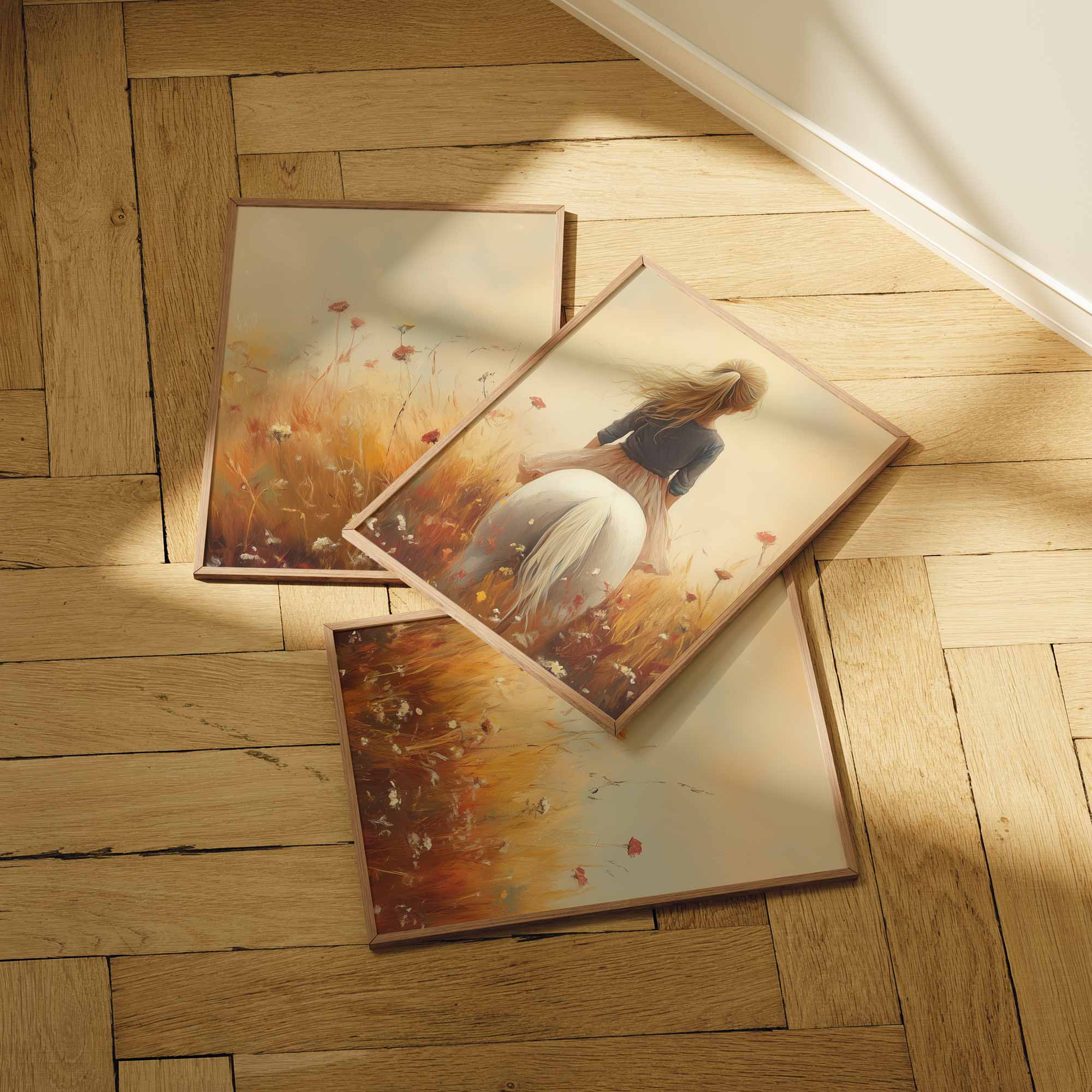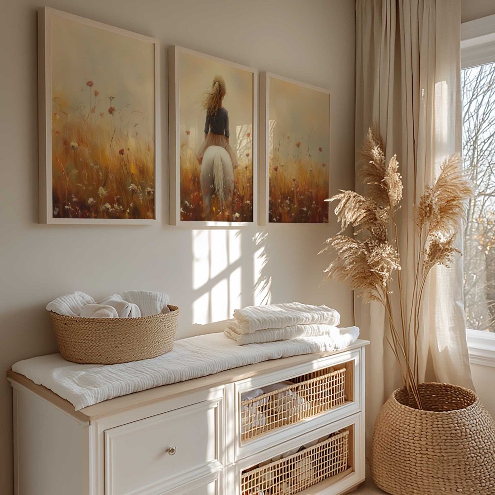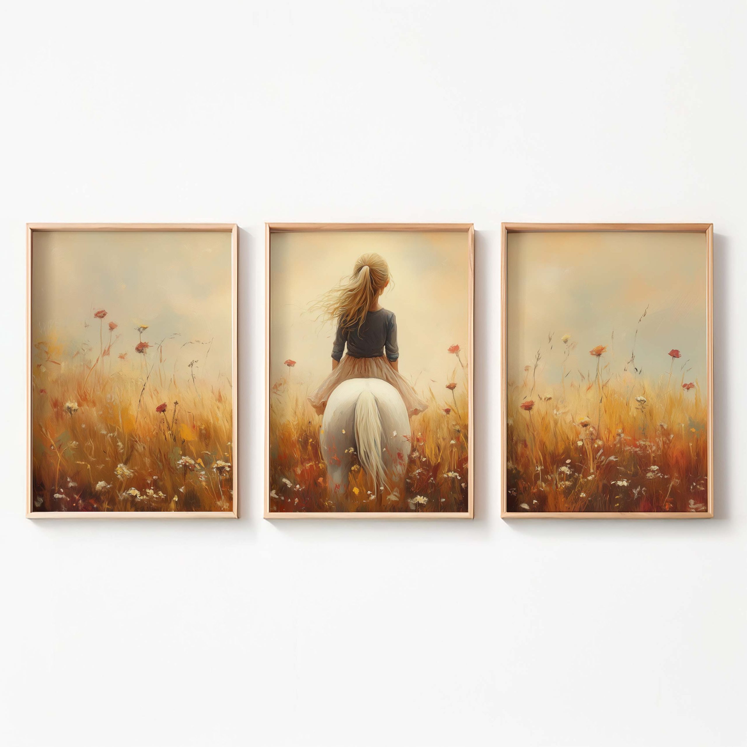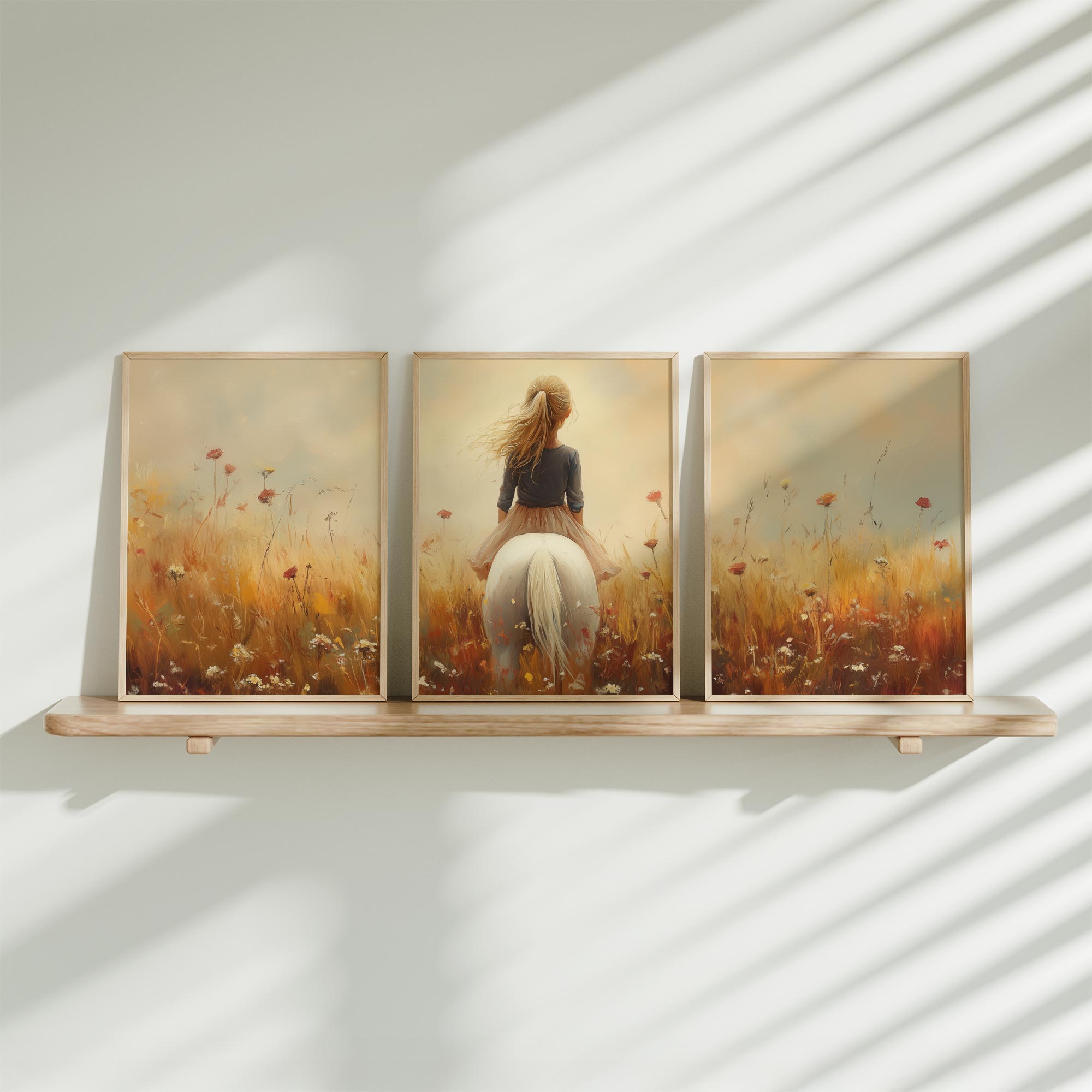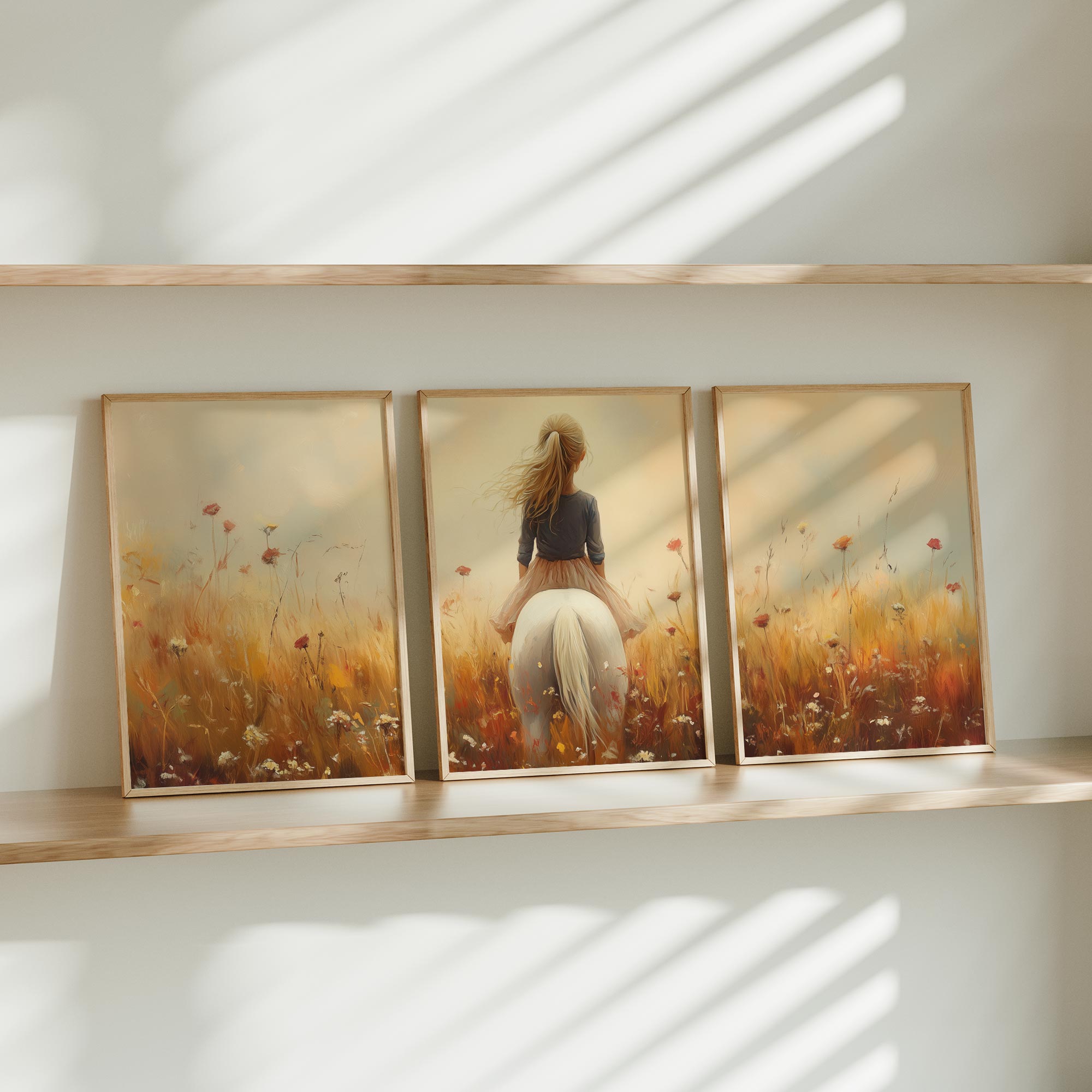 Terug naar collectie / Uncategorized / Zonnig Meisje op Wit Paard in Bloemenveld
