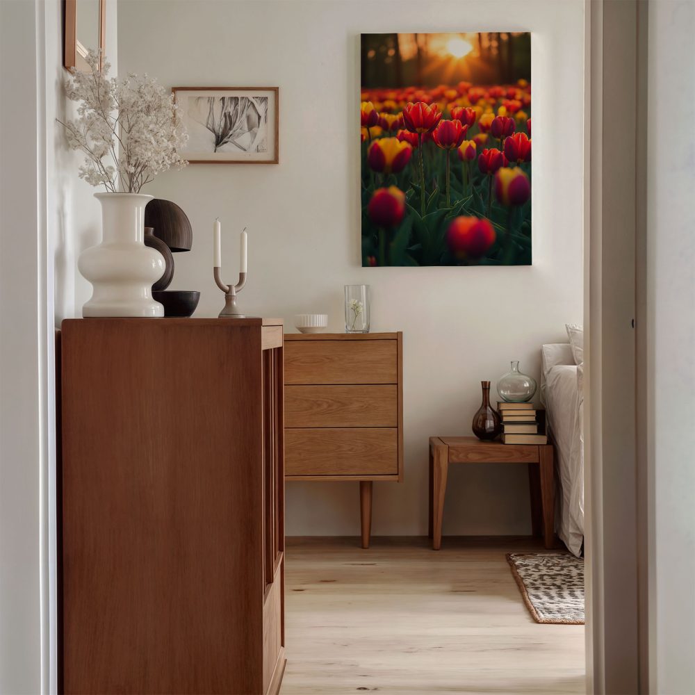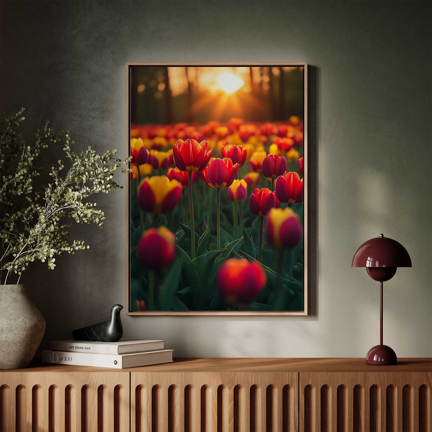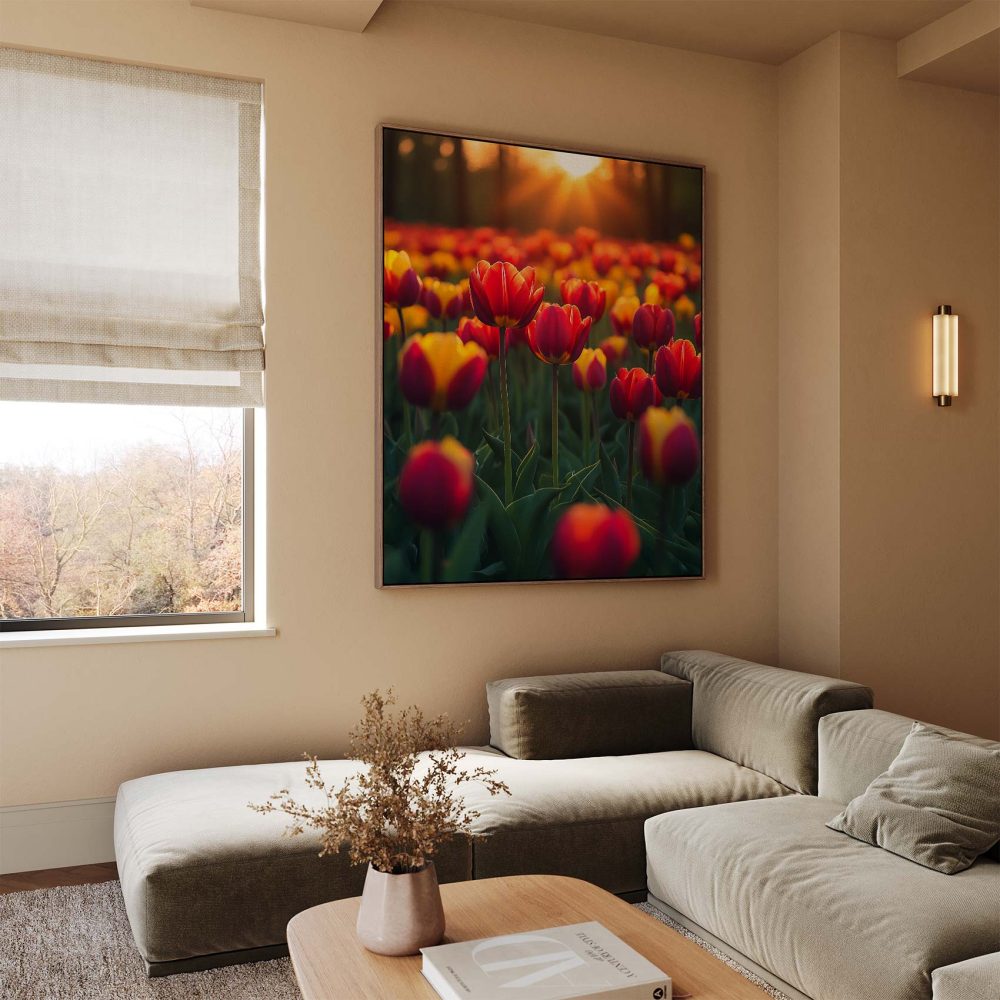 Terug naar collectie / Schilderijen / Bloemen Schilderij / Zonnig tulpenveld in bloei
