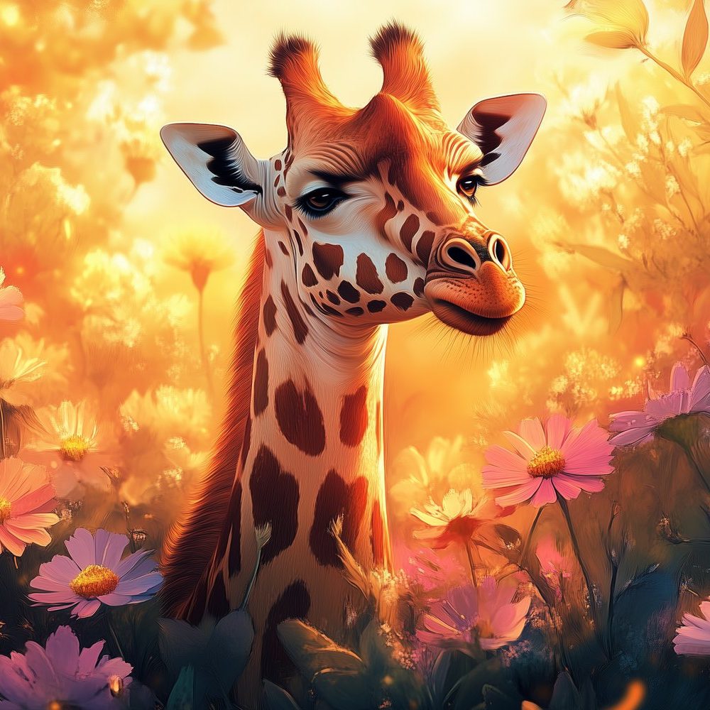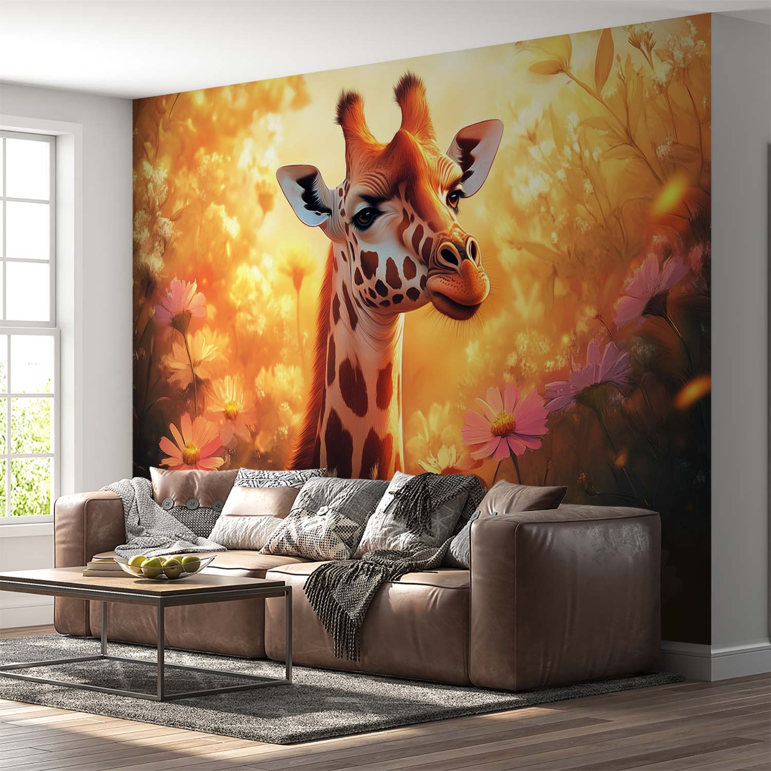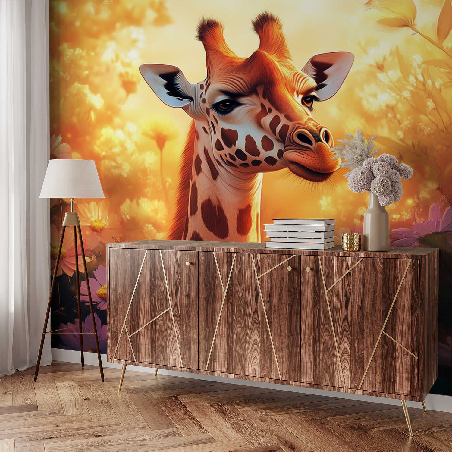 Terug naar collectie / Behang / Zonnige giraf tussen bloemen behang