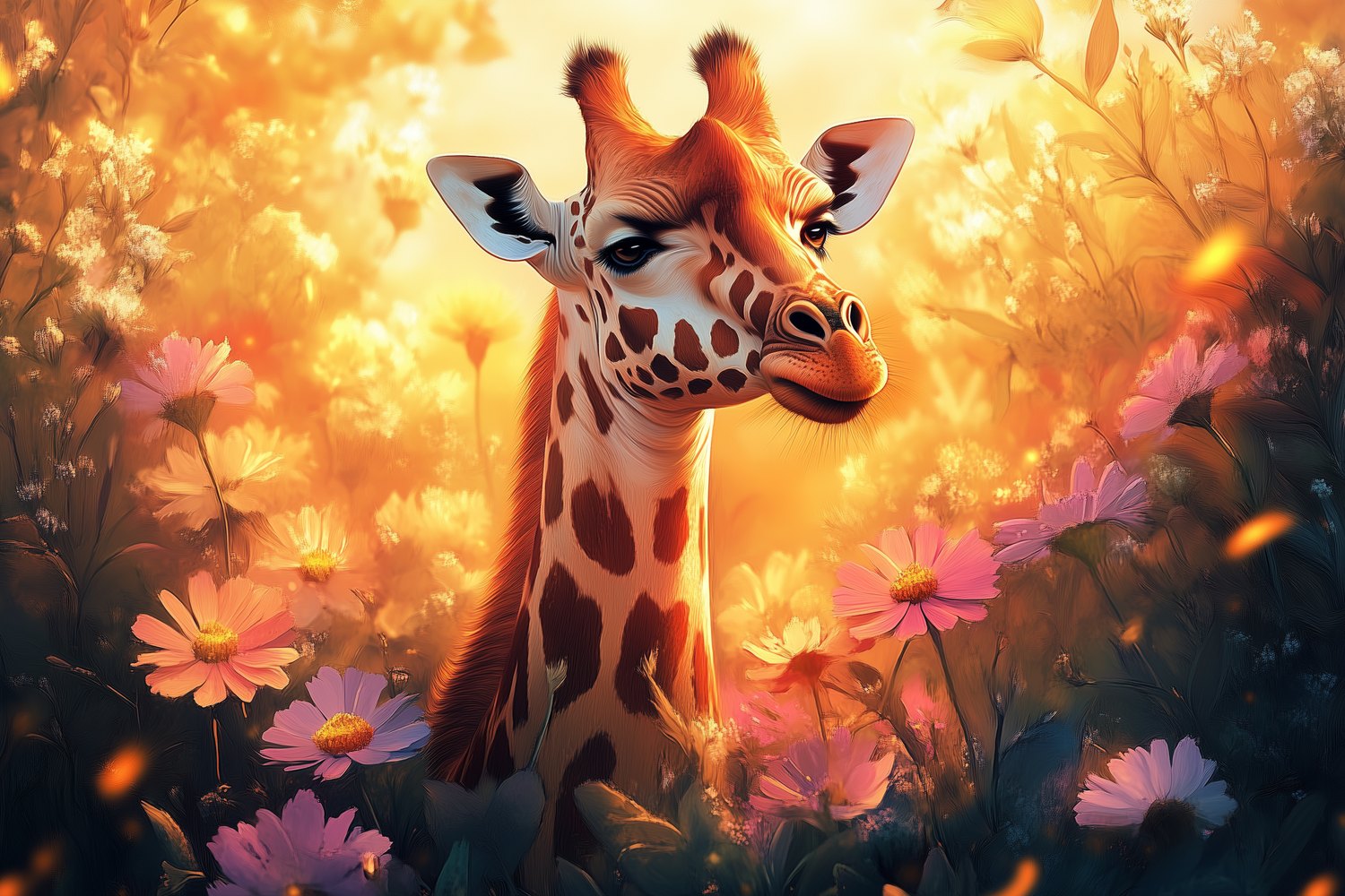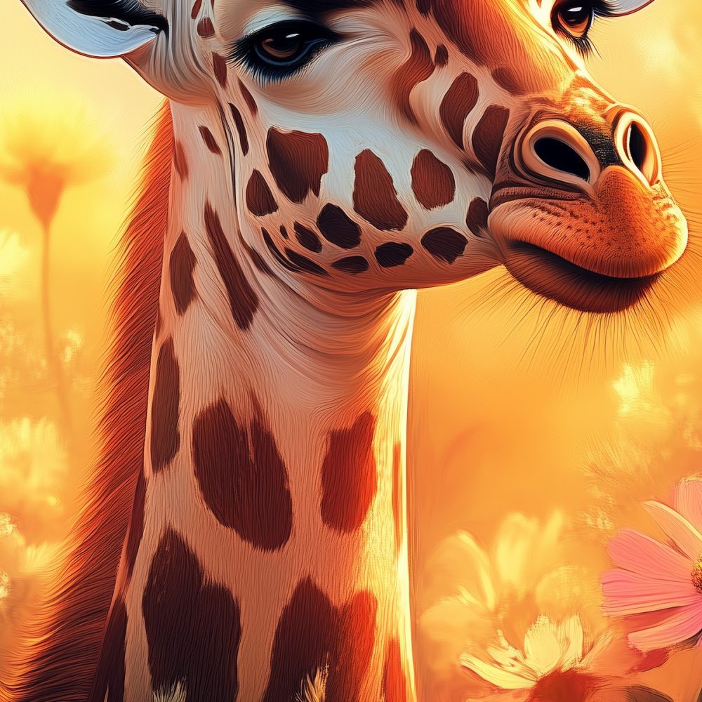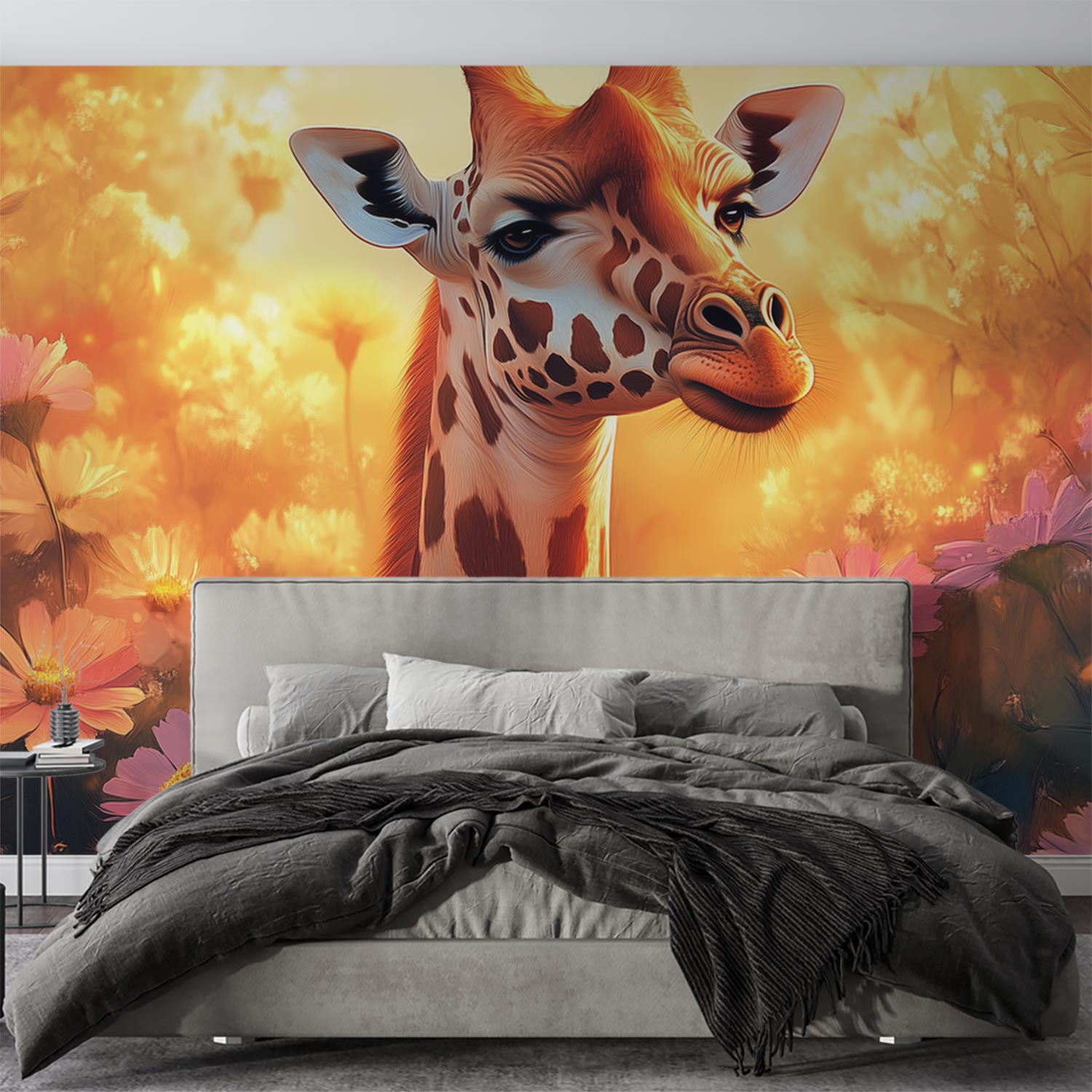 Terug naar collectie / Behang / Zonnige giraf tussen bloemen behang