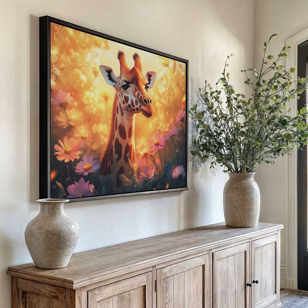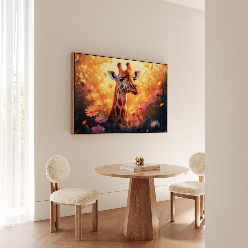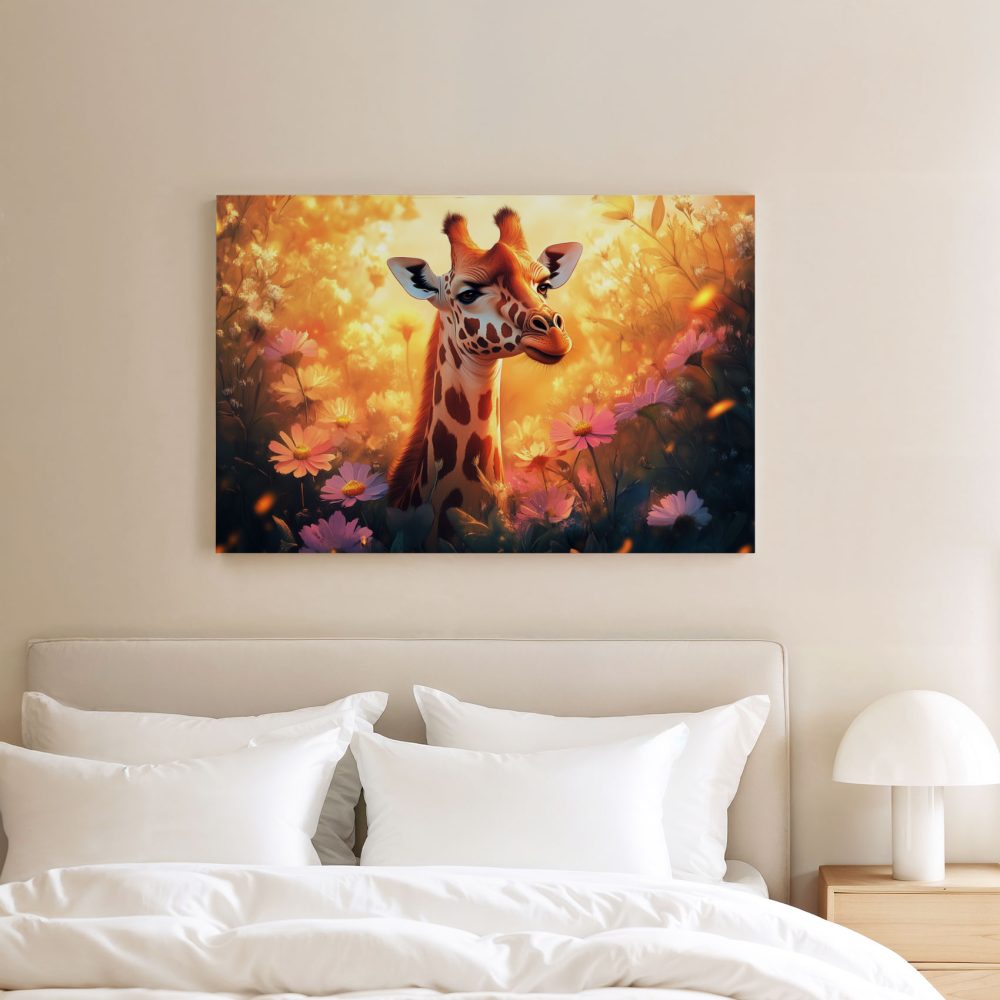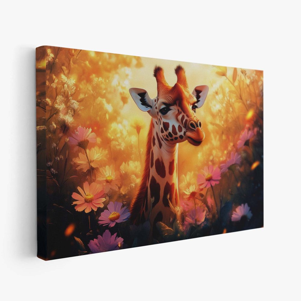 Terug naar collectie / Schilderijen / Bloemen Schilderij / Zonnige giraf tussen bloemen