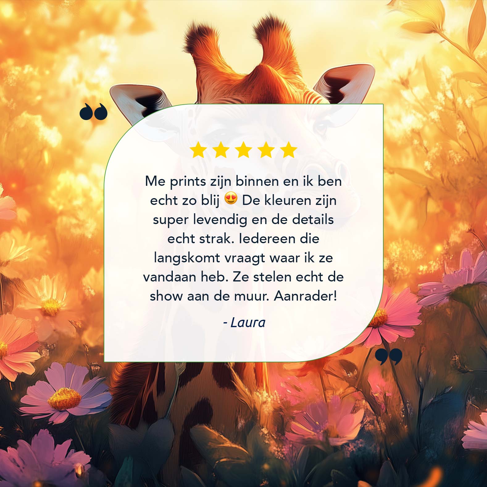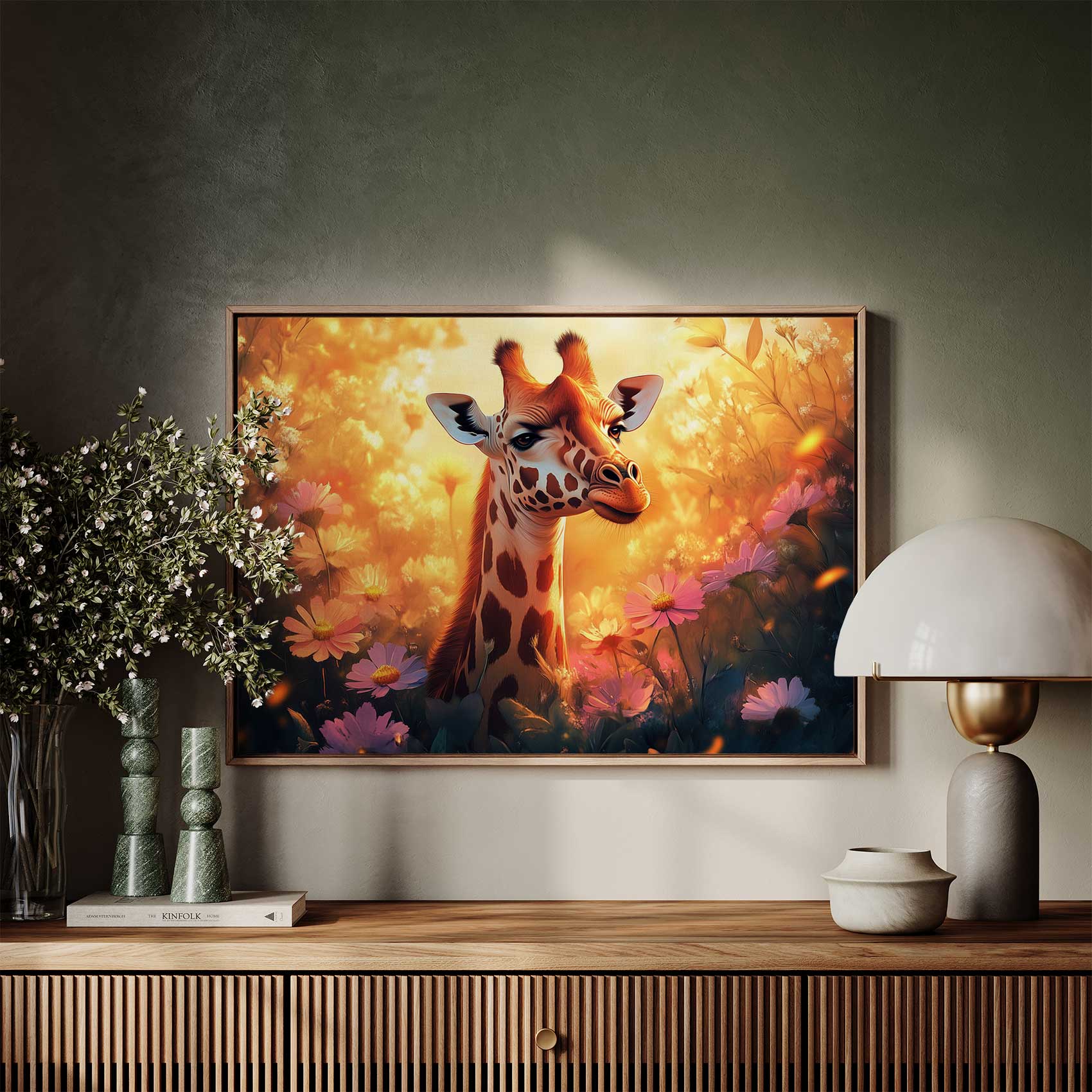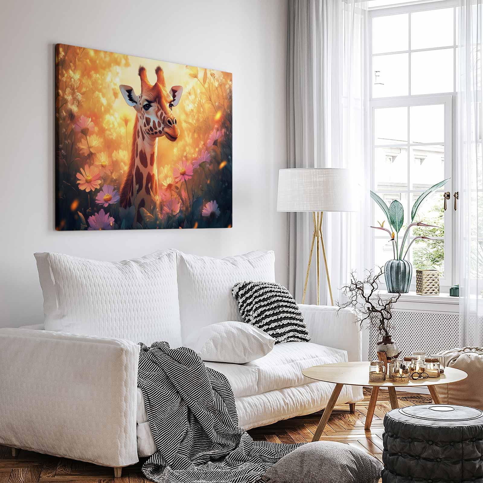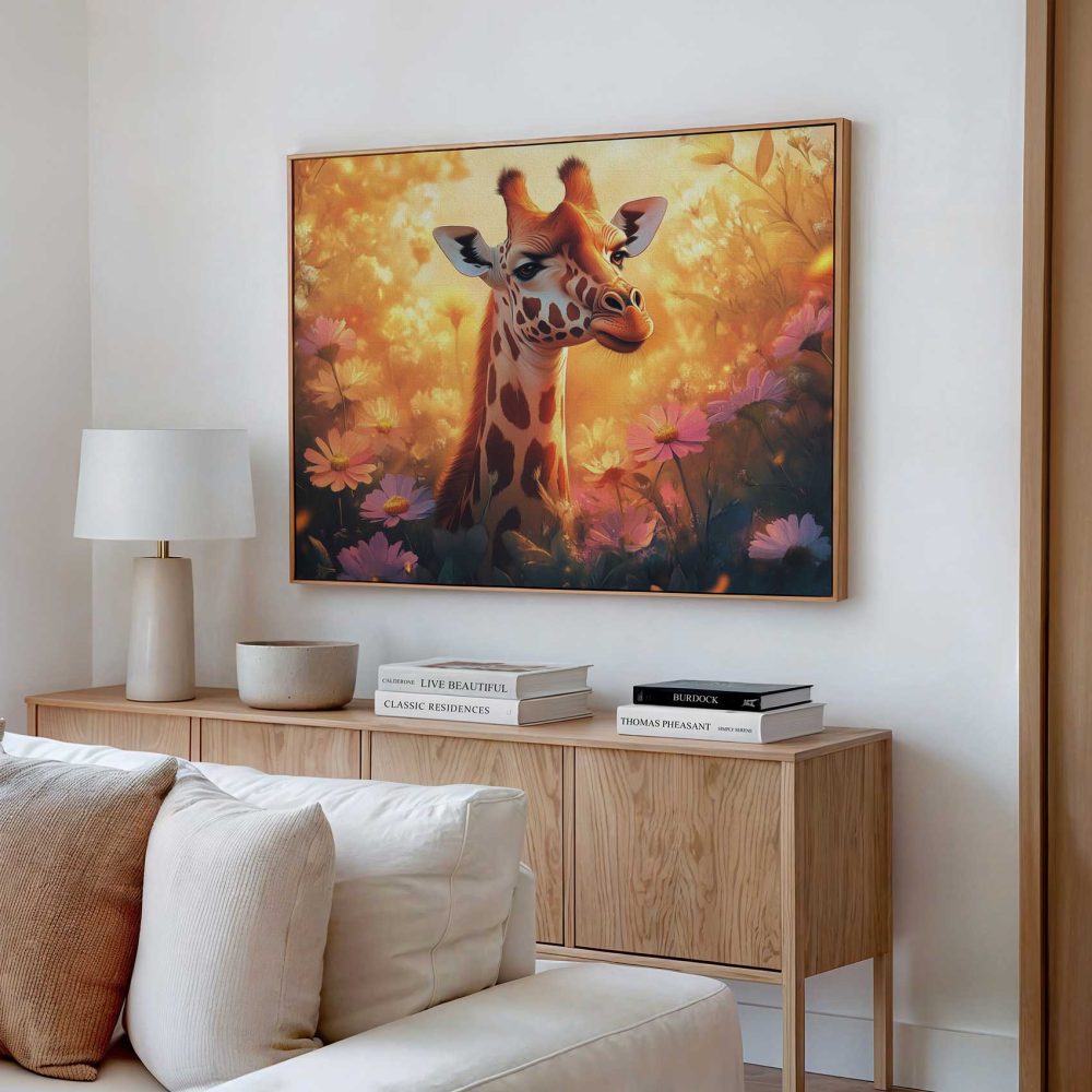 Terug naar collectie / Schilderijen / Bloemen Schilderij / Zonnige giraf tussen bloemen