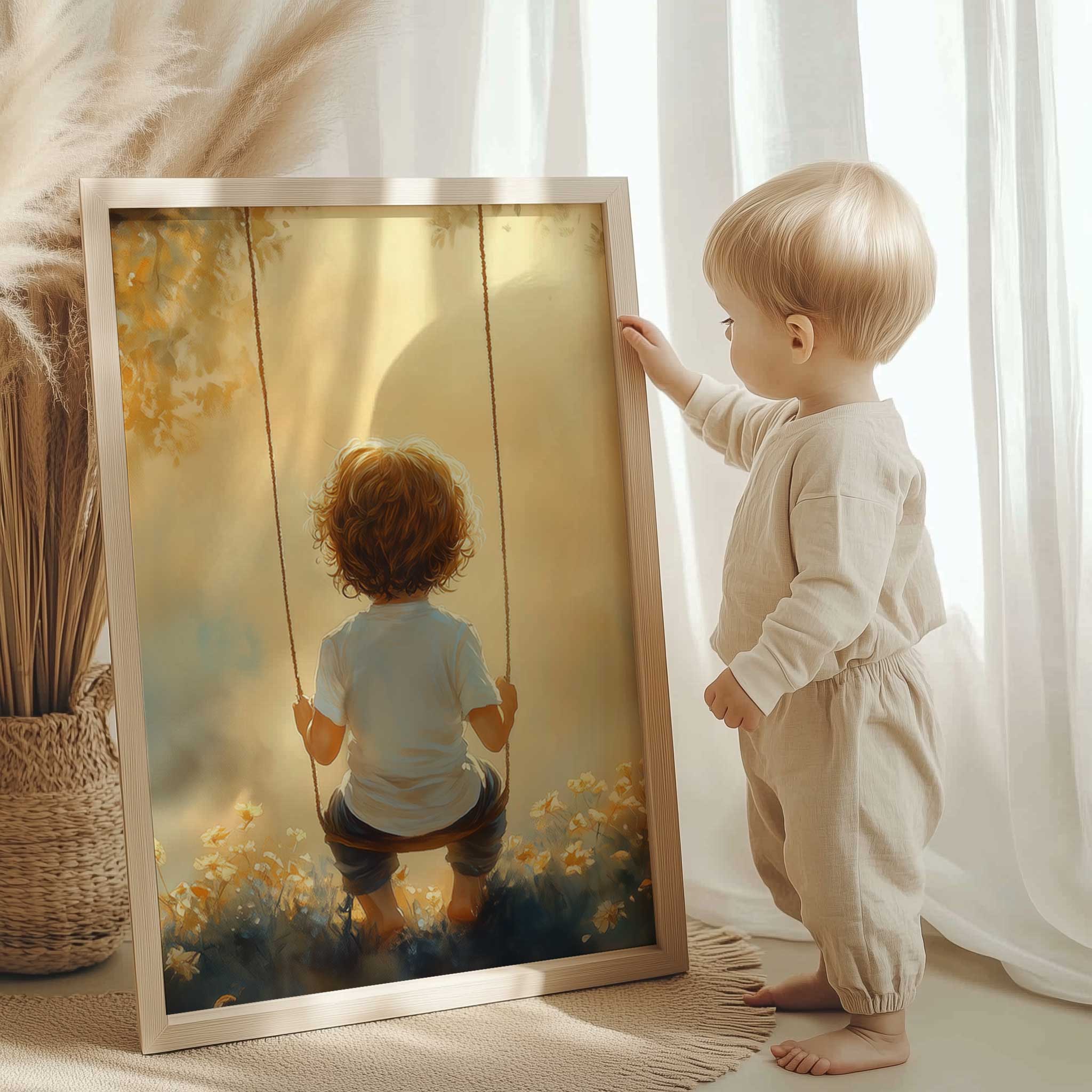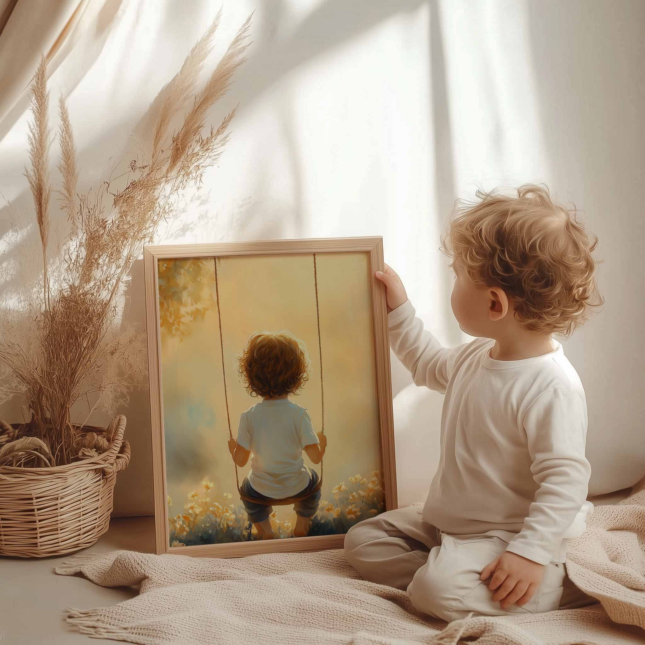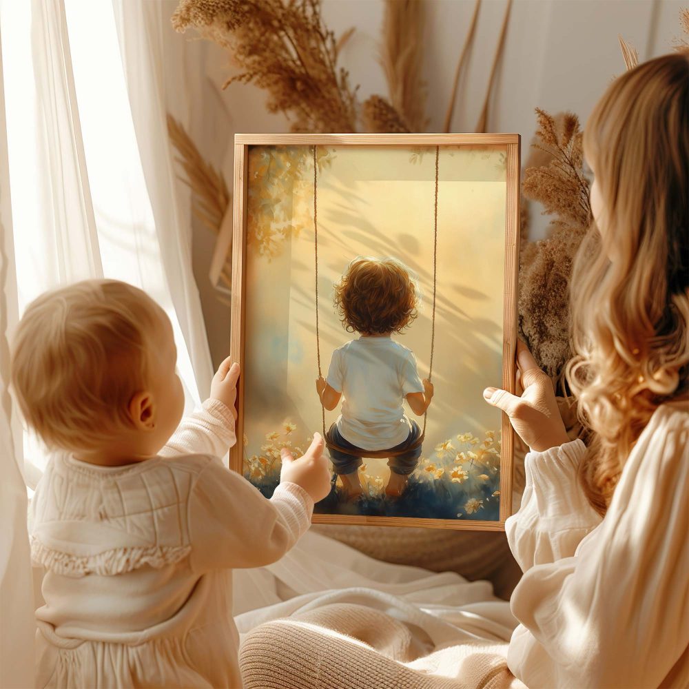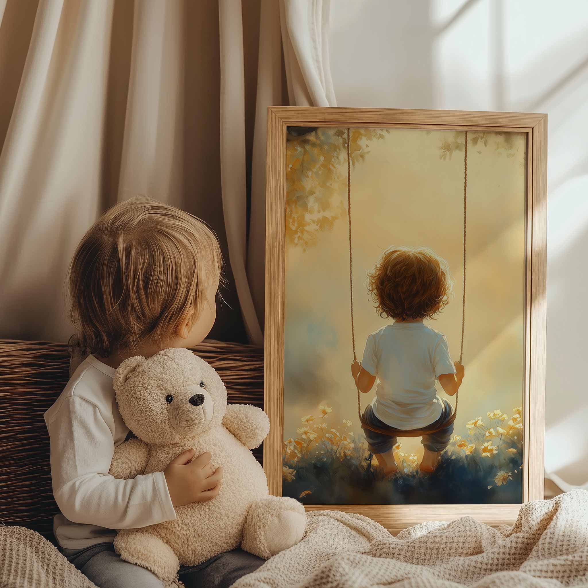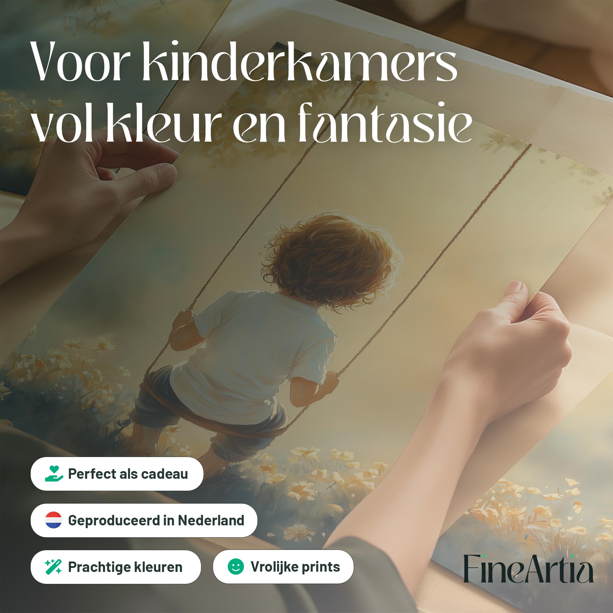 Terug naar collectie / Kinderkamer posters / Bloemen posters / Zonnige schommel in een bloemenveld